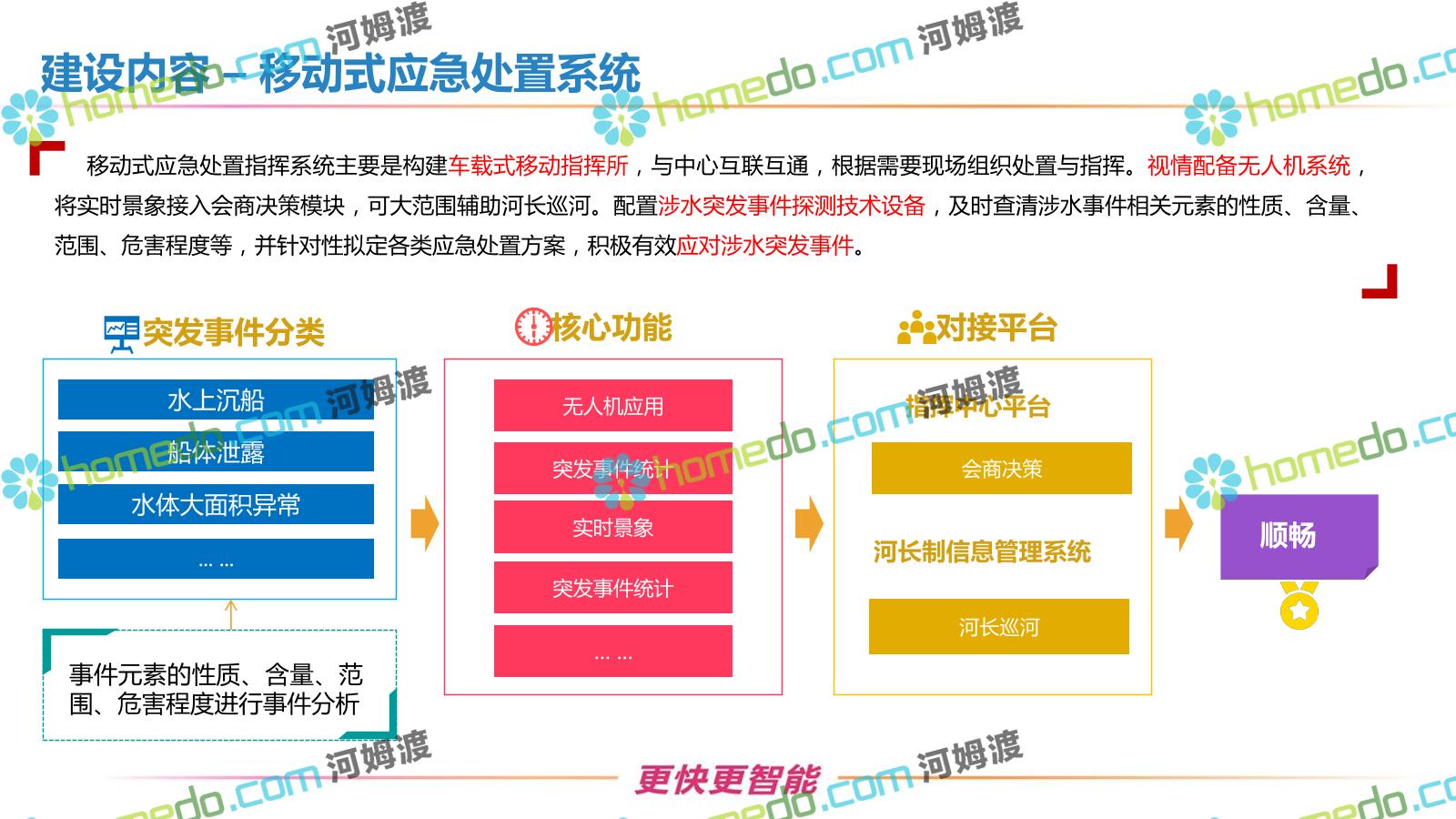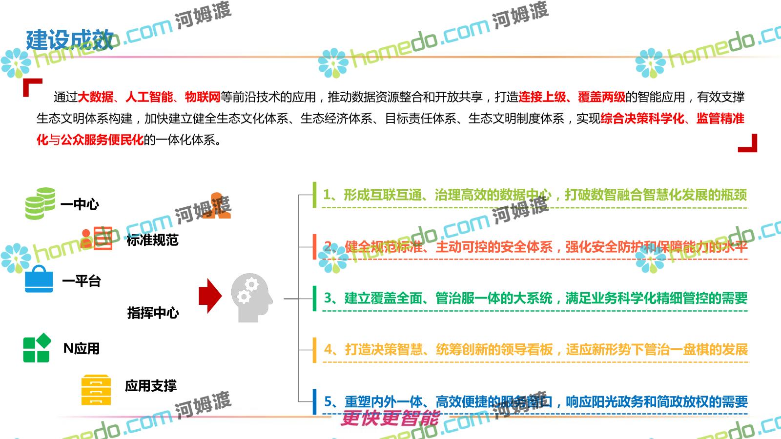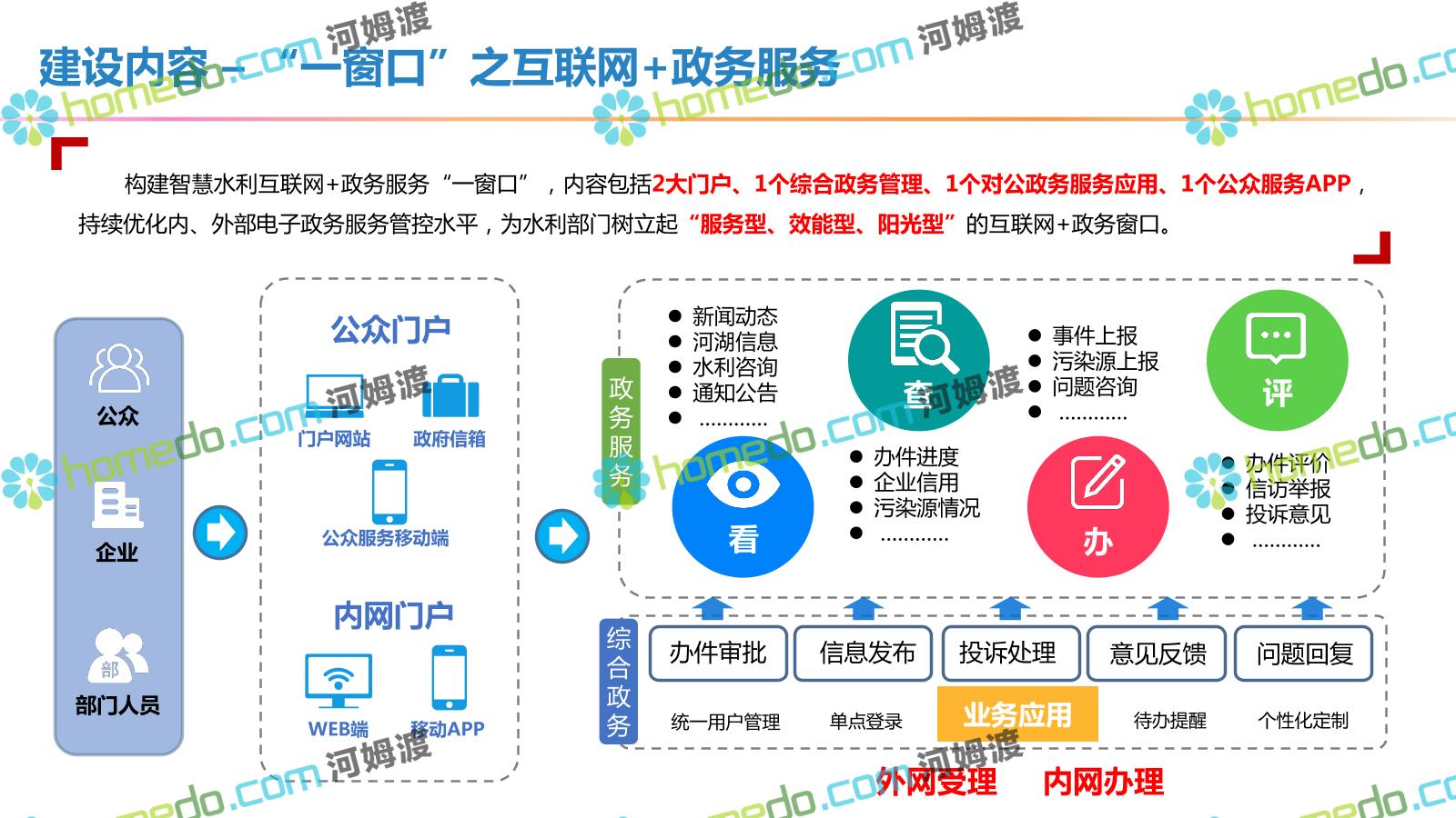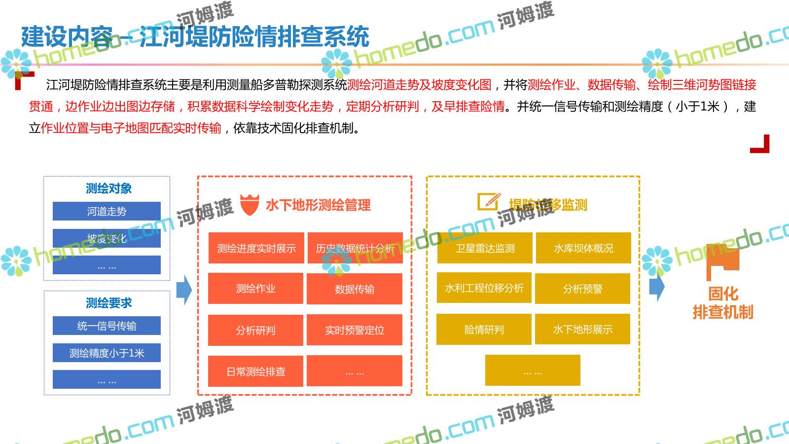 方案简介 按照“建管并举”思路,围绕“智慧水利”构想,以信息化手段为支撑,将水利领域各类设施功能、各种管理手段、各项建设目标有机整合,统筹构建以信息网络为脉络,链接水利领域的各类设施、各个节点、各种要素,融合各条通道、各类信号、各种数据,形成条口贯通、条块互联、信息互通,打造一个集“感知、预警、决策、处置”为一体的信息化管理与指挥网络,并以此建设常态化值守的水利指挥调度中心,实现水利领域“实时监管、科学预测、精准控制、高效处置”的现代化建设目标,全面提升水利工作在经济建设、社会管理、生态文明等各领域的服务保障能力。