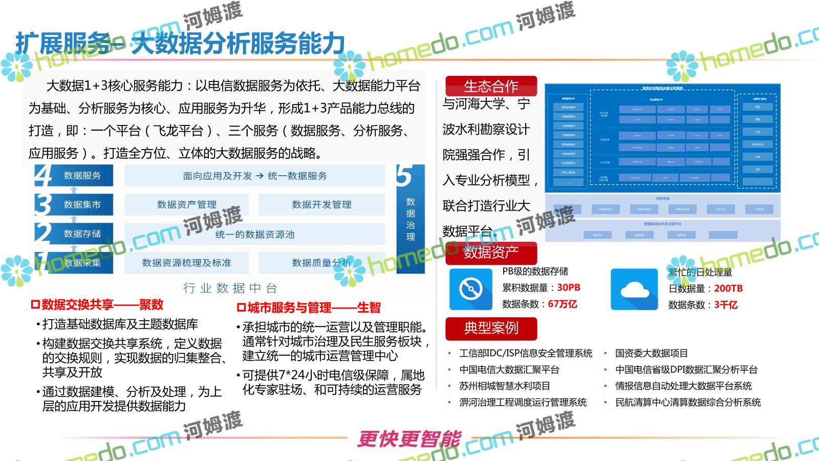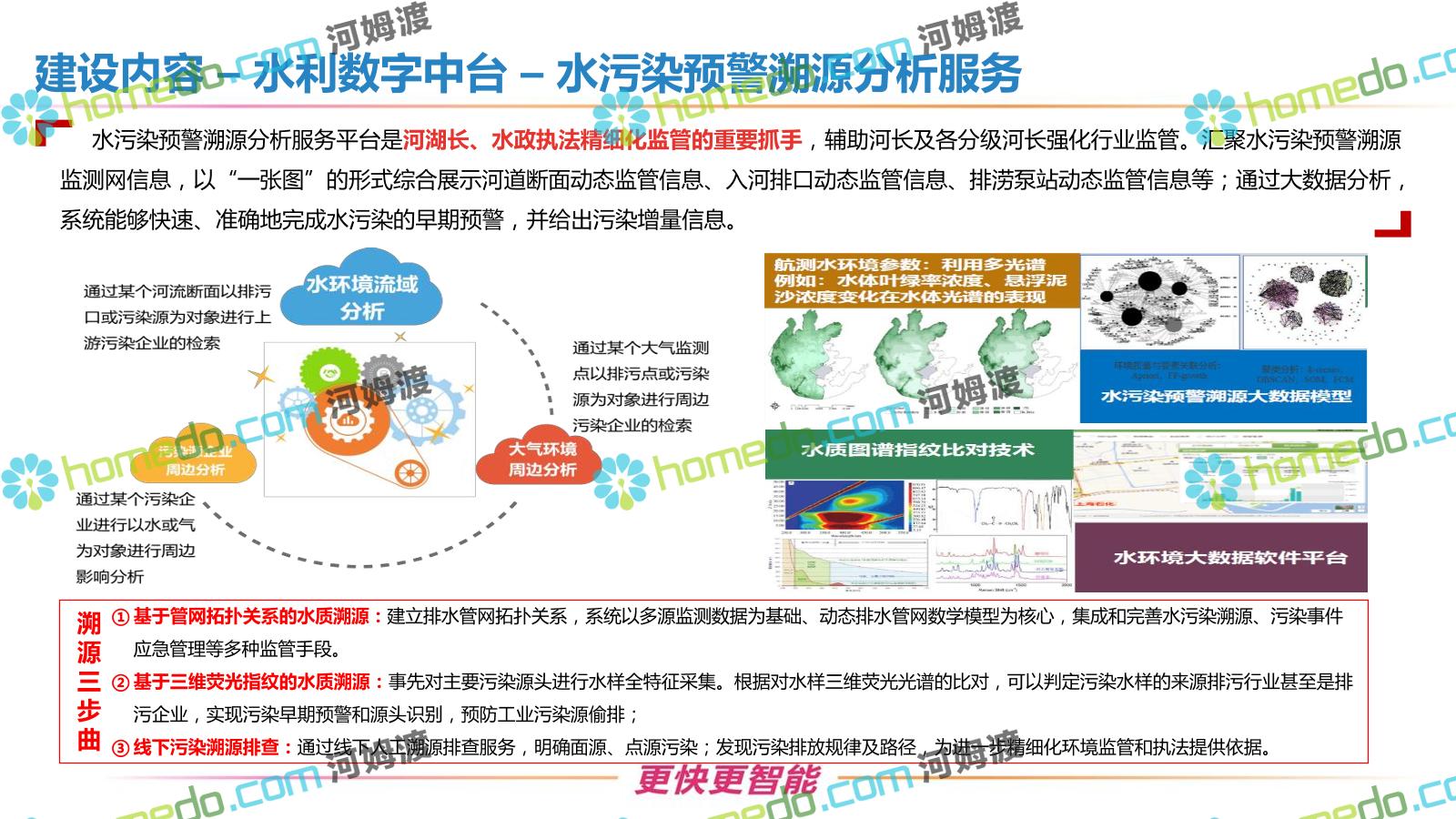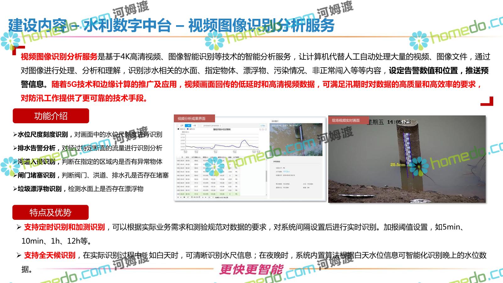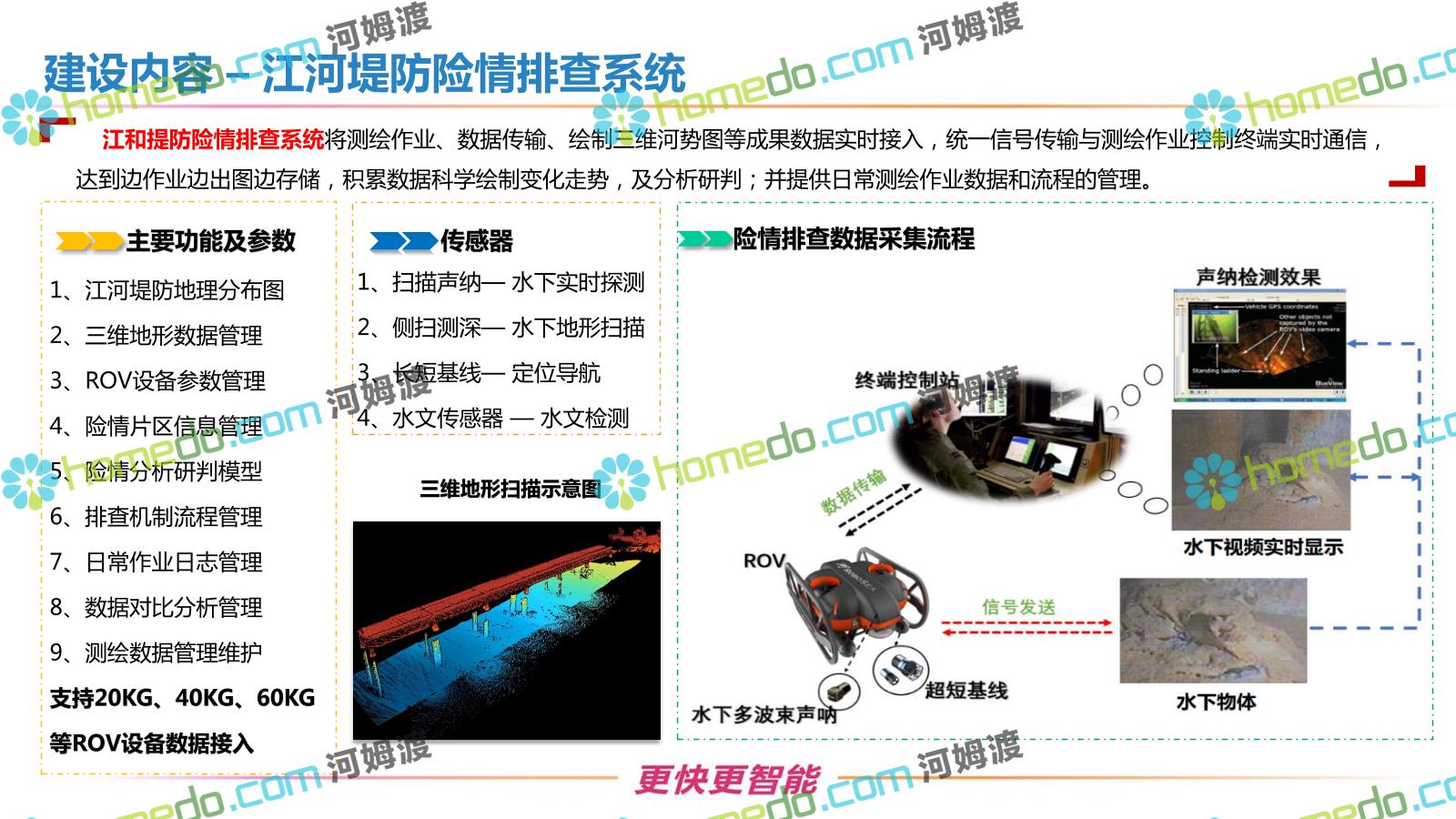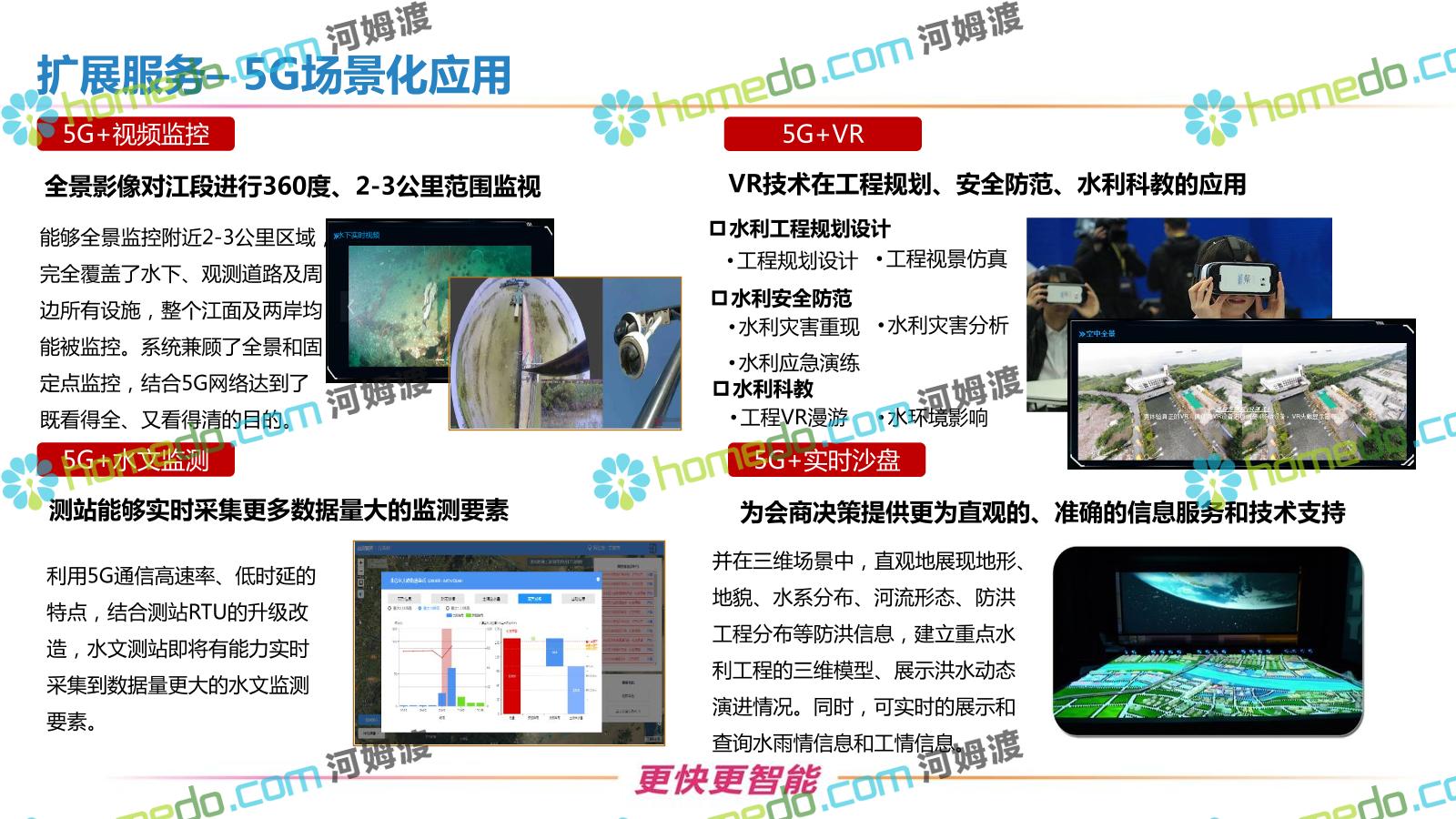 方案简介 按照“建管并举”思路,围绕“智慧水利”构想,以信息化手段为支撑,将水利领域各类设施功能、各种管理手段、各项建设目标有机整合,统筹构建以信息网络为脉络,链接水利领域的各类设施、各个节点、各种要素,融合各条通道、各类信号、各种数据,形成条口贯通、条块互联、信息互通,打造一个集“感知、预警、决策、处置”为一体的信息化管理与指挥网络,并以此建设常态化值守的水利指挥调度中心,实现水利领域“实时监管、科学预测、精准控制、高效处置”的现代化建设目标,全面提升水利工作在经济建设、社会管理、生态文明等各领域的服务保障能力。