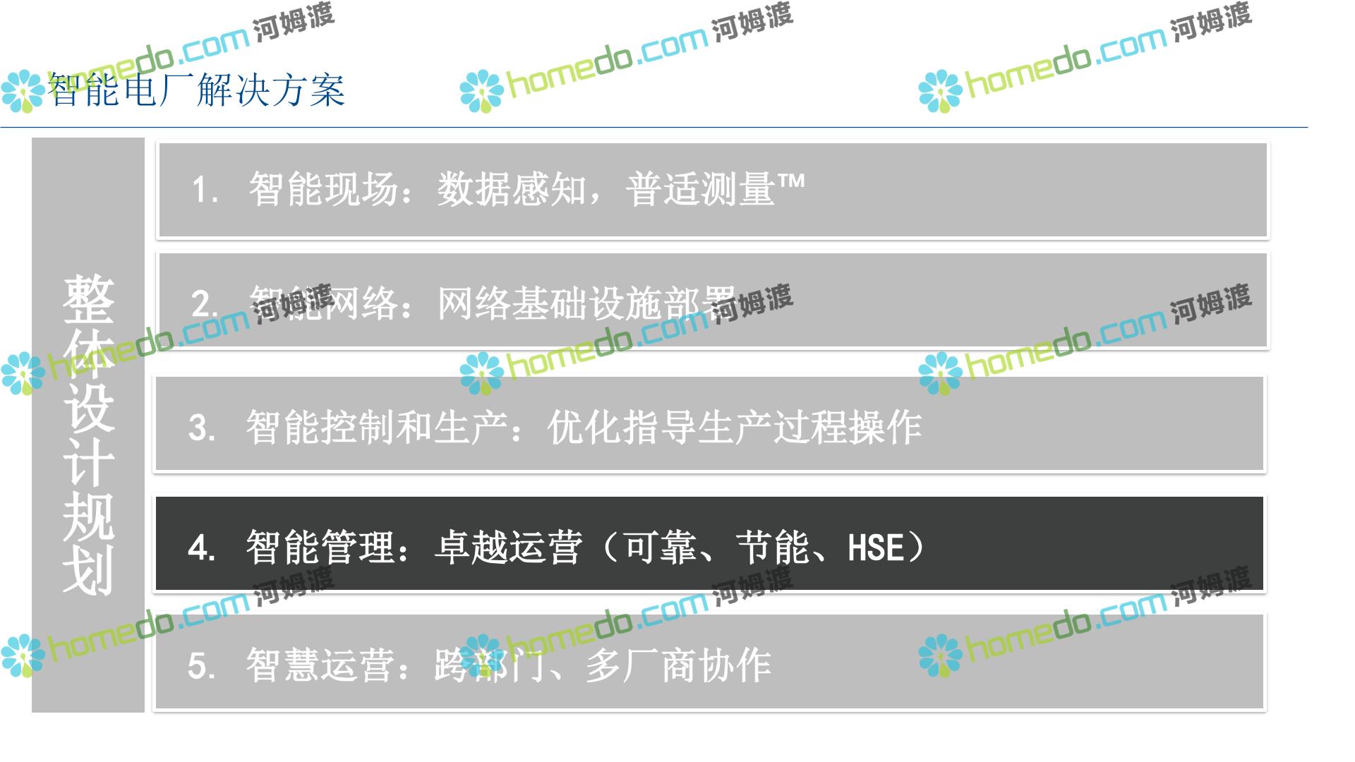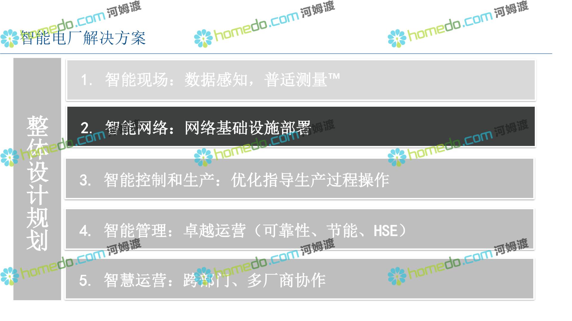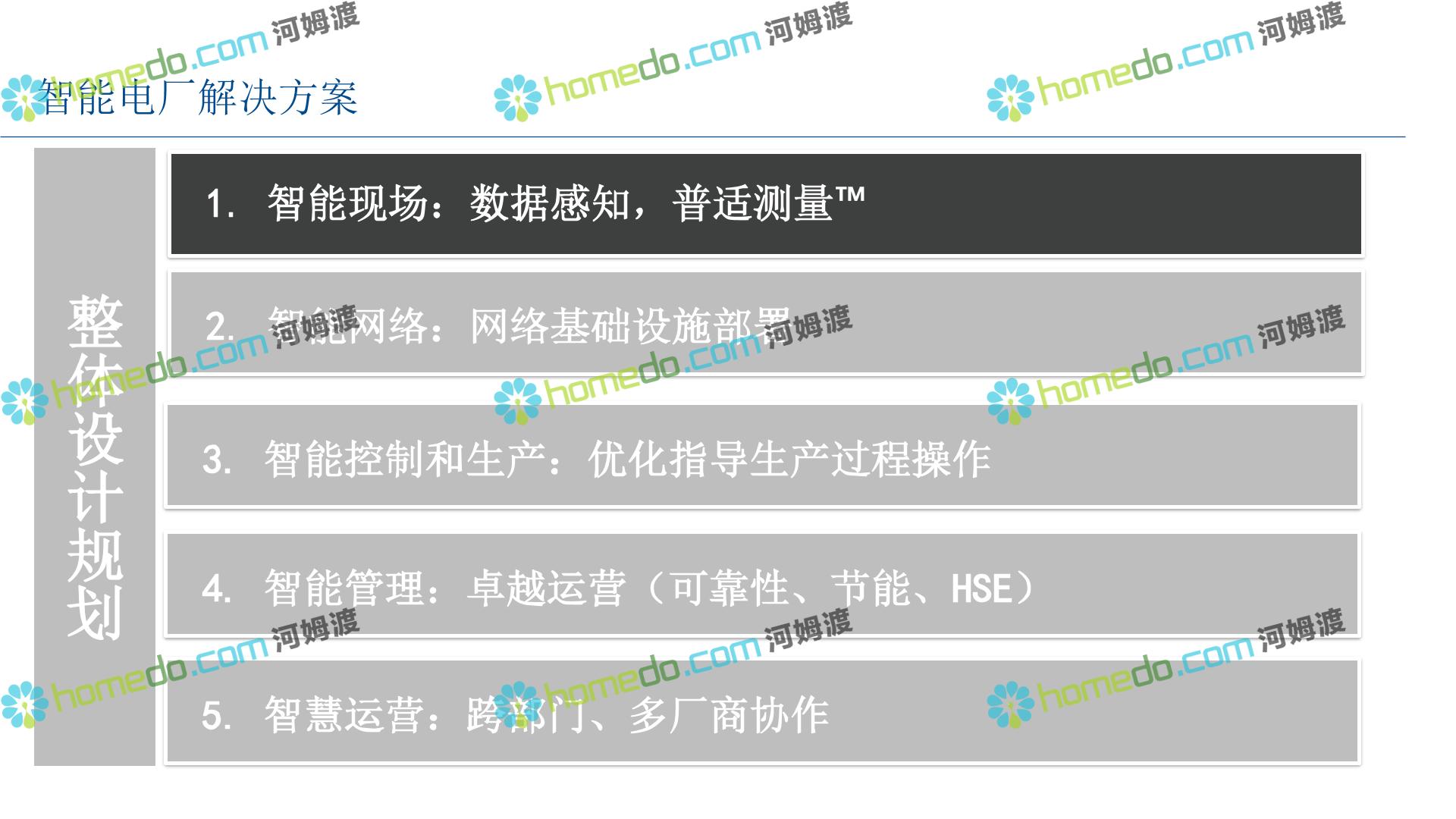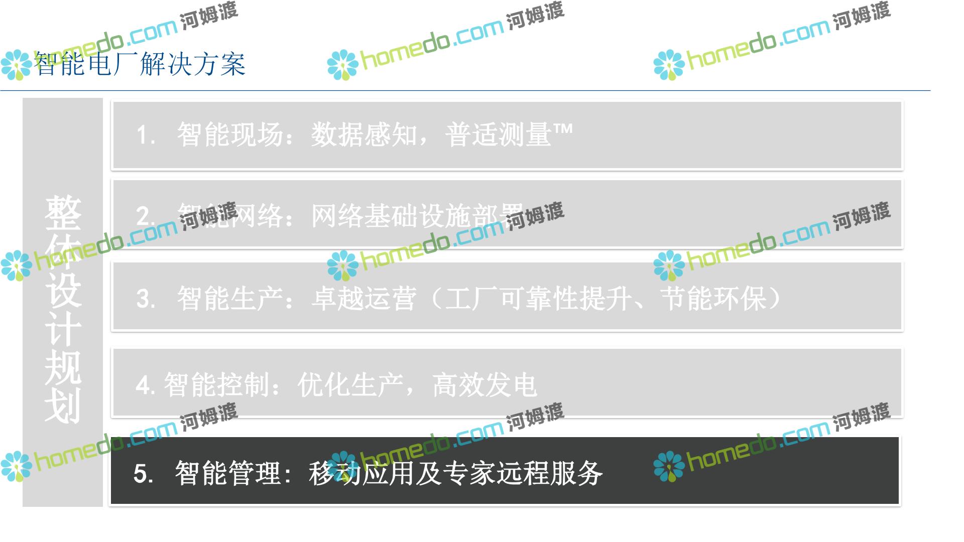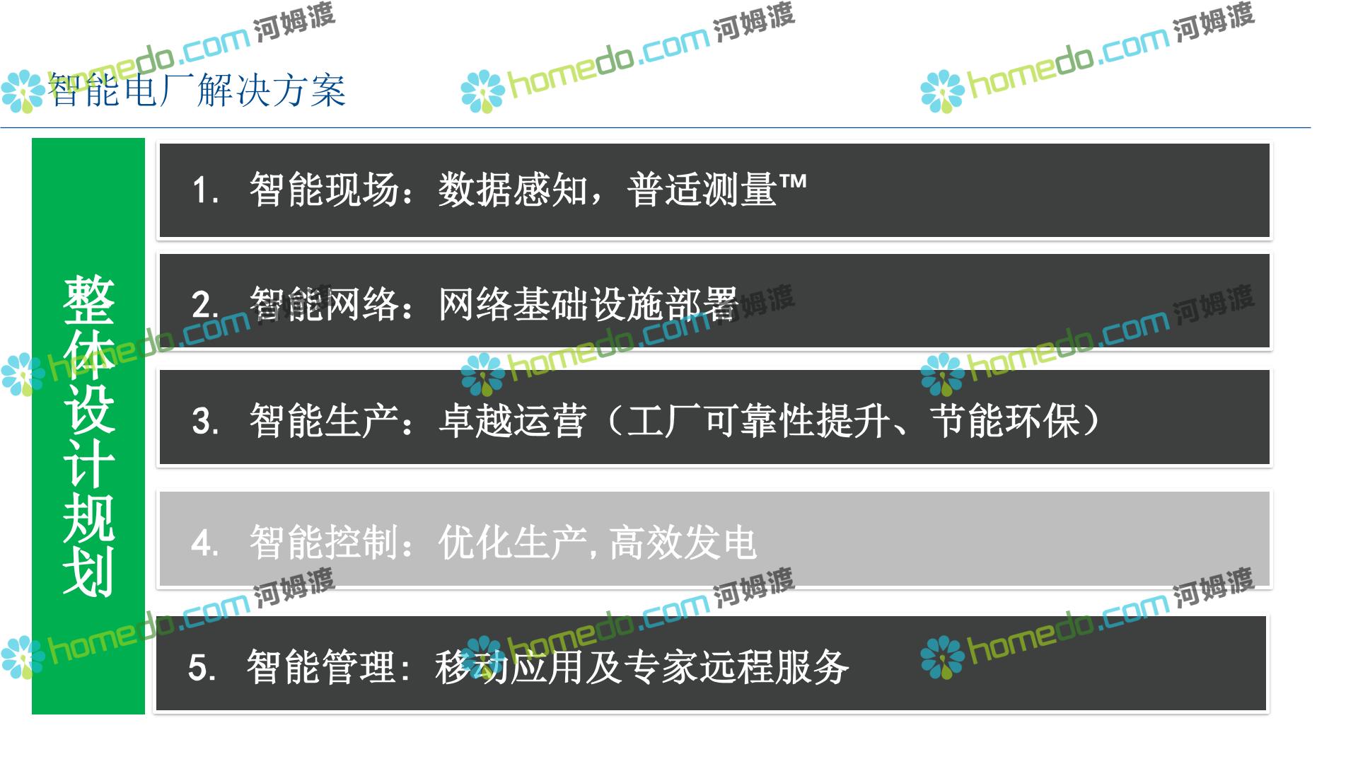 方案简介 整 体 设 计 规 划 1.智能现场:数据感知,普适测量 2.智能网络:网络基础设施部署 3.智能生产:卓越运营(工厂可靠性提升、节能环保) 4.智能控制:优化生产,高效发电 5.智能管理:移动应用及专家远程服务