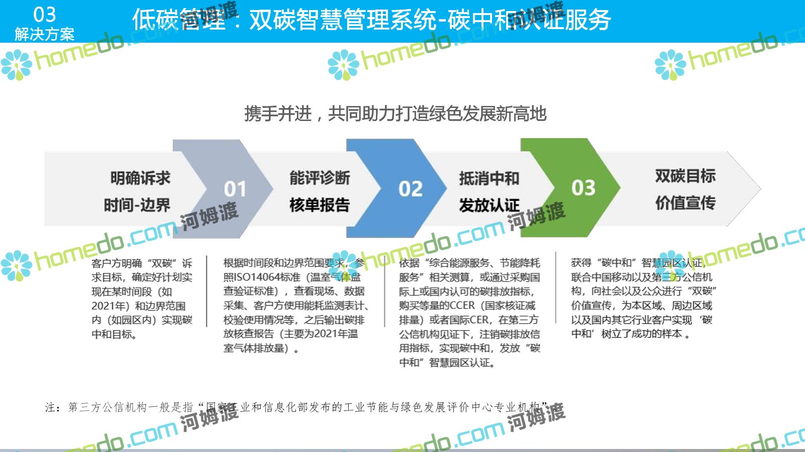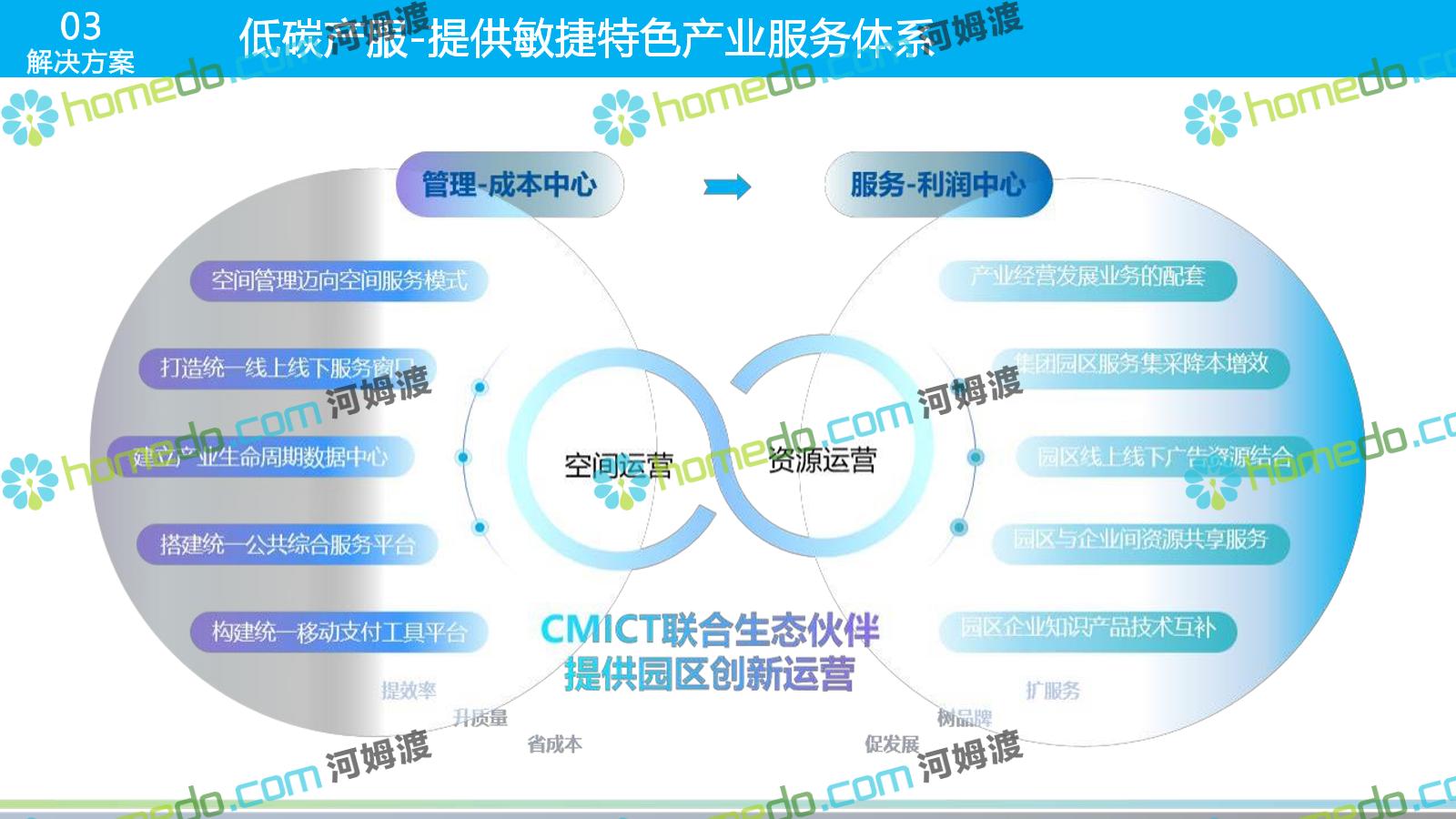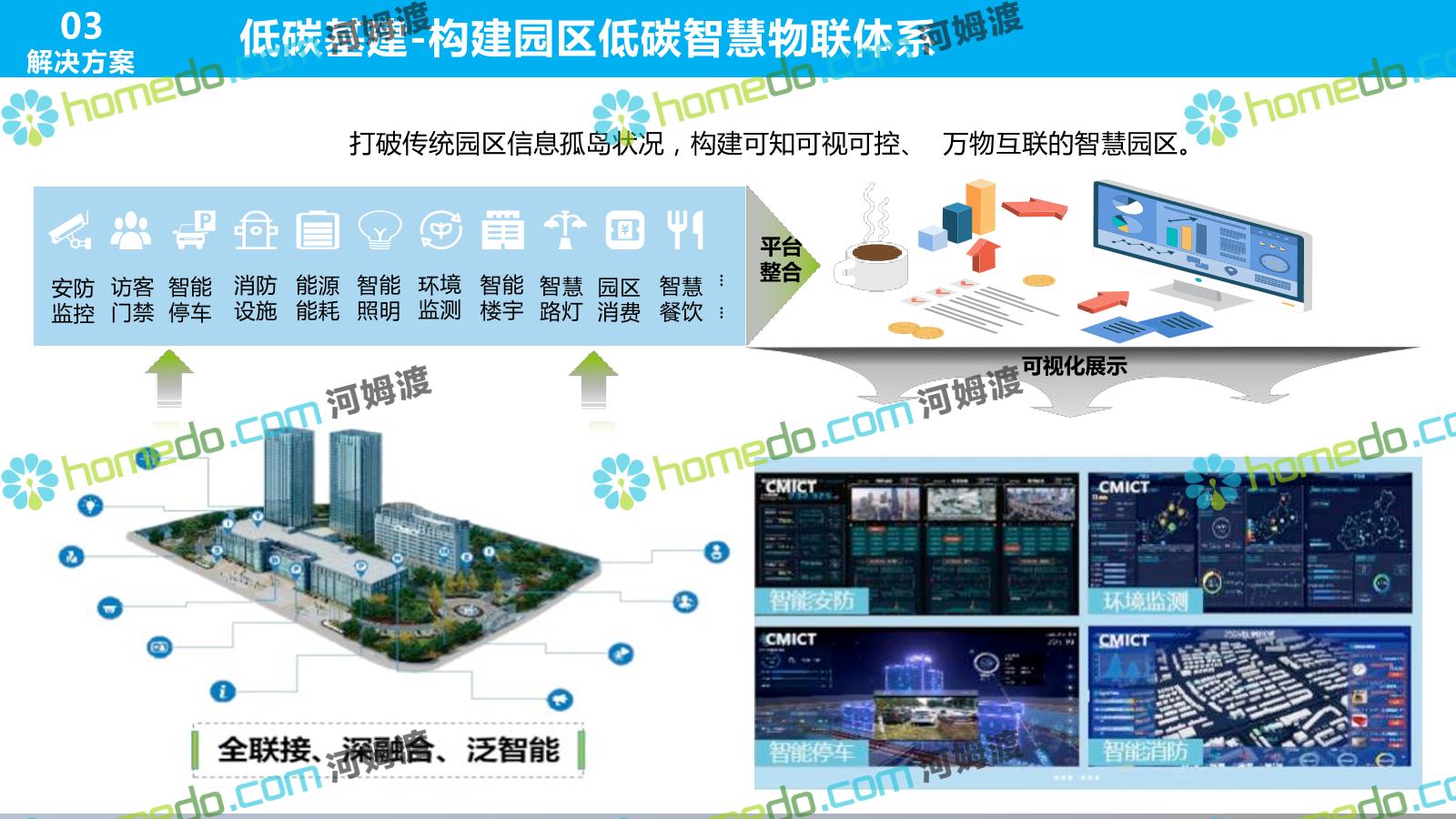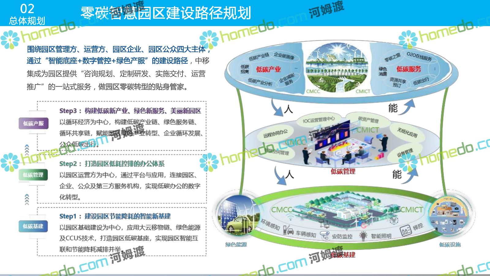 方案简介 围绕园区管理方、运营方、园区企业、园区公众四大主体,通过“智能底座+数字管控+绿色产服”的建设路径,中移 集成为园区提供“咨询规划、定制研发、实施交付、运营 推广”的一站式服务,做园区零碳转型的贴身管家。