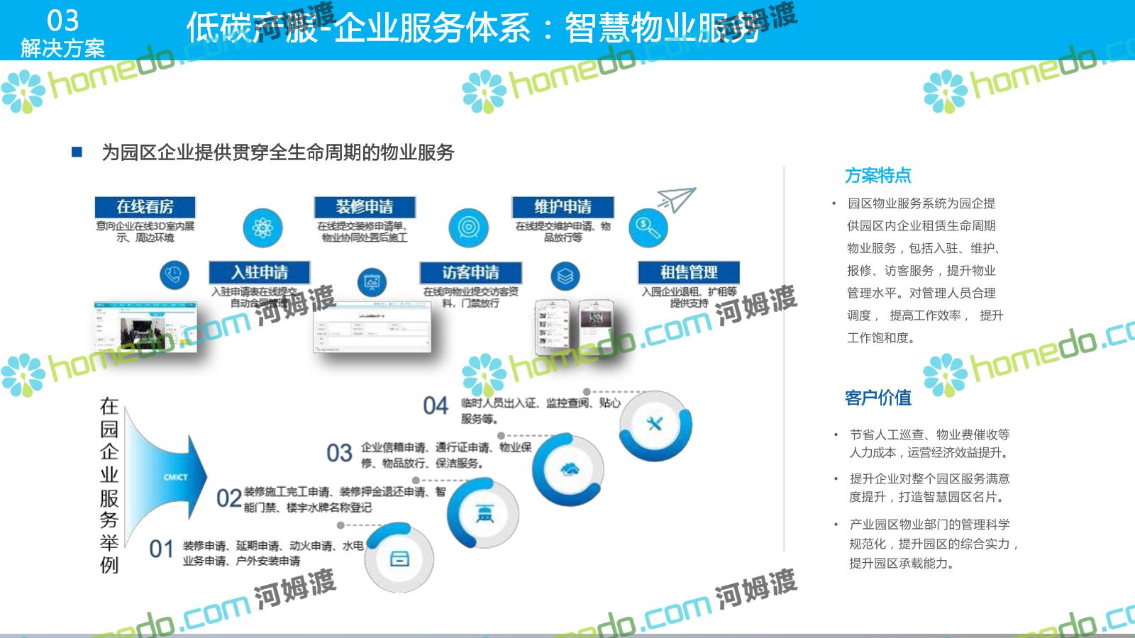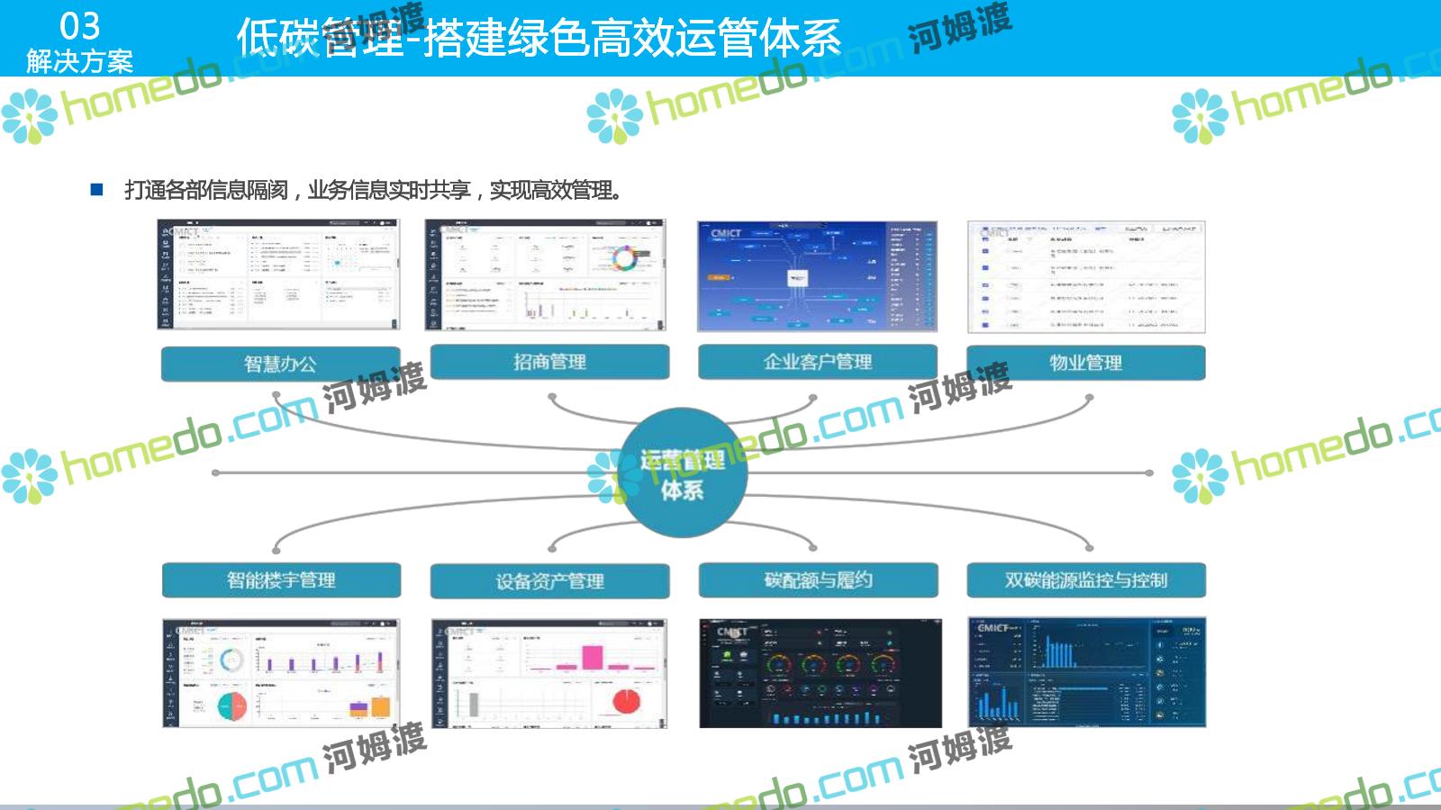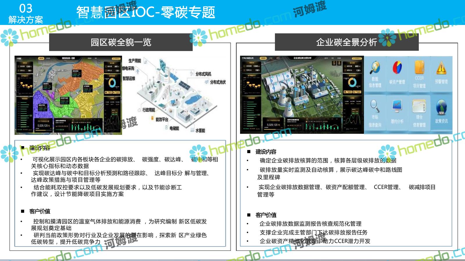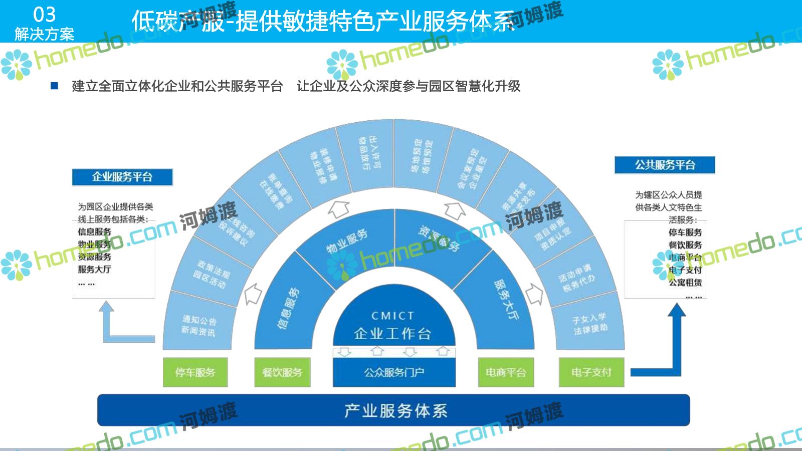 方案简介 围绕园区管理方、运营方、园区企业、园区公众四大主体,通过“智能底座+数字管控+绿色产服”的建设路径,中移 集成为园区提供“咨询规划、定制研发、实施交付、运营 推广”的一站式服务,做园区零碳转型的贴身管家。