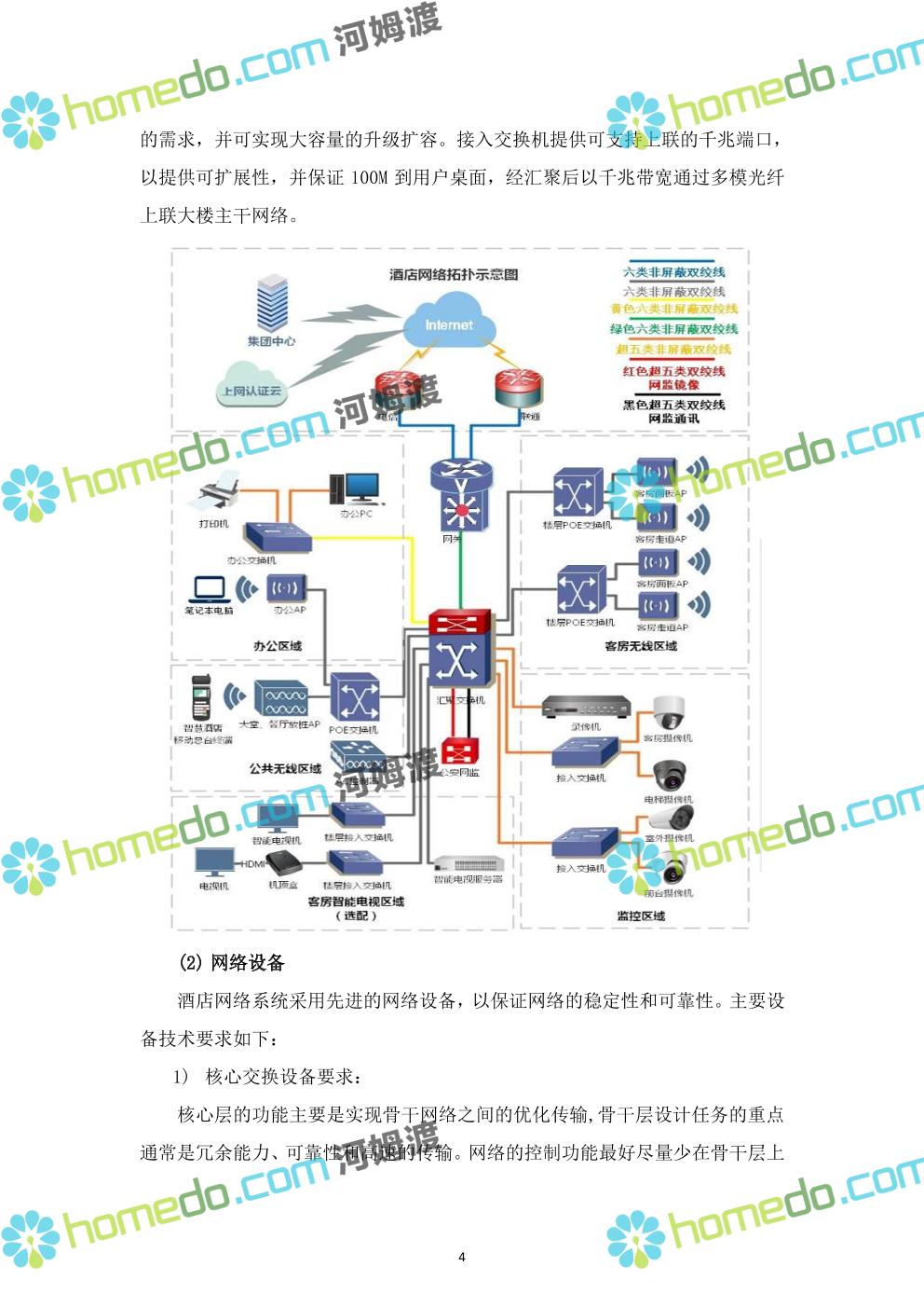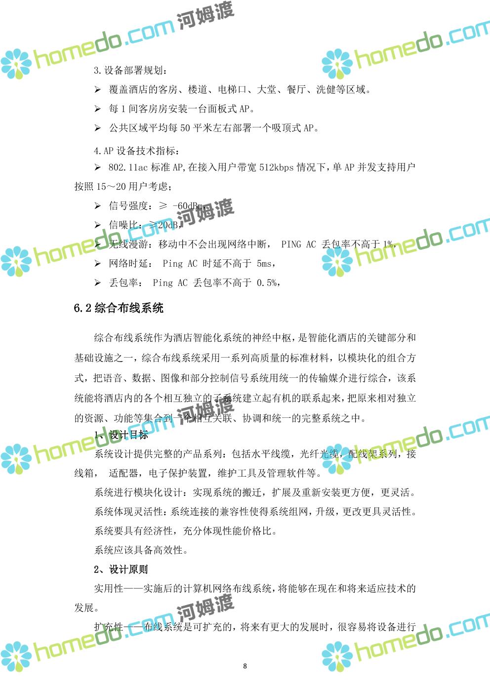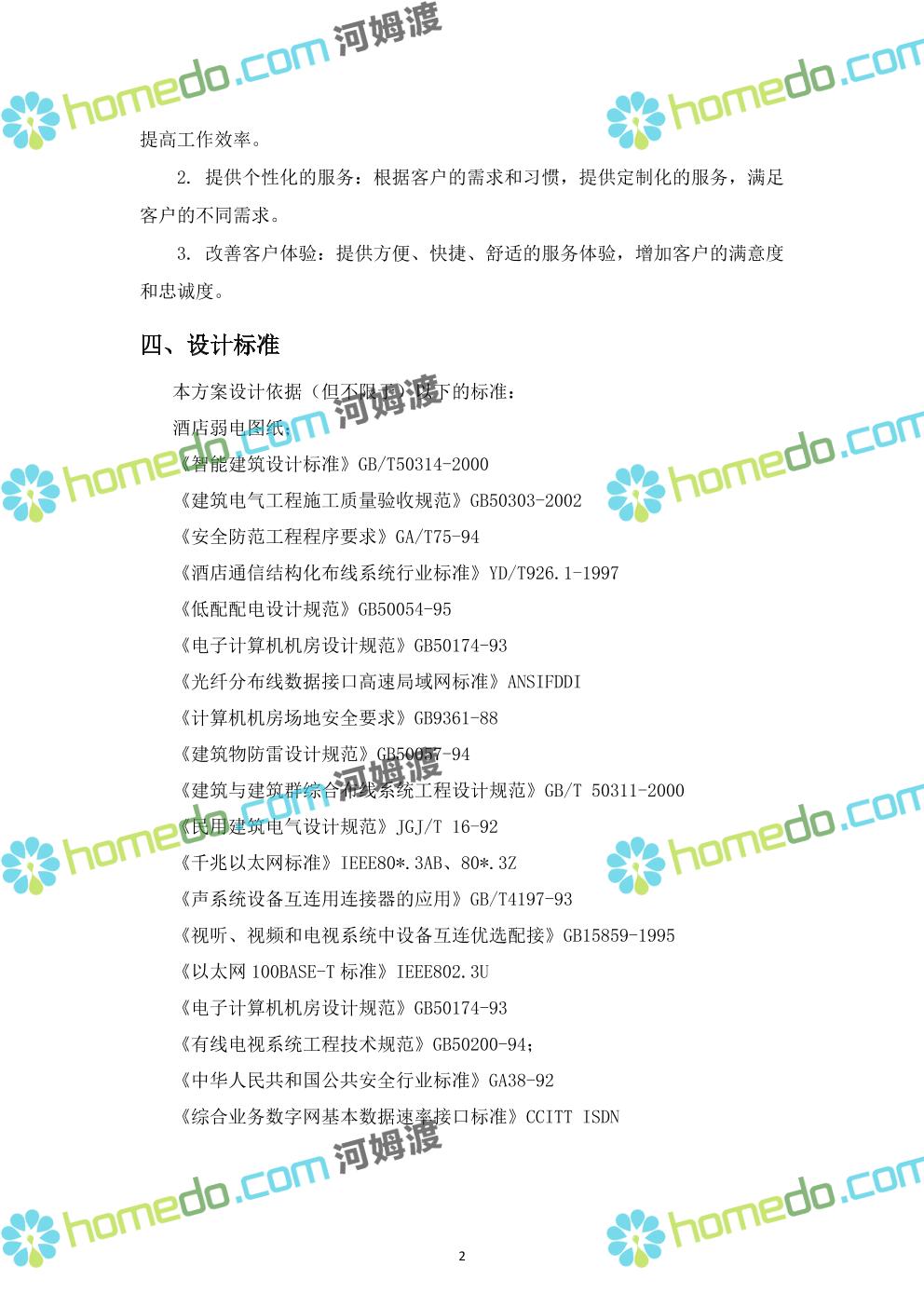 方案简介 ****酒店是一座集餐饮、住宿、休闲等服务于一体的专业酒店。针对酒店智能化系统工程的要求,为了适应娱乐业、餐饮业、休闲旅游业及商业服务业的发展,为客人提供更优质、更舒适、更快捷的服务;为提高酒店内部的管理效率和提升酒店的形象,结合我公司在酒店行业多年的设计及施工经验,就酒店智能化系统建设我公司提供如下设计方案。