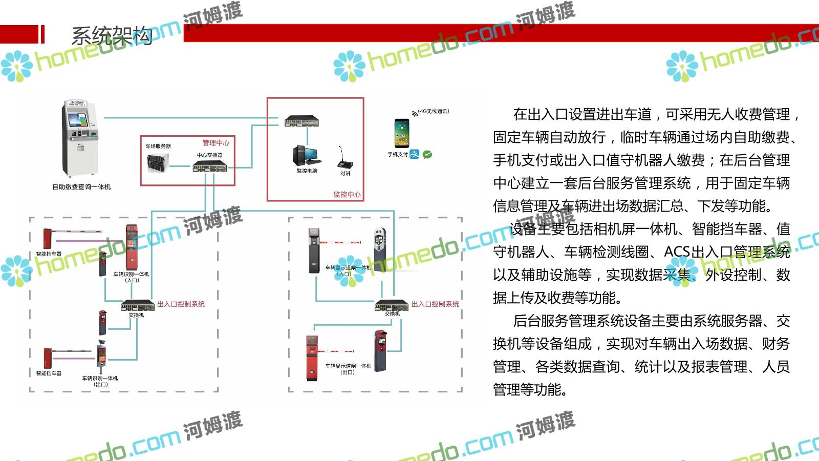 方案简介 在出入口设置进出车道,可采用无人收费管理,固定车辆自动放行,临时车辆通过场内自助缴费、手机支付或出入口值守机器人缴费;在后台管理中心建立一套后台服务管理系统,用于固定车辆信息管理及车辆进出场数据汇总、下发等功能。 设备主要包括相机屏一体机、智能挡车器、值守机器人、车辆检测线圈、ACS出入口管理系统以及辅助设施等,实现数据采集、外设控制、数据上传及收费等功能。 后台服务管理系统设备主要由系统服务器、交换机等设备组成,实现对车辆出入场数据、财务管理、各类数据查询、统计以及报表管理、人员管理等功能。