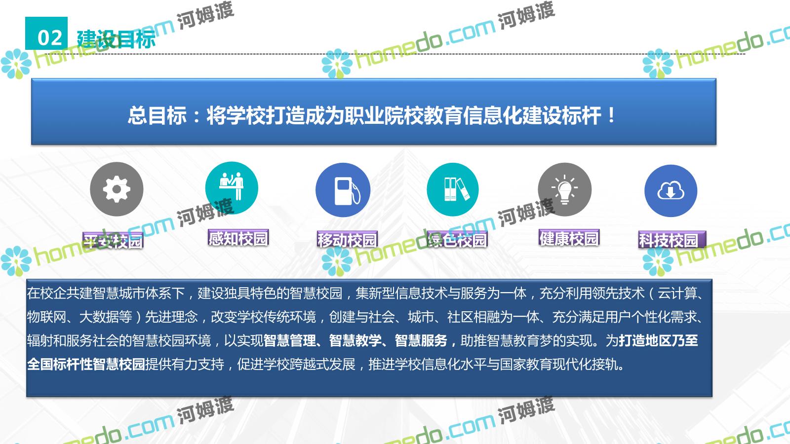 方案简介 在校企共建智慧城市体系下,建设独具特色的智慧校园,集新型信息技术与服务为一体,充分利用领先技术(云计算、 物联网、大数据等)先进理念,改变学校传统环境,创建与社会、城市、社区相融为一体、充分满足用户个性化需求、 辐射和服务社会的智慧校园环境,以实现智慧管理、智慧教学、智慧服务,助推智慧教育梦的实现。为打造地区乃至 全国标杆性智慧校园提供有力支持,促进学校跨越式发展,推进学校信息化水平与国家教育现代化接轨。