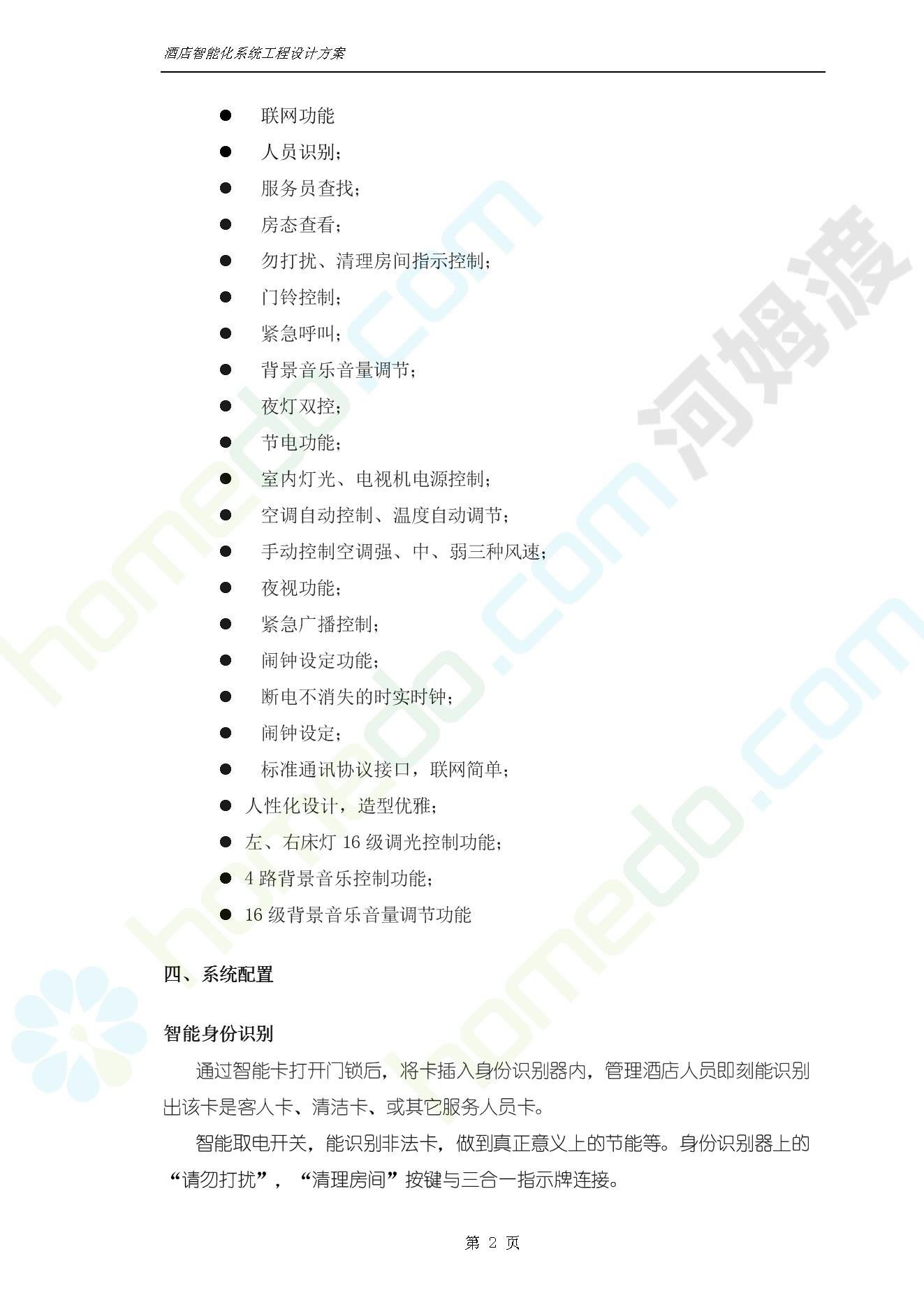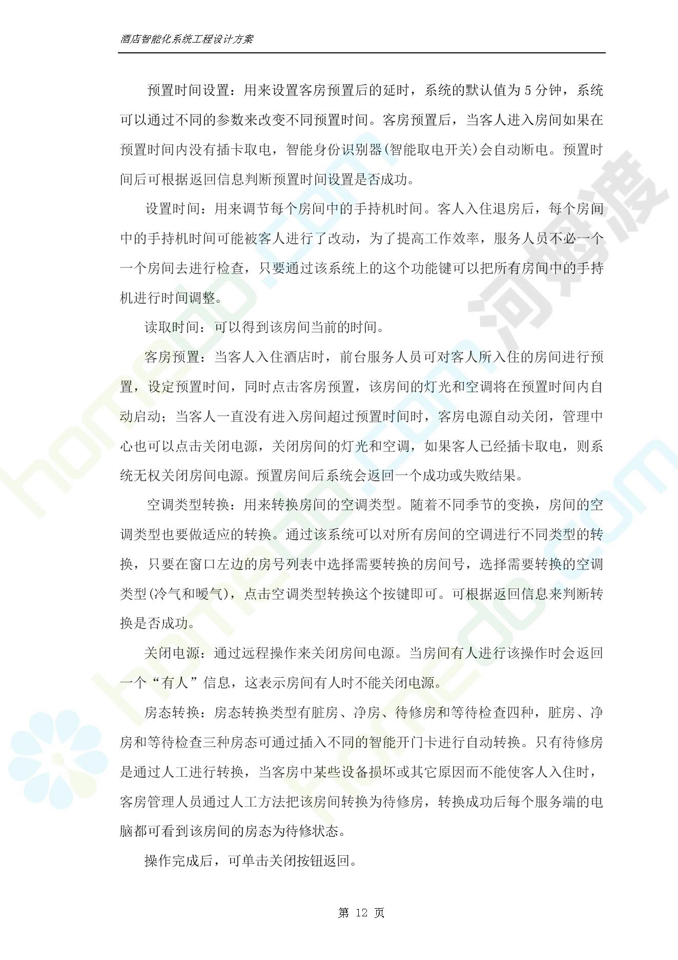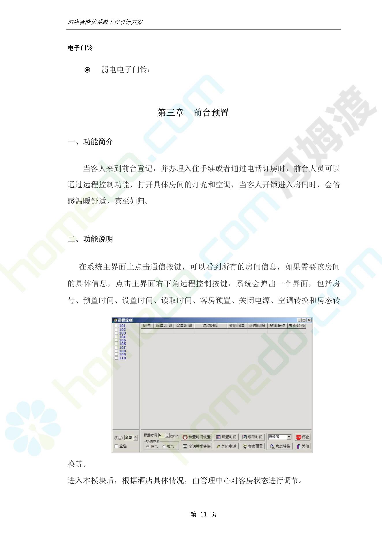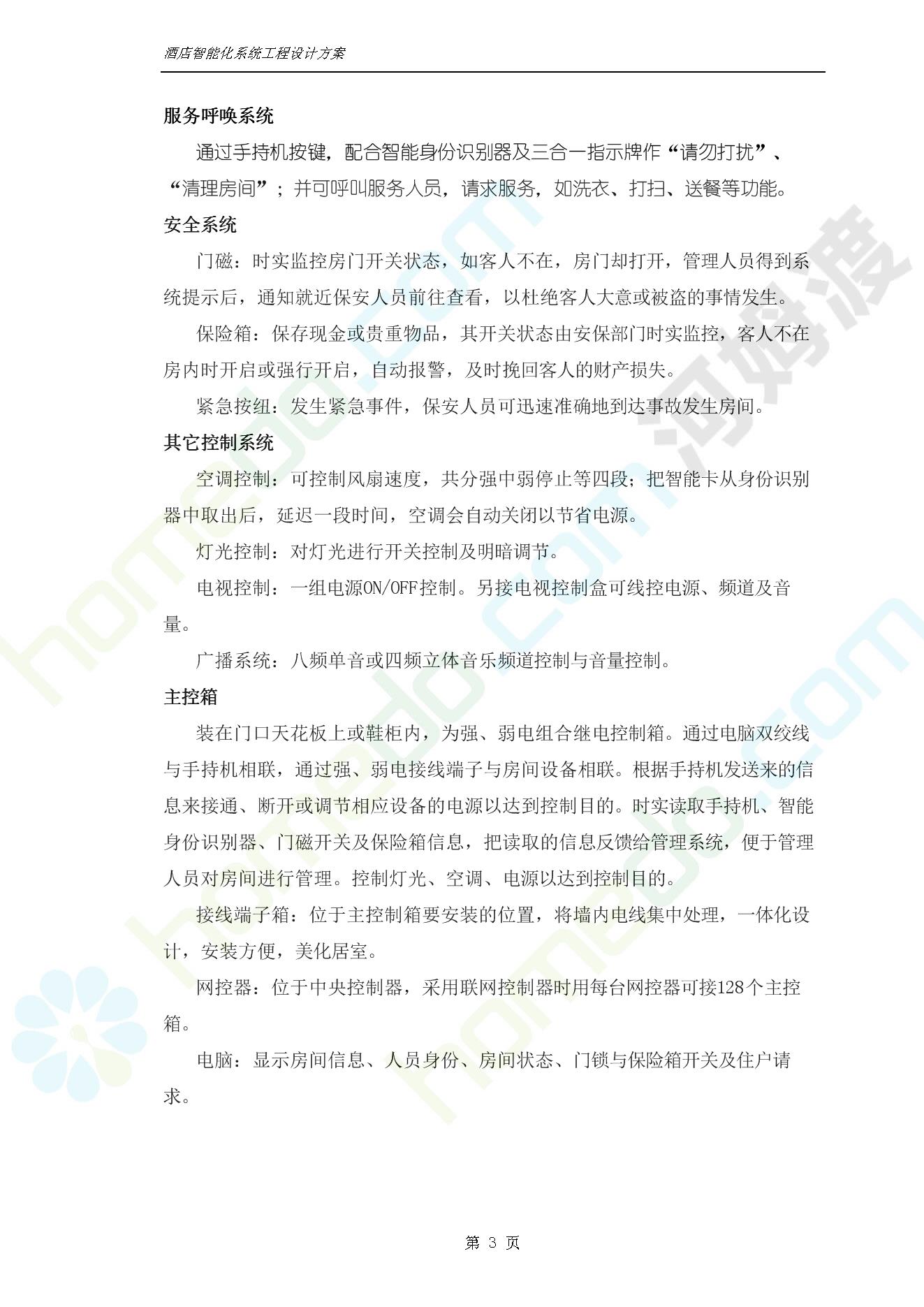 方案简介 智能客房酒店管理系统由管理系统软件、主控制箱、接线端子箱、门锁、勿扰/清理/门铃开关三合一指示牌、智能身份识别器、网控器、计算机组成。