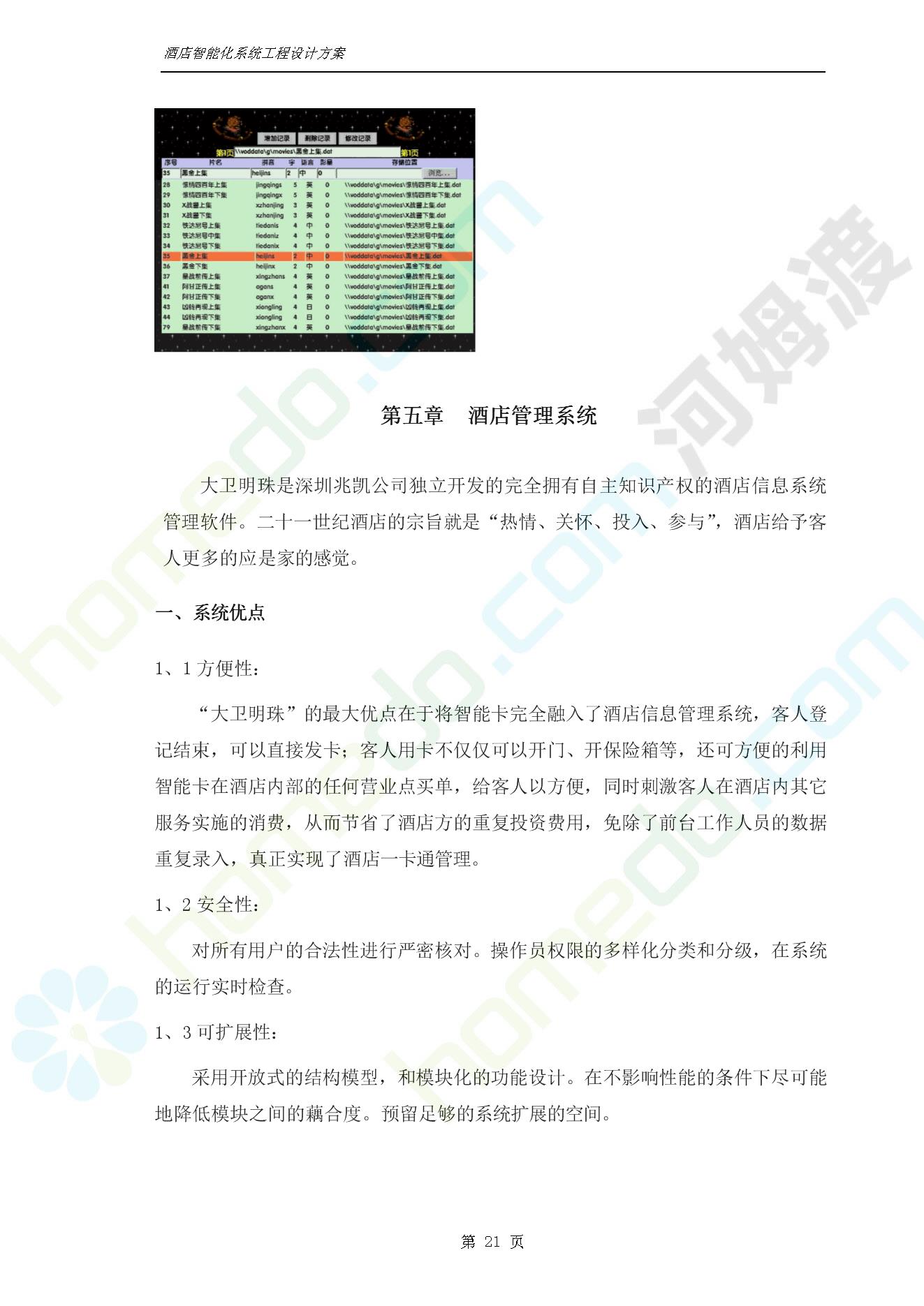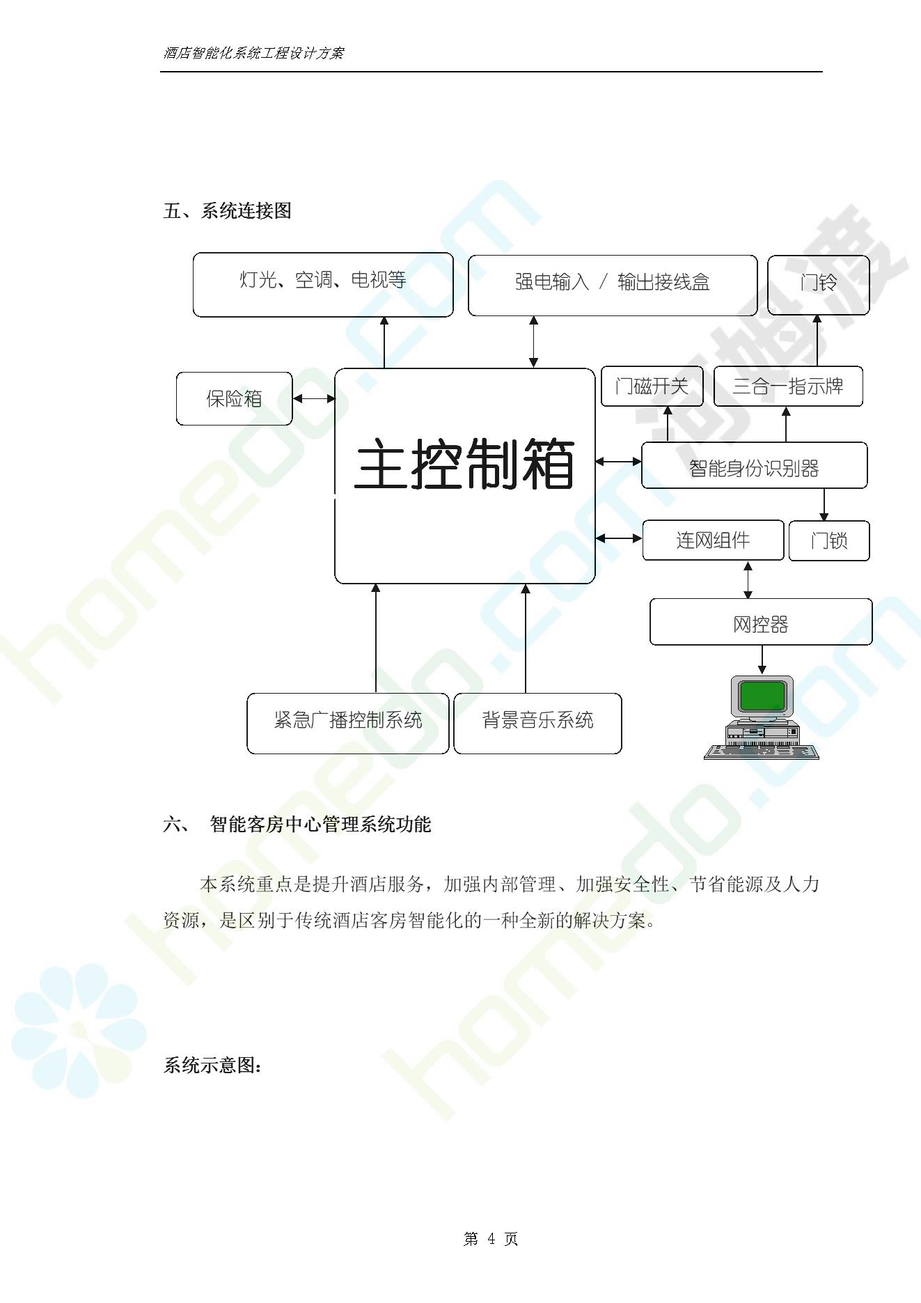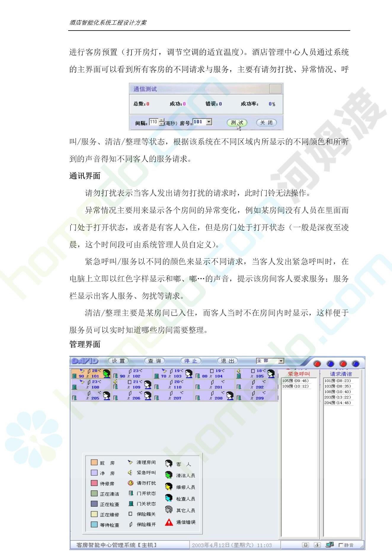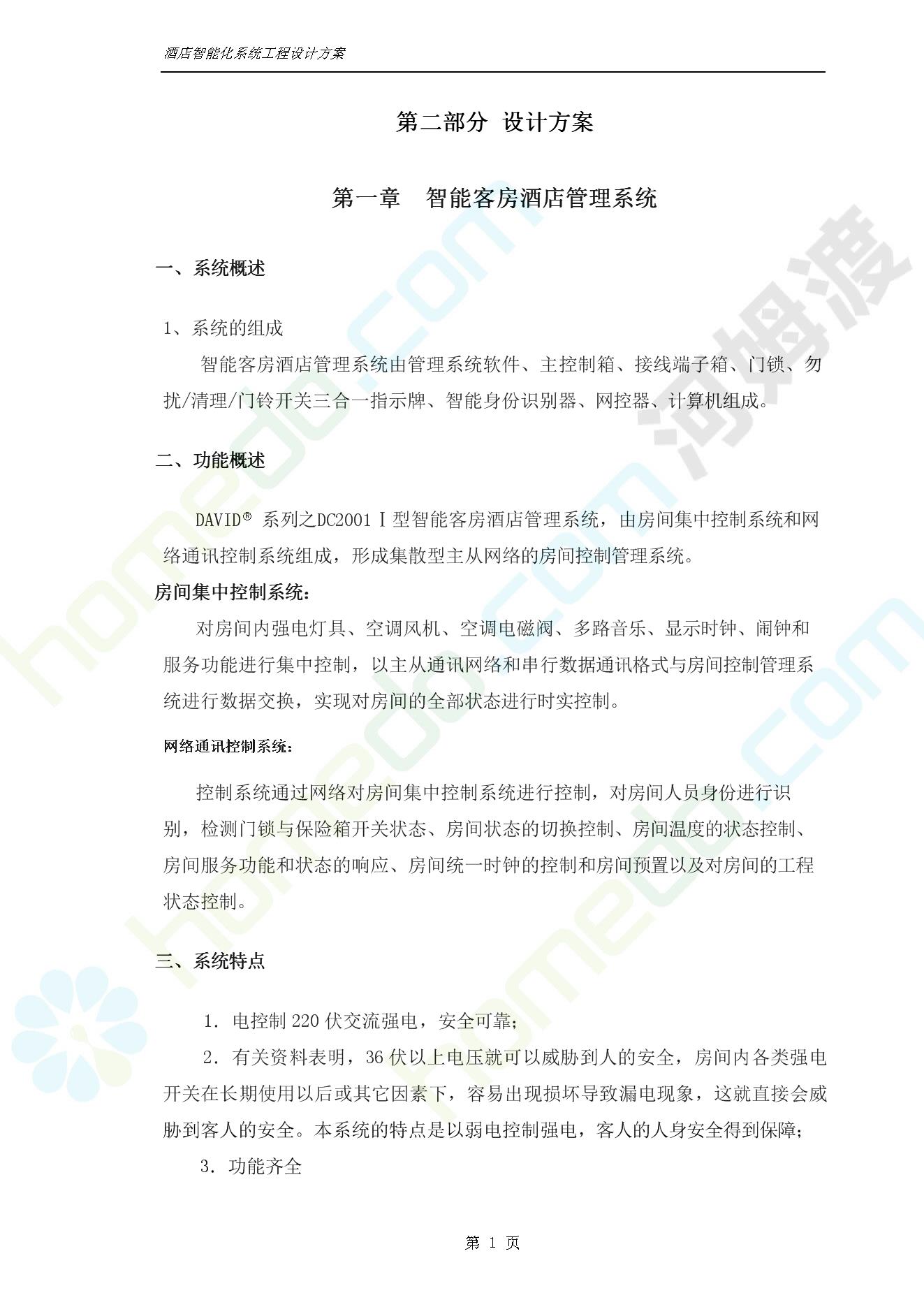 方案简介 智能客房酒店管理系统由管理系统软件、主控制箱、接线端子箱、门锁、勿扰/清理/门铃开关三合一指示牌、智能身份识别器、网控器、计算机组成。