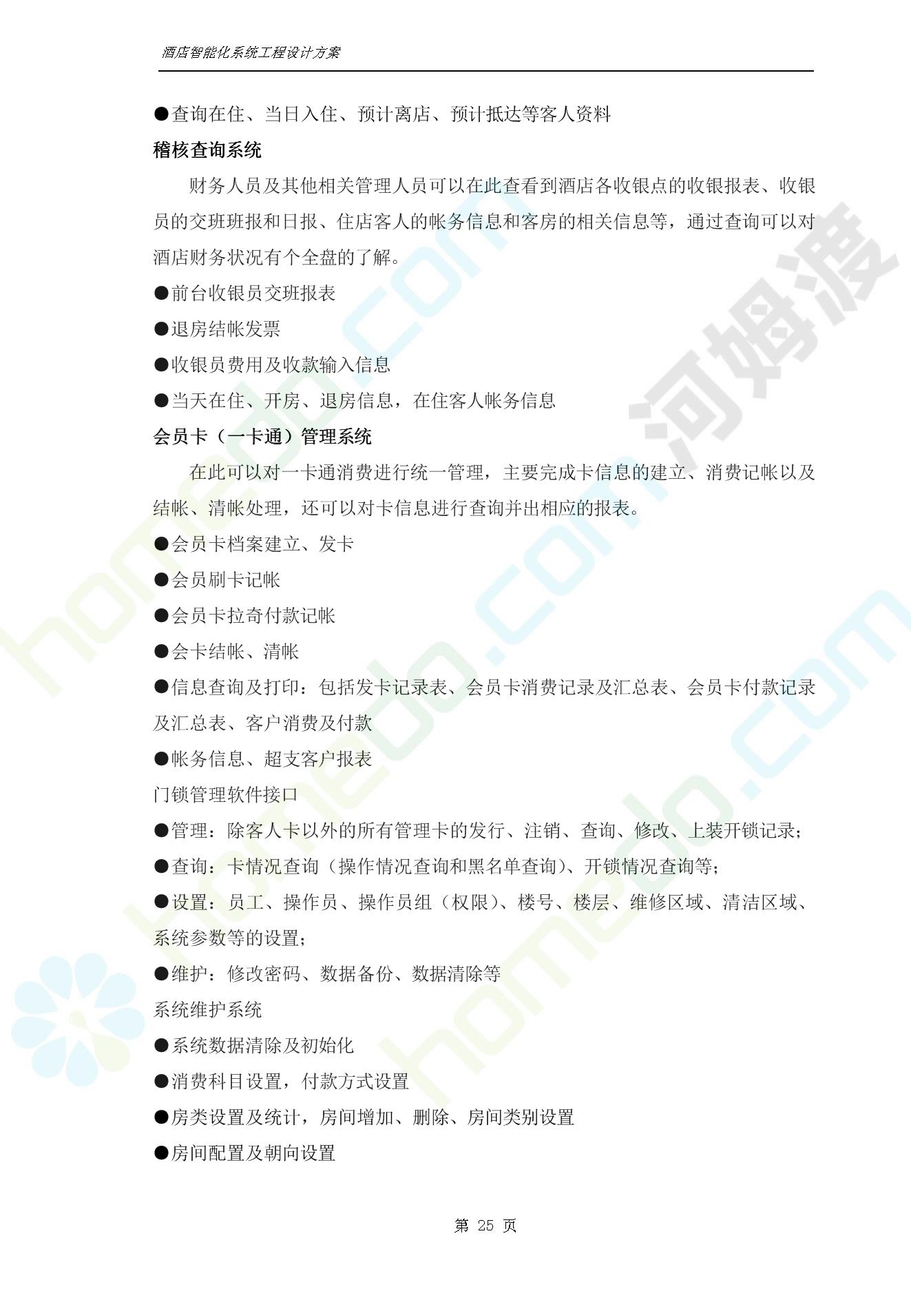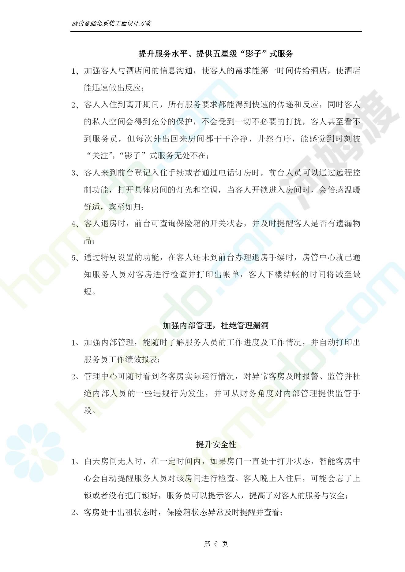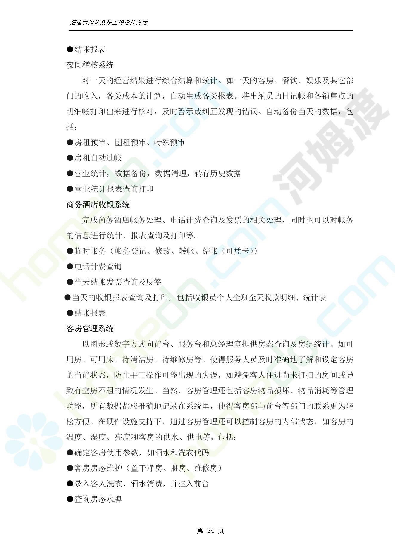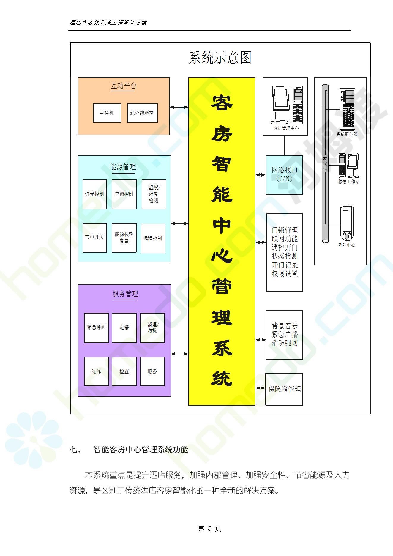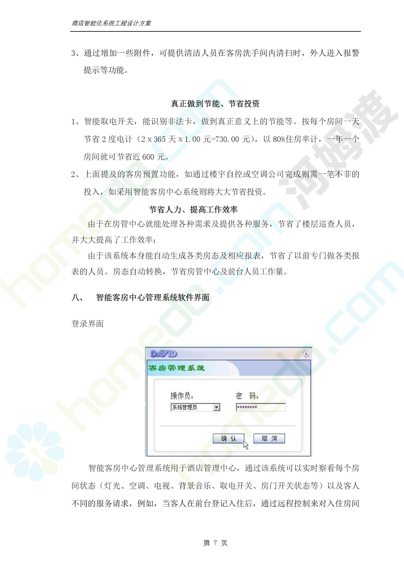 方案简介 智能客房酒店管理系统由管理系统软件、主控制箱、接线端子箱、门锁、勿扰/清理/门铃开关三合一指示牌、智能身份识别器、网控器、计算机组成。