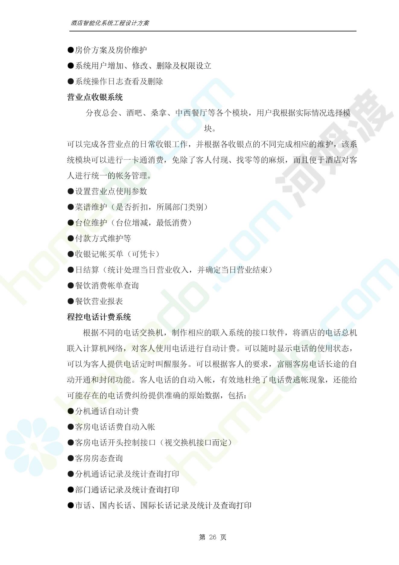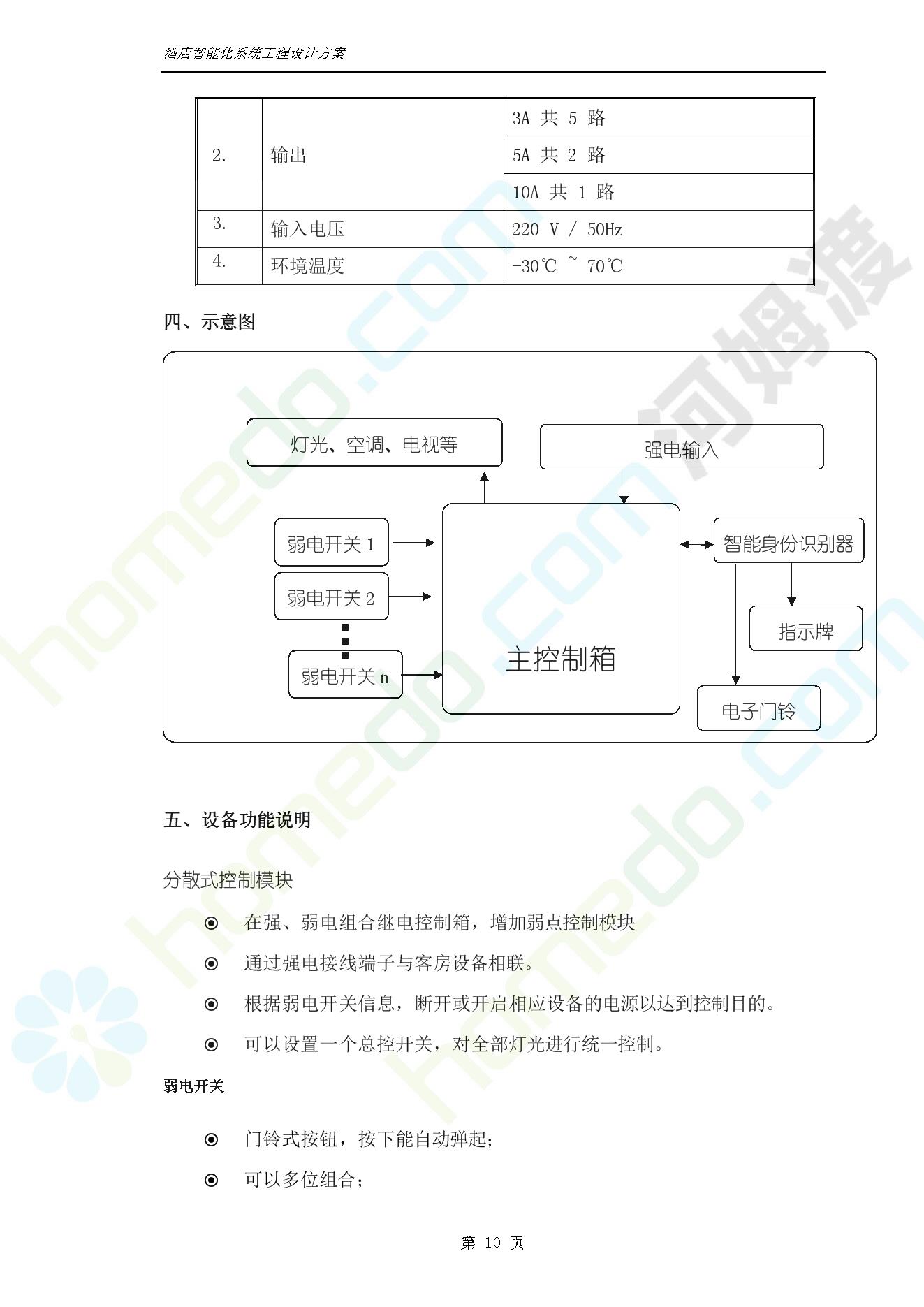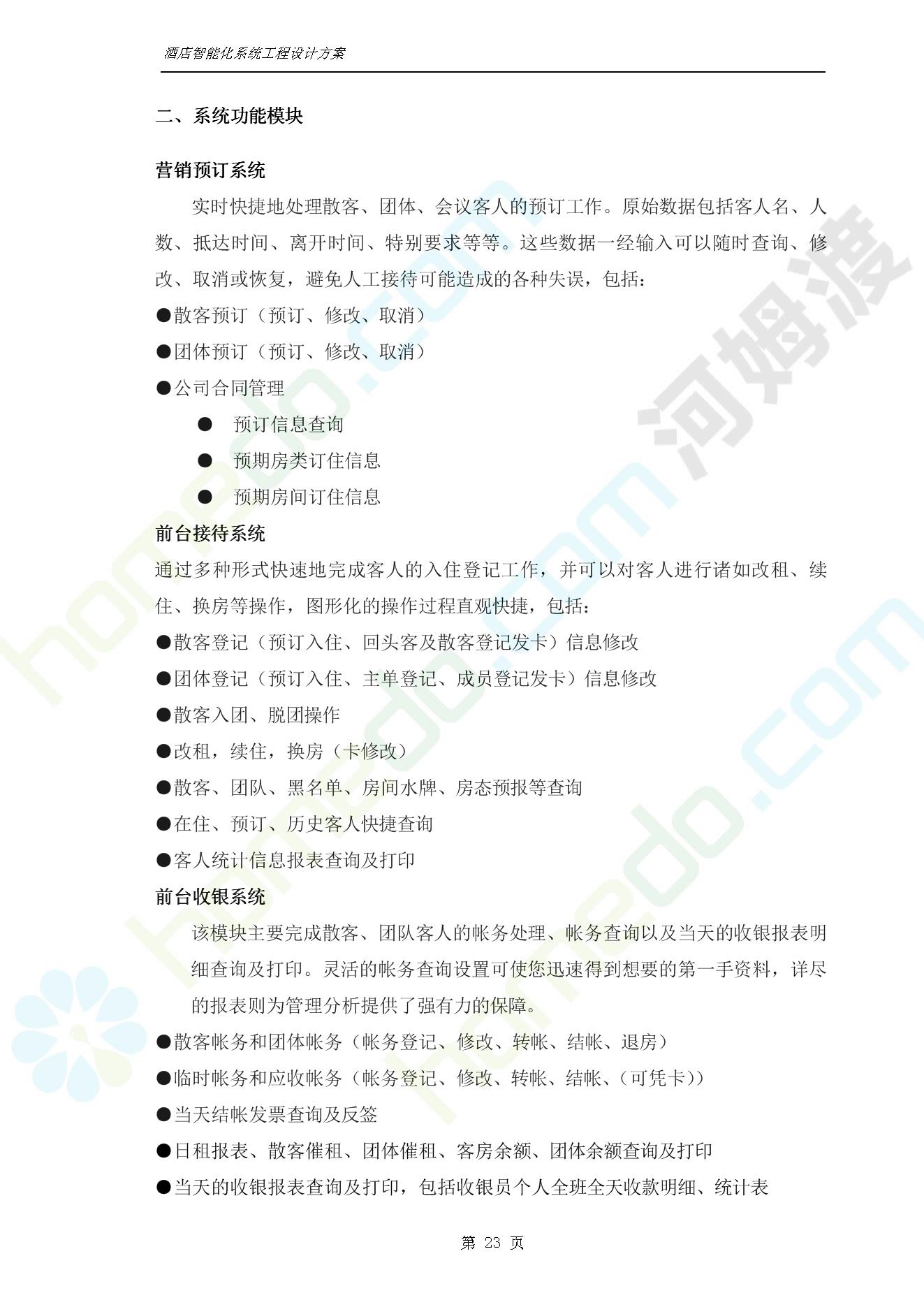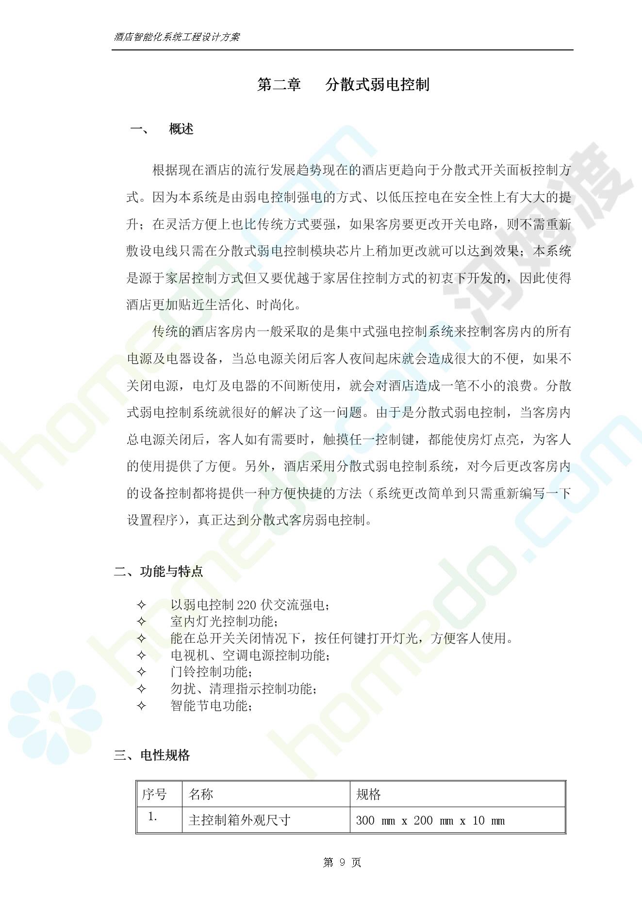 方案简介 智能客房酒店管理系统由管理系统软件、主控制箱、接线端子箱、门锁、勿扰/清理/门铃开关三合一指示牌、智能身份识别器、网控器、计算机组成。