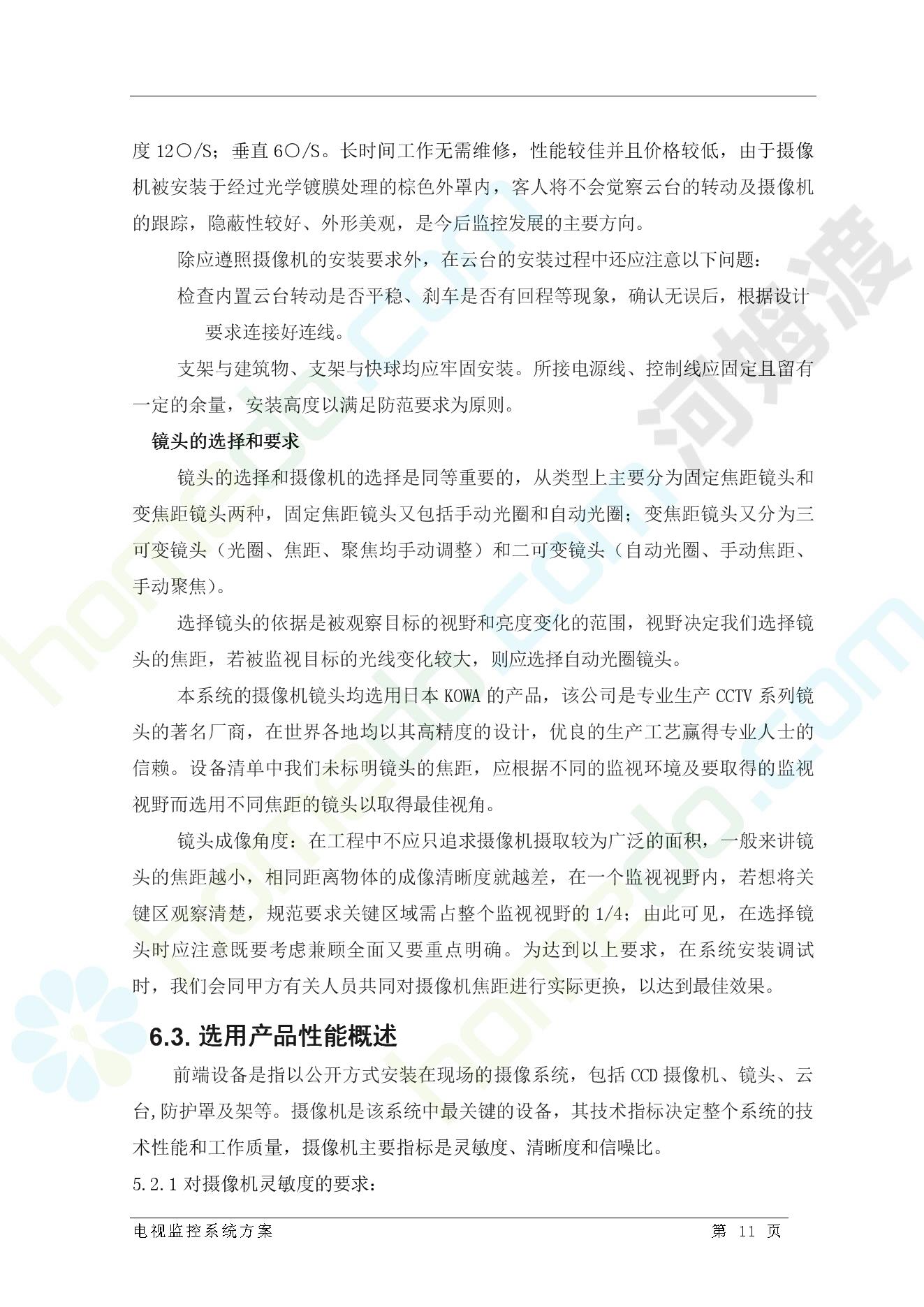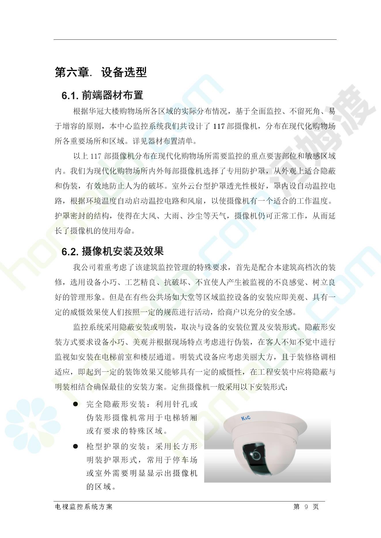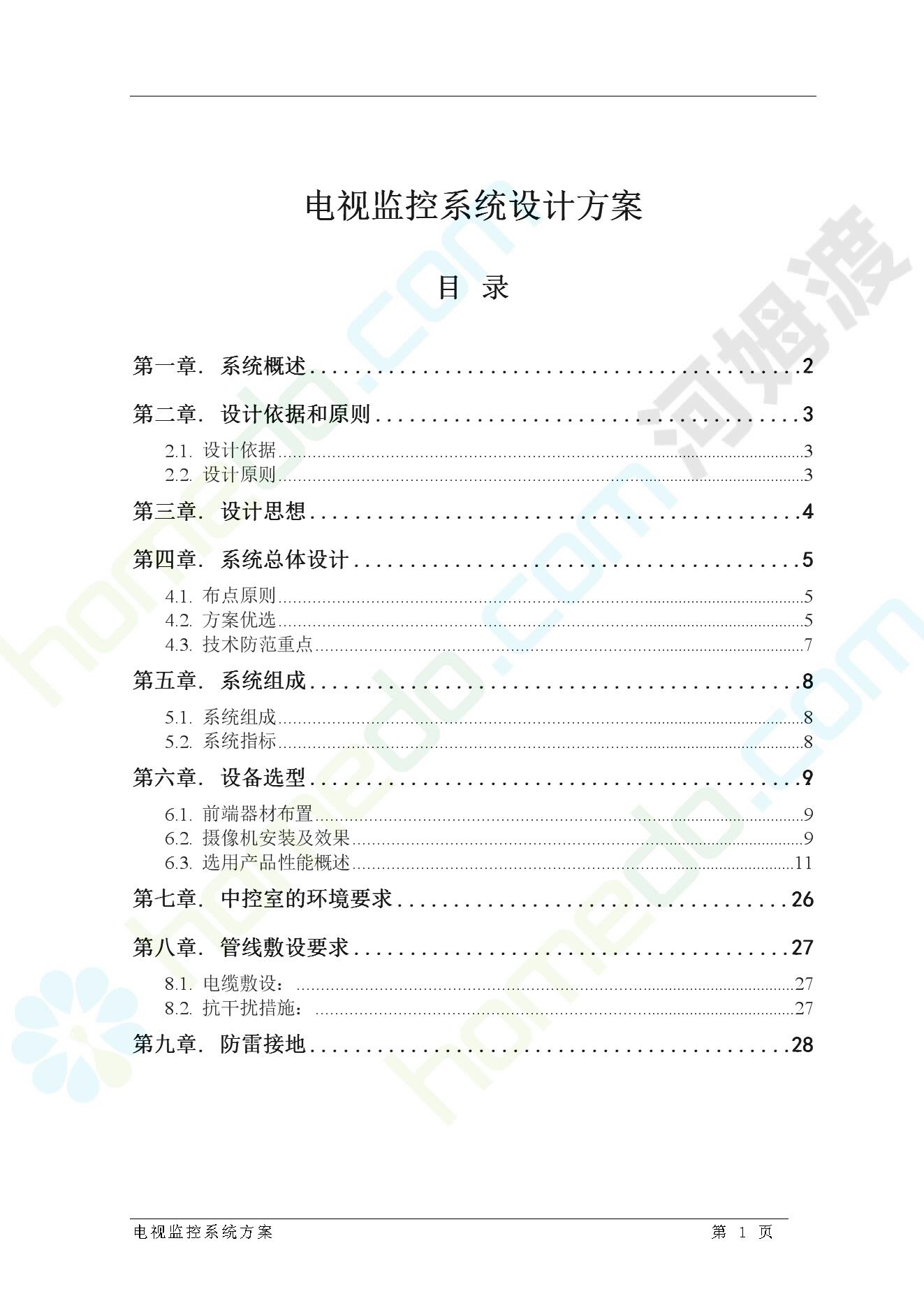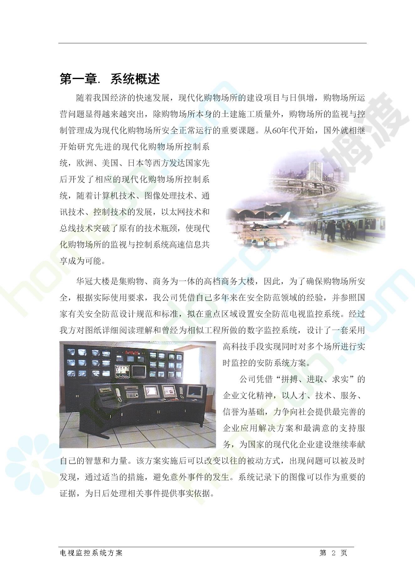 方案简介 第一章. 系统概述 2 第二章. 设计依据和原则 3 2.1. 设计依据 3 2.2. 设计原则 3 第三章. 设计思想 4 第四章. 系统总体设计 5 4.1. 布点原则 5 4.2. 方案优选 5 4.3. 技术防范重点 7 第五章. 系统组成 8 5.1. 系统组成 8 5.2. 系统指标 8 第六章. 设备选型 9 6.1. 前端器材布置 9 6.2. 摄像机安装及效果 9 6.3. 选用产品性能概述 11 第七章. 中控室的环境要求 26 第八章. 管线敷设要求 27 8.1. 电缆敷设: 27 8.2. 抗干扰措施: 27 第九章. 防雷接地 28