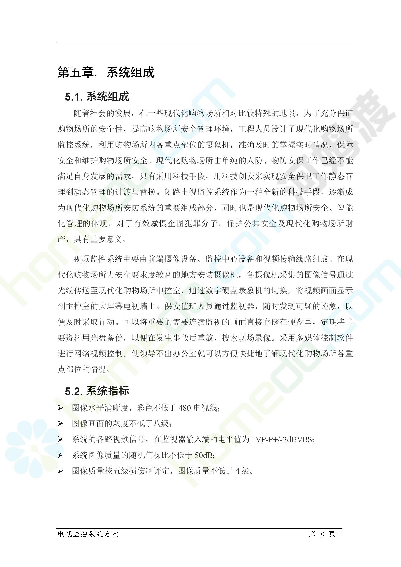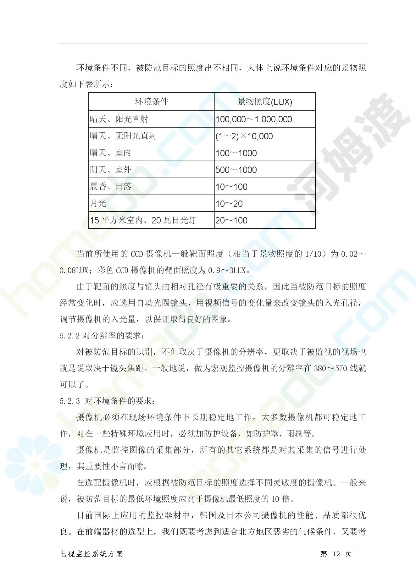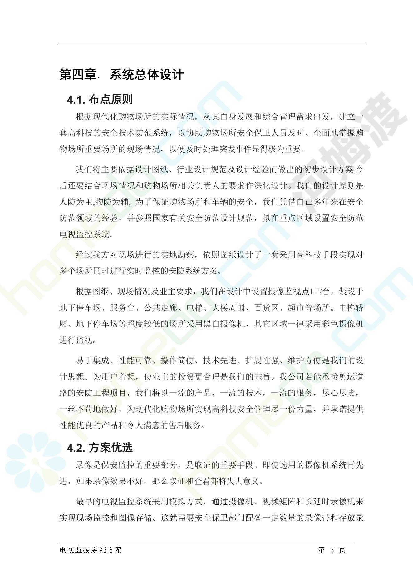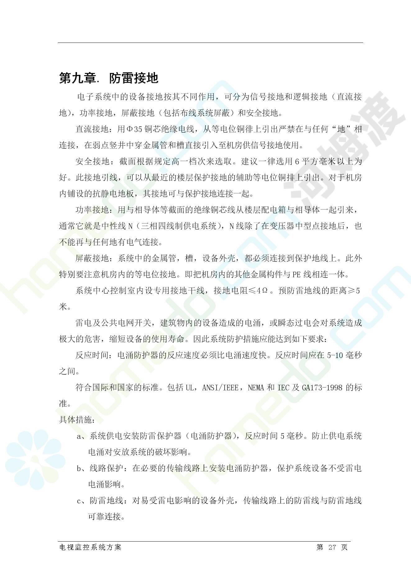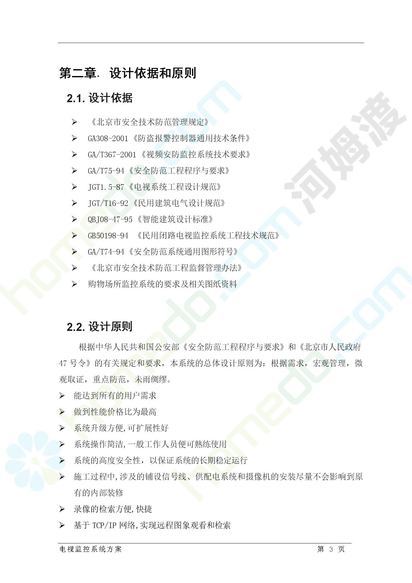 方案简介 第一章. 系统概述 2 第二章. 设计依据和原则 3 2.1. 设计依据 3 2.2. 设计原则 3 第三章. 设计思想 4 第四章. 系统总体设计 5 4.1. 布点原则 5 4.2. 方案优选 5 4.3. 技术防范重点 7 第五章. 系统组成 8 5.1. 系统组成 8 5.2. 系统指标 8 第六章. 设备选型 9 6.1. 前端器材布置 9 6.2. 摄像机安装及效果 9 6.3. 选用产品性能概述 11 第七章. 中控室的环境要求 26 第八章. 管线敷设要求 27 8.1. 电缆敷设: 27 8.2. 抗干扰措施: 27 第九章. 防雷接地 28