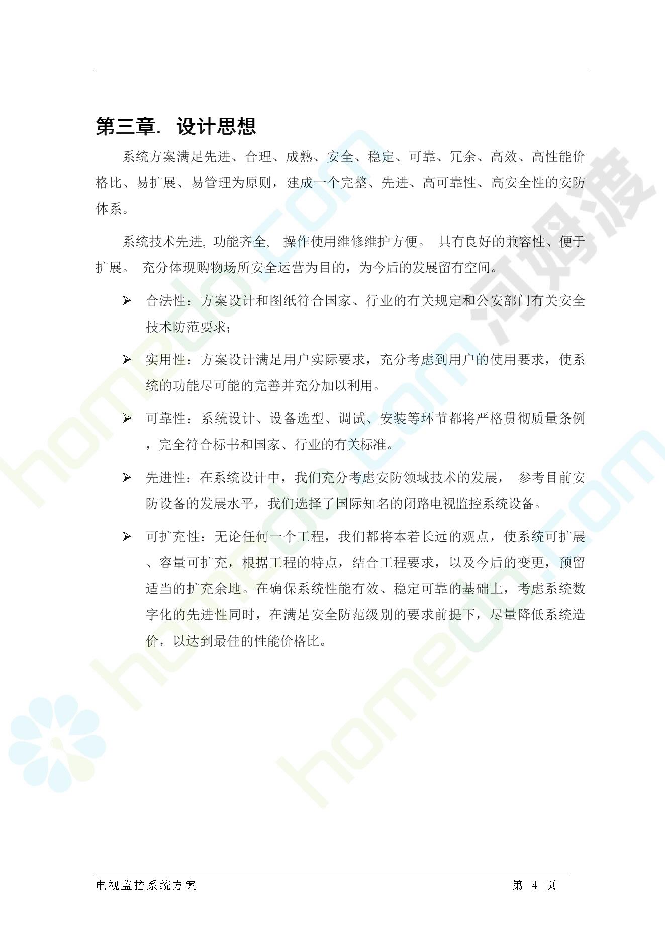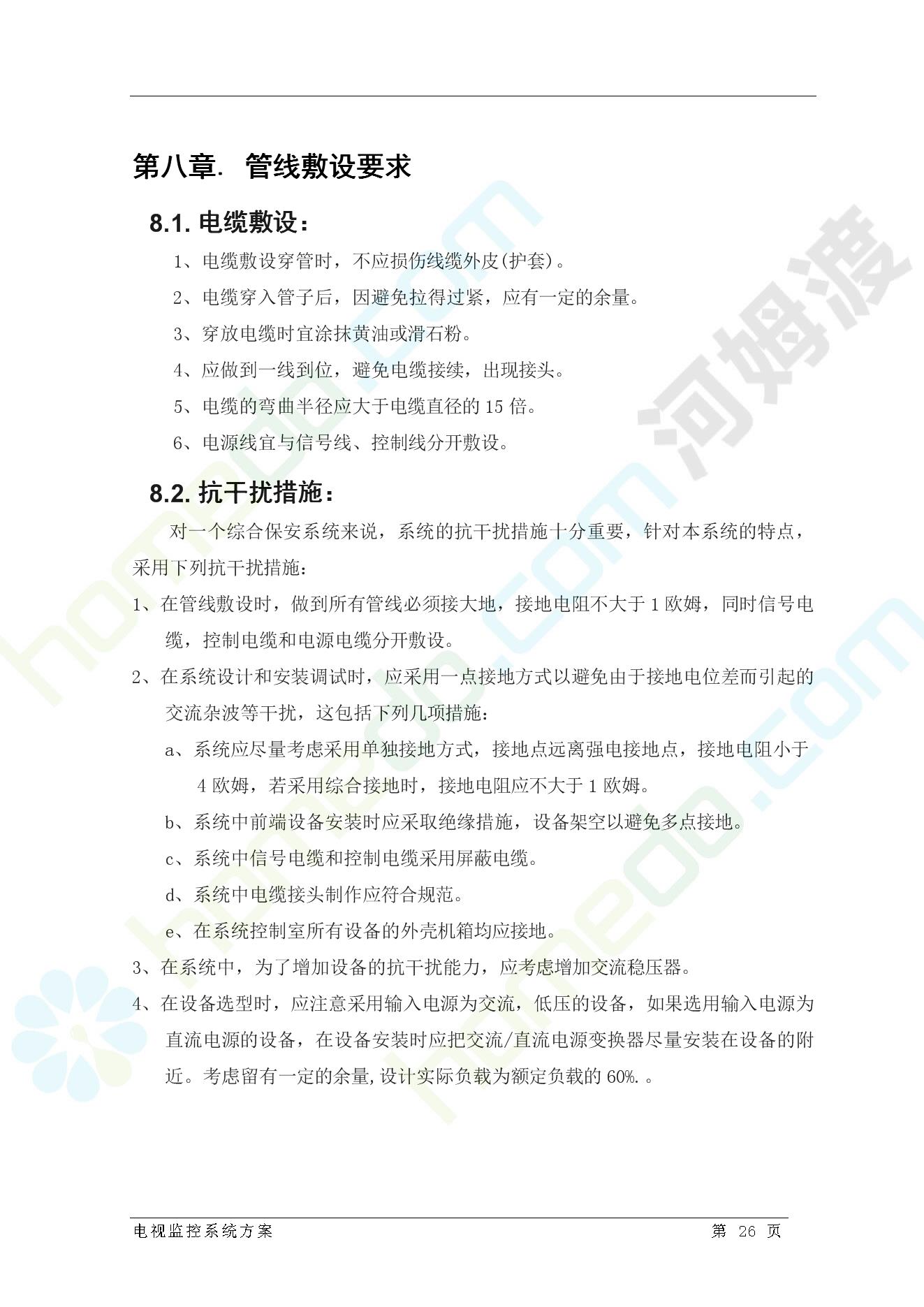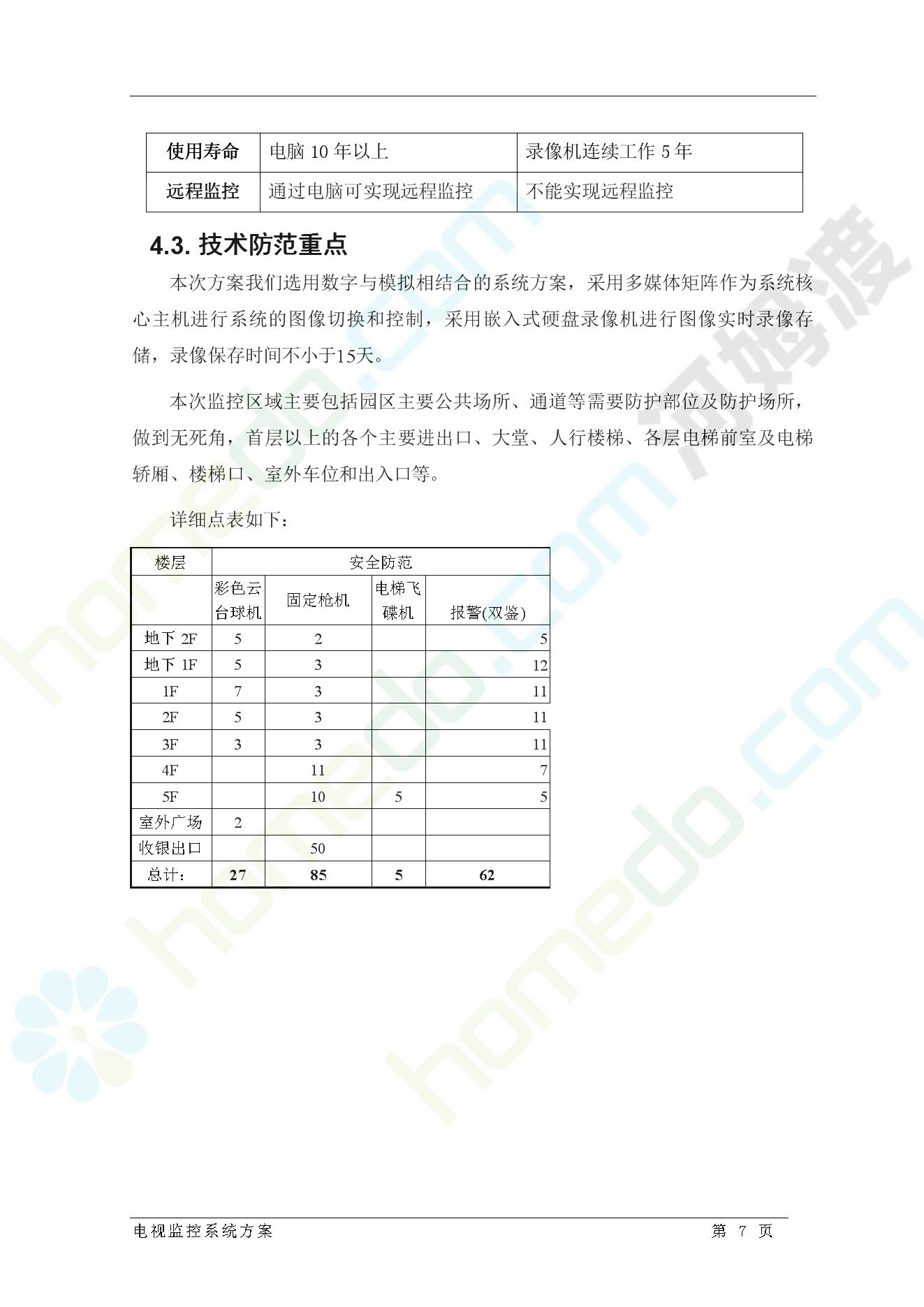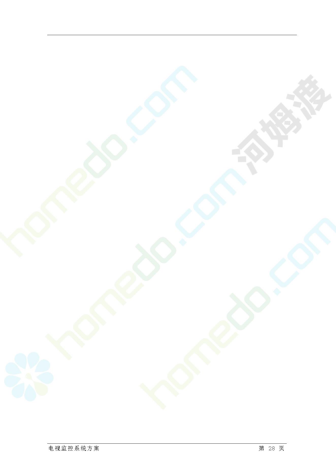 方案简介 第一章. 系统概述 2 第二章. 设计依据和原则 3 2.1. 设计依据 3 2.2. 设计原则 3 第三章. 设计思想 4 第四章. 系统总体设计 5 4.1. 布点原则 5 4.2. 方案优选 5 4.3. 技术防范重点 7 第五章. 系统组成 8 5.1. 系统组成 8 5.2. 系统指标 8 第六章. 设备选型 9 6.1. 前端器材布置 9 6.2. 摄像机安装及效果 9 6.3. 选用产品性能概述 11 第七章. 中控室的环境要求 26 第八章. 管线敷设要求 27 8.1. 电缆敷设: 27 8.2. 抗干扰措施: 27 第九章. 防雷接地 28