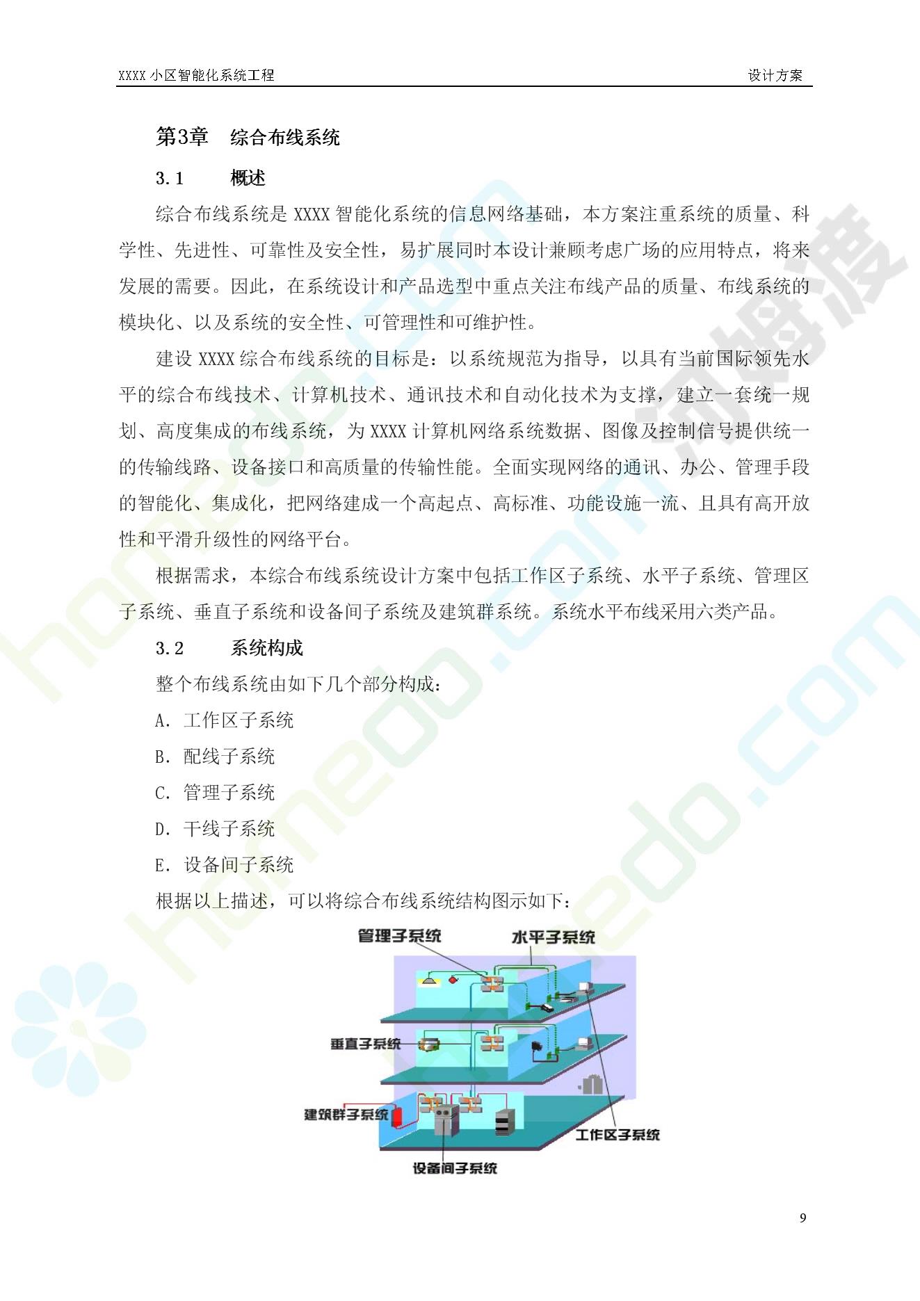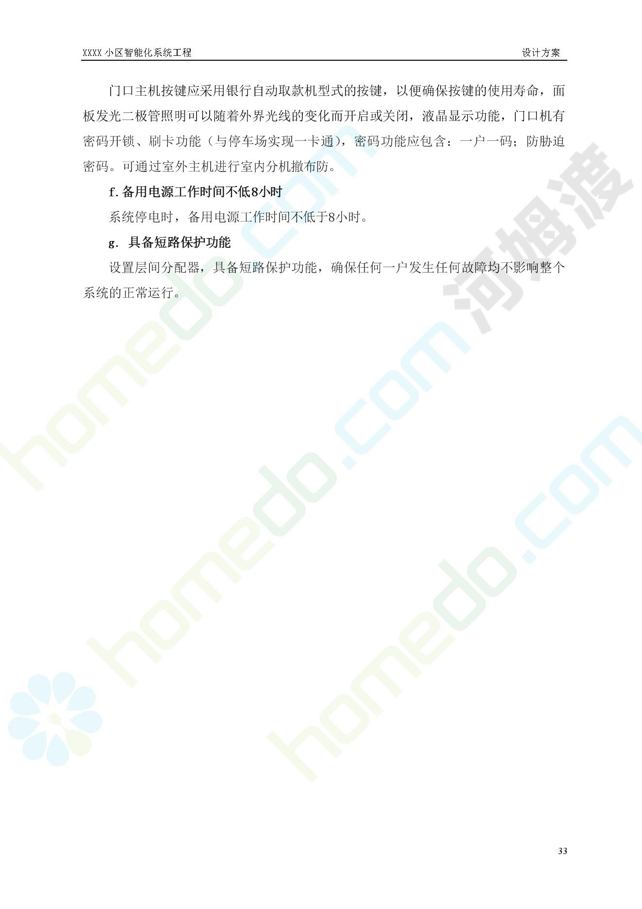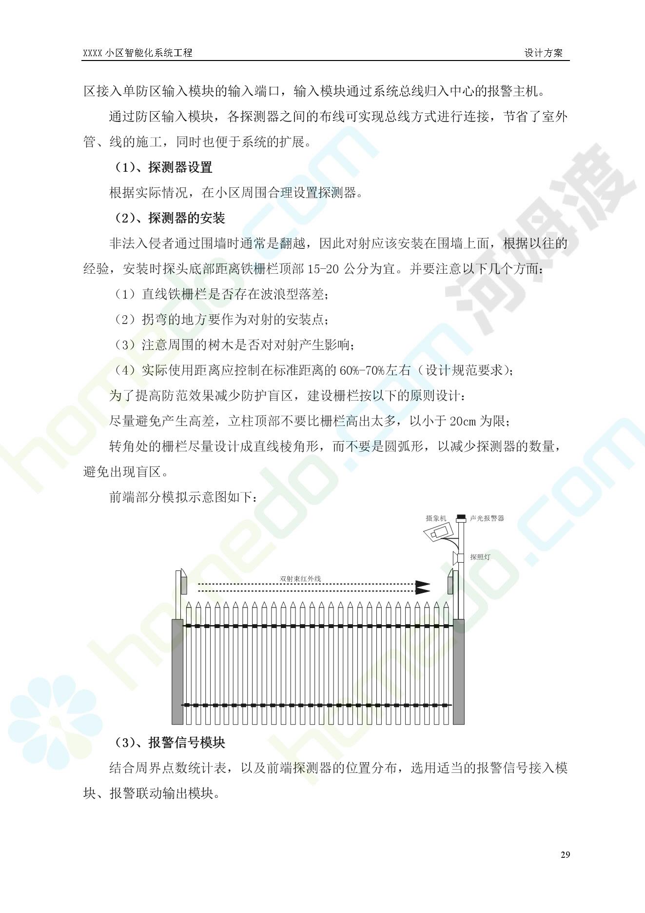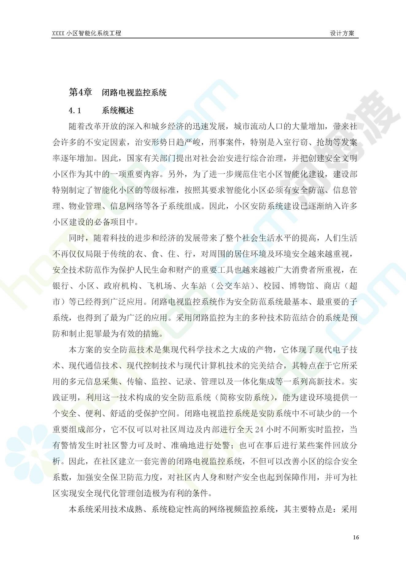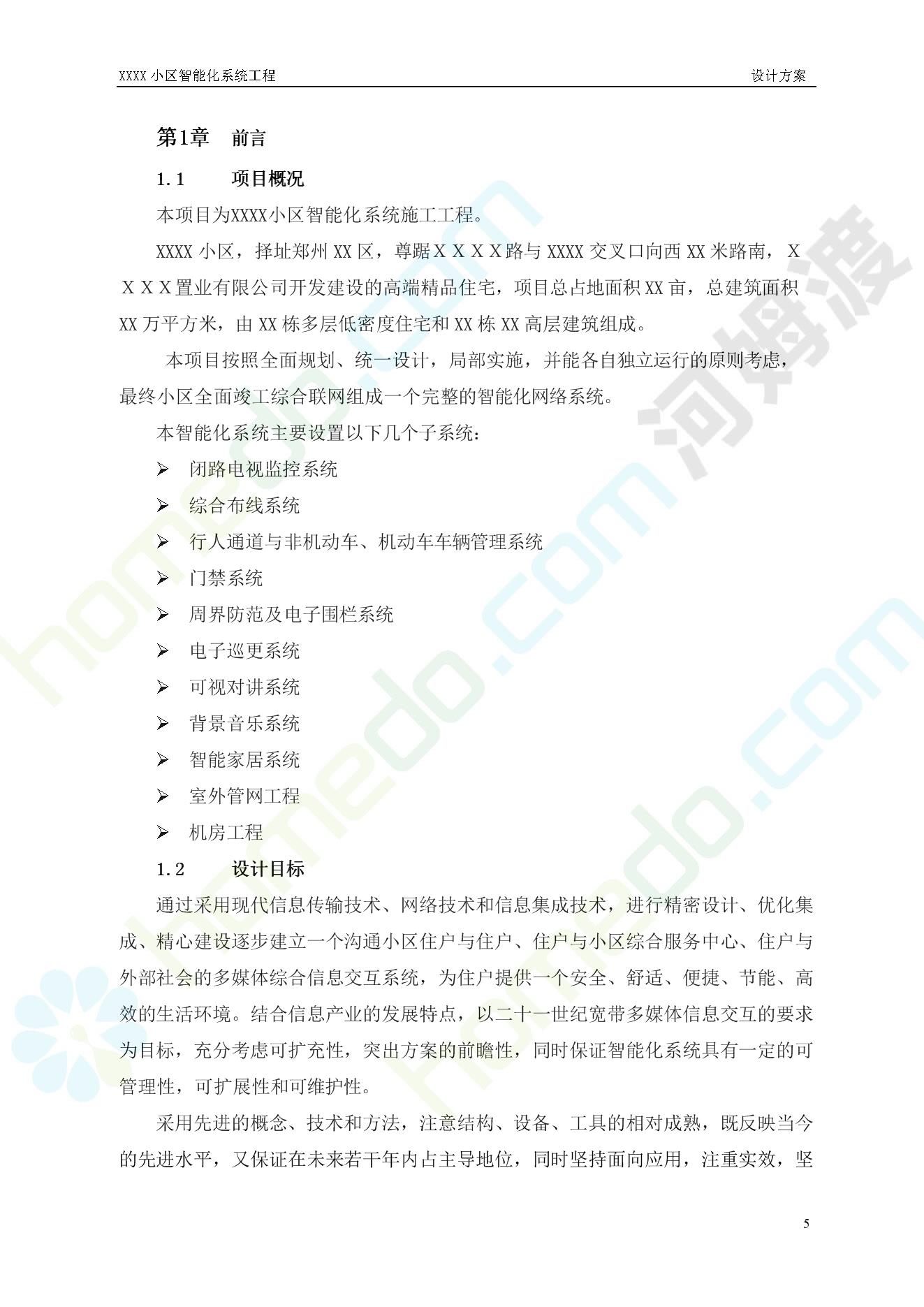 方案简介 XXXX小区,择址郑州XX区,尊踞XXXX路与XXXX交叉口向西XX米路南,XXXX置业有限公司开发建设的高端精品住宅,项目总占地面积XX亩,总建筑面积XX万平方米,由XX栋多层低密度住宅和XX栋XX高层建筑组成。 本项目按照全面规划、统一设计,局部实施,并能各自独立运行的原则考虑,最终小区全面竣工综合联网组成一个完整的智能化网络系统。
