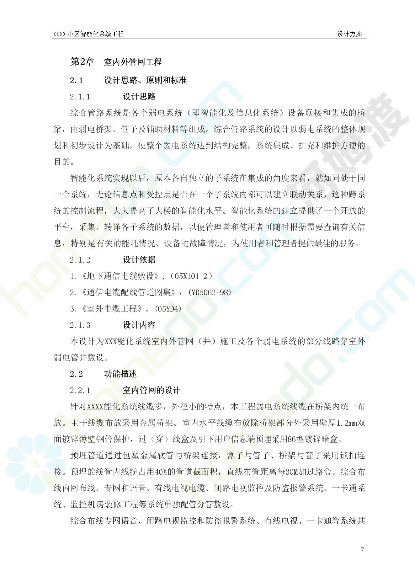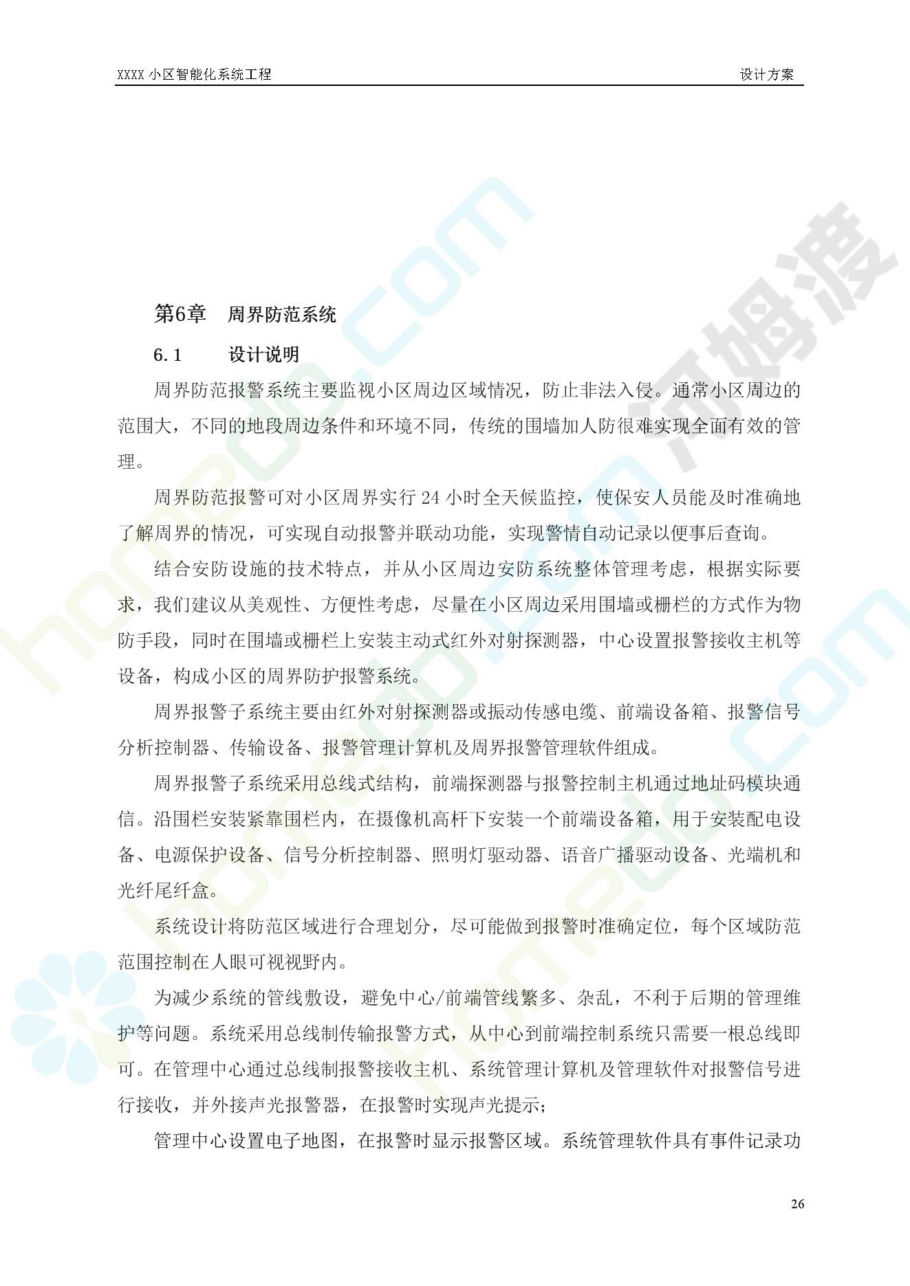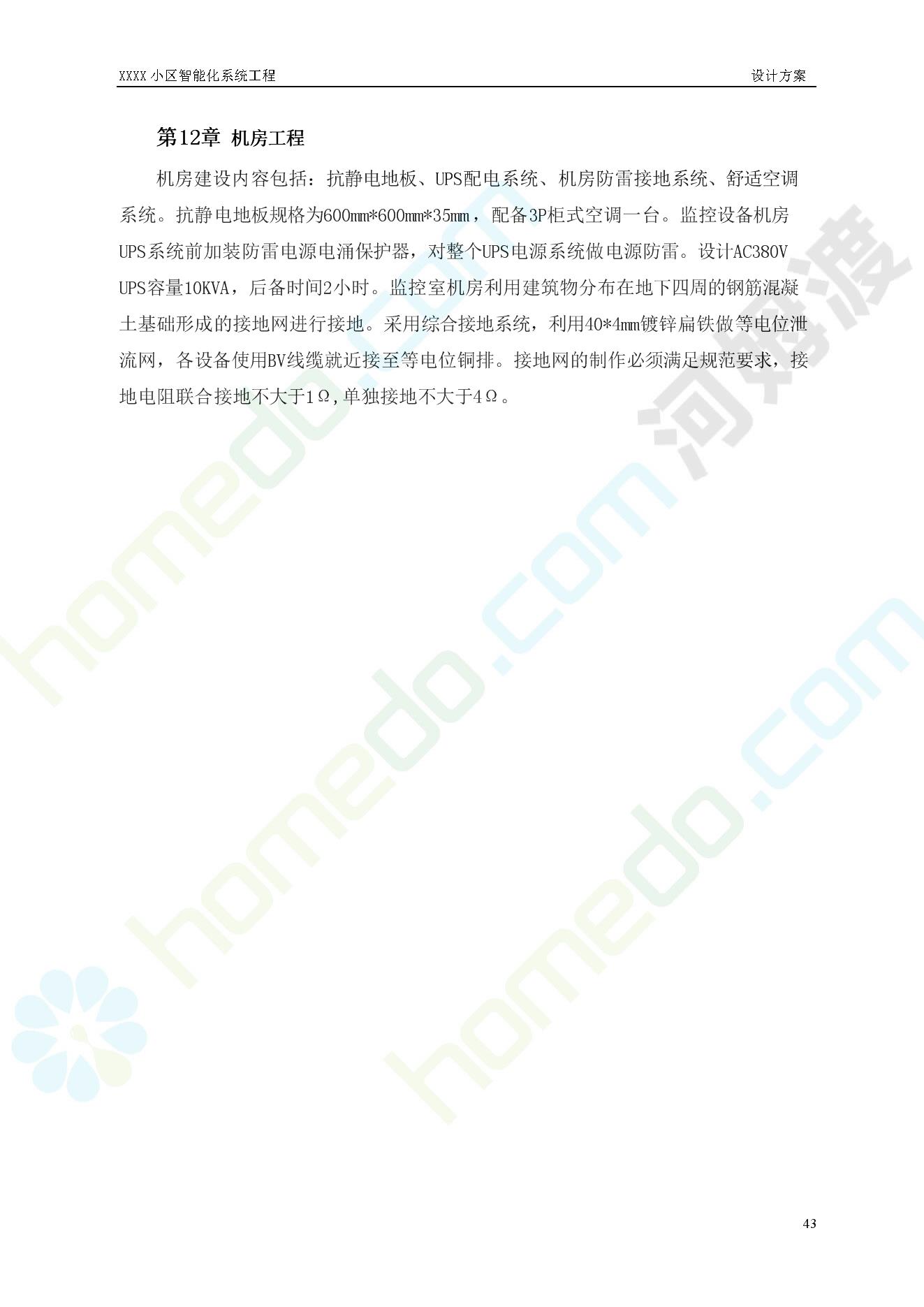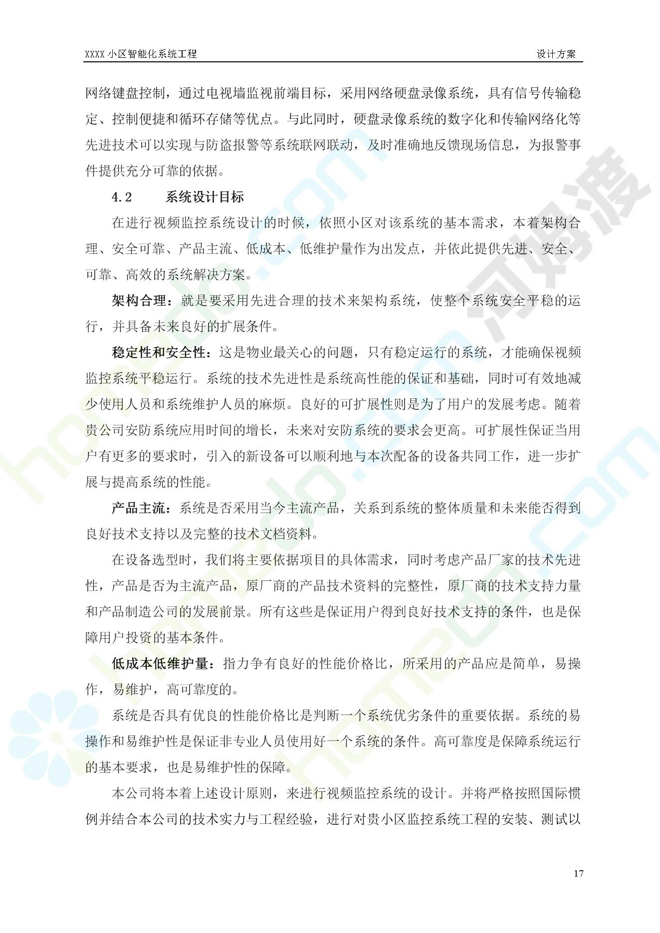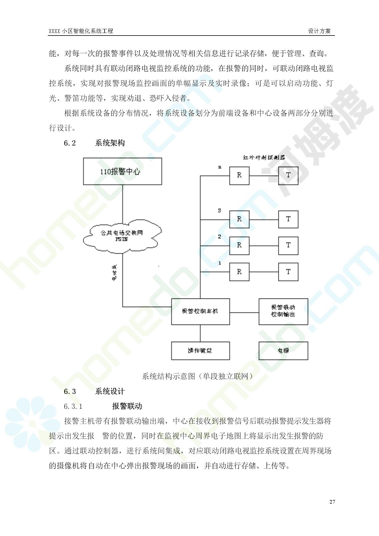 方案简介 XXXX小区,择址郑州XX区,尊踞XXXX路与XXXX交叉口向西XX米路南,XXXX置业有限公司开发建设的高端精品住宅,项目总占地面积XX亩,总建筑面积XX万平方米,由XX栋多层低密度住宅和XX栋XX高层建筑组成。 本项目按照全面规划、统一设计,局部实施,并能各自独立运行的原则考虑,最终小区全面竣工综合联网组成一个完整的智能化网络系统。