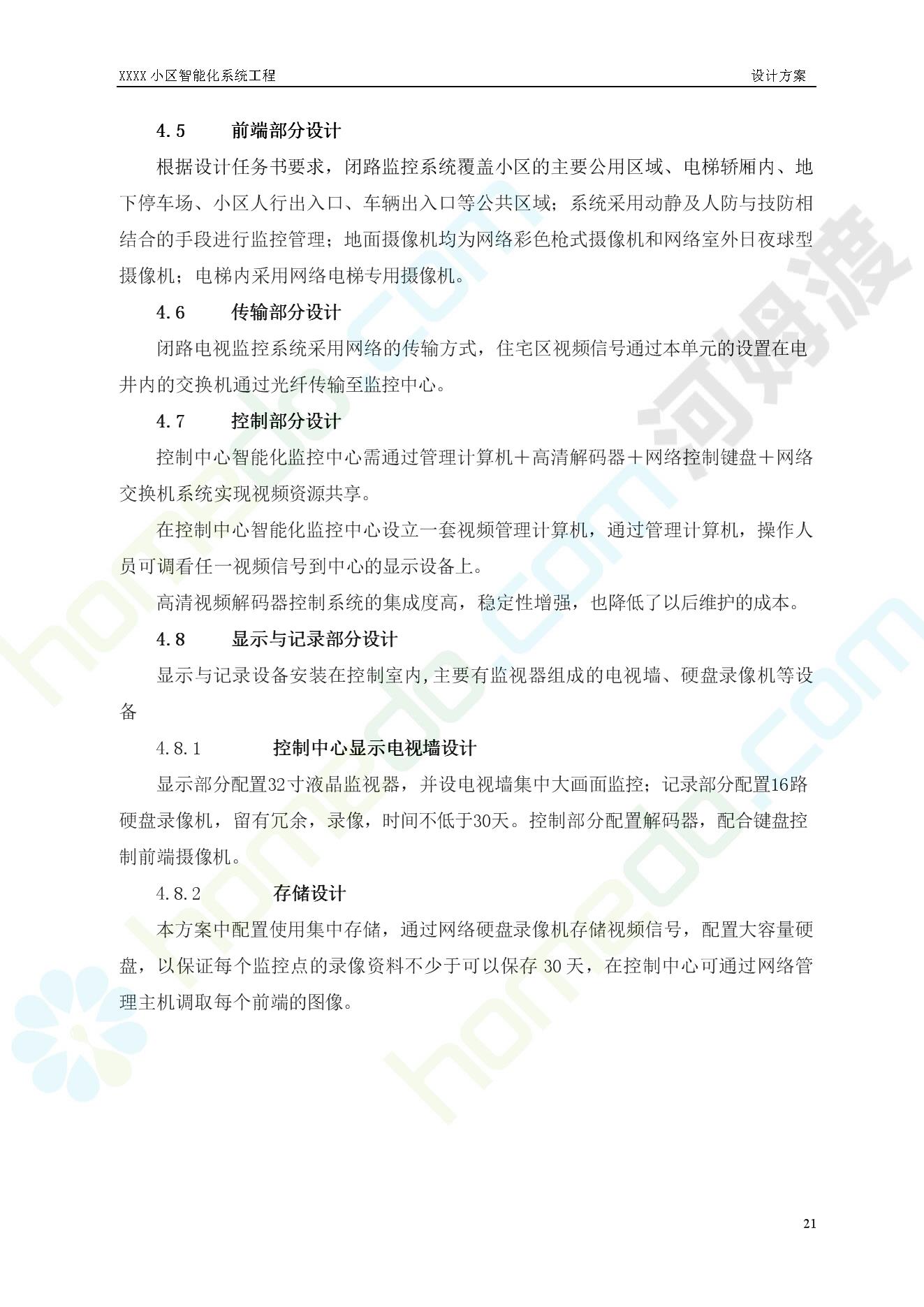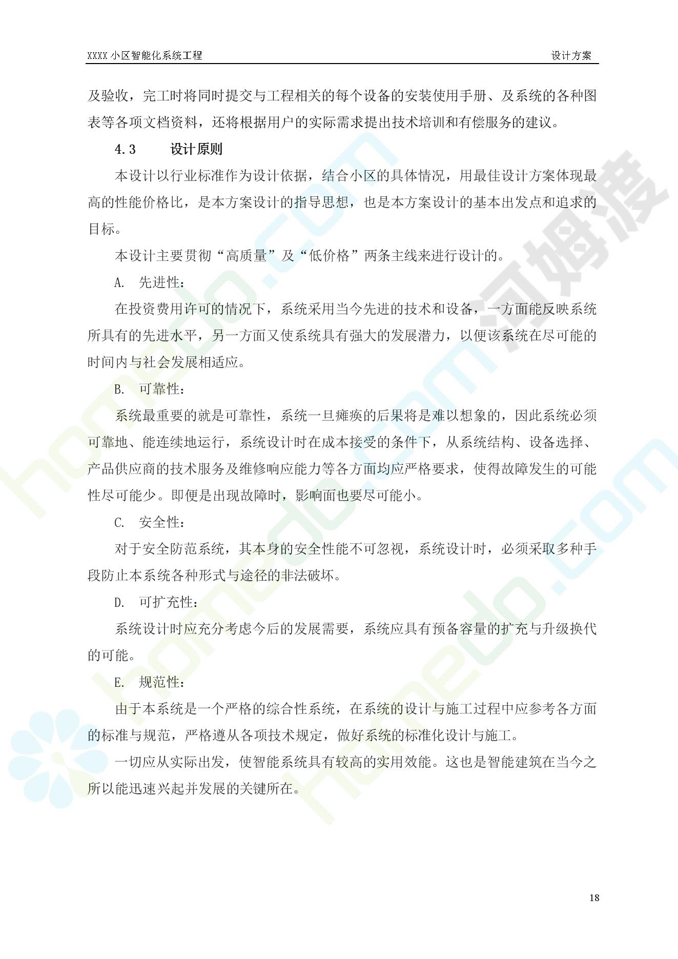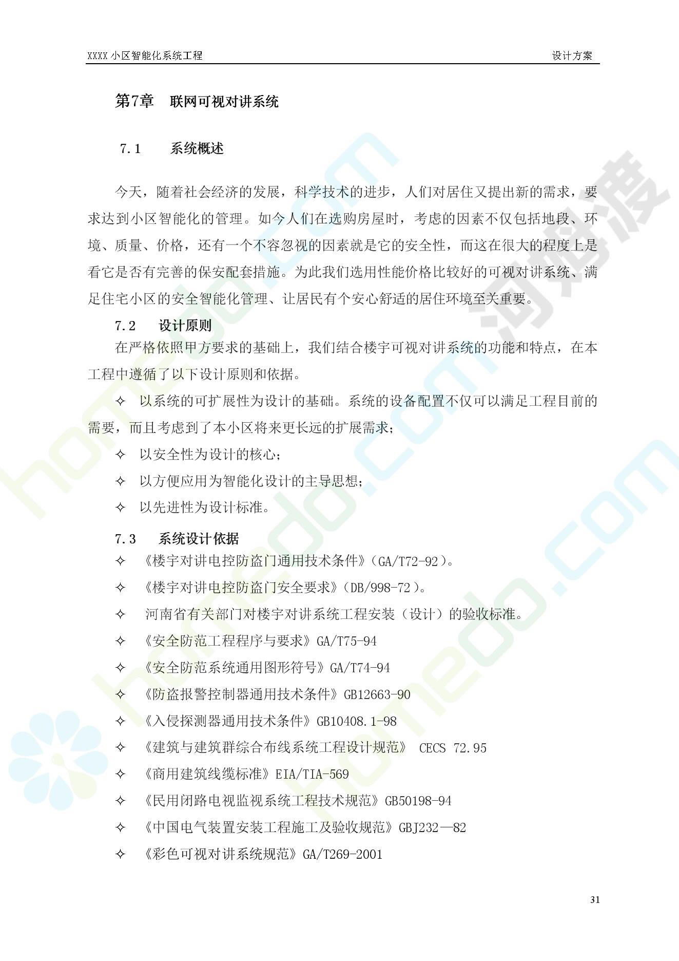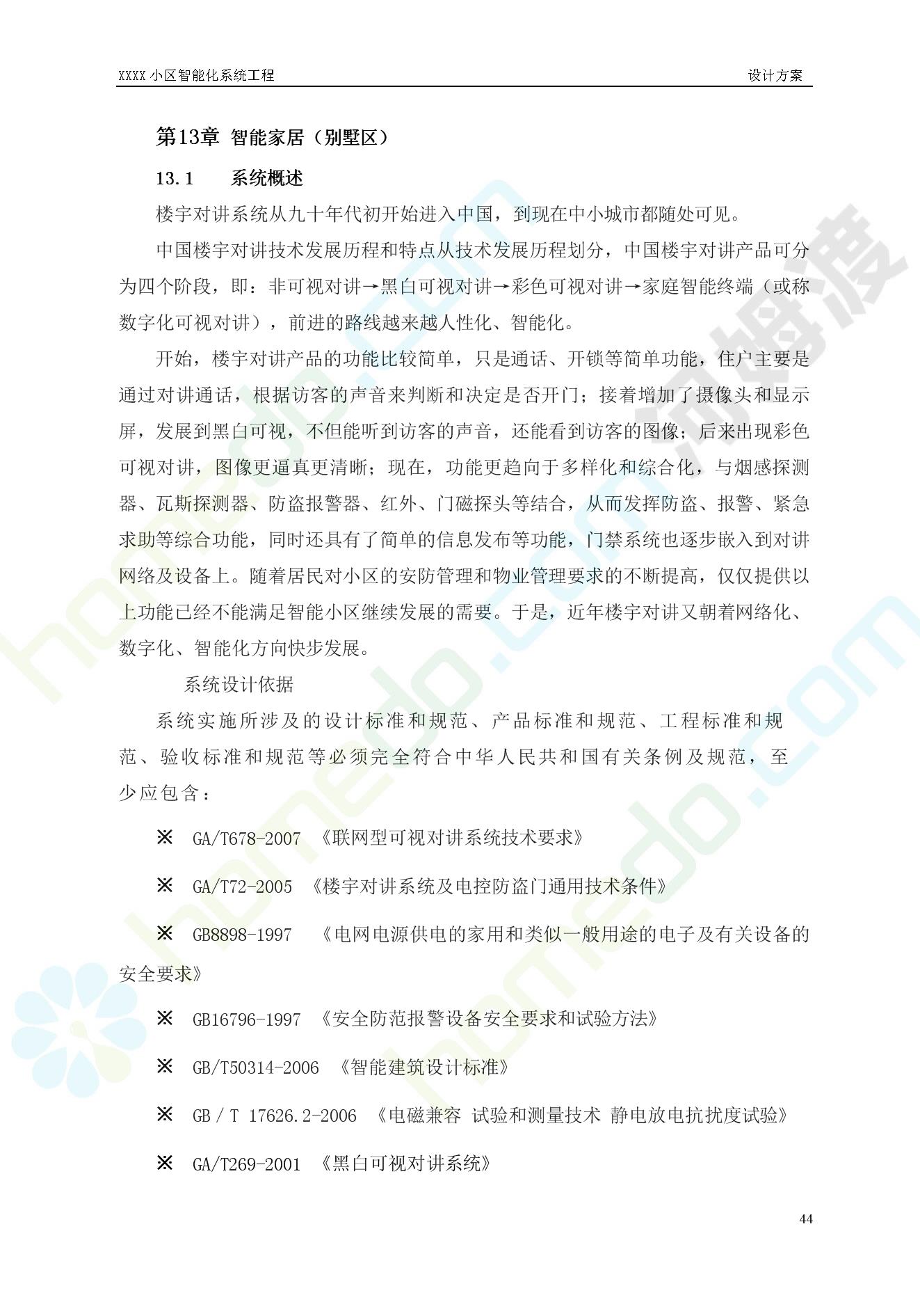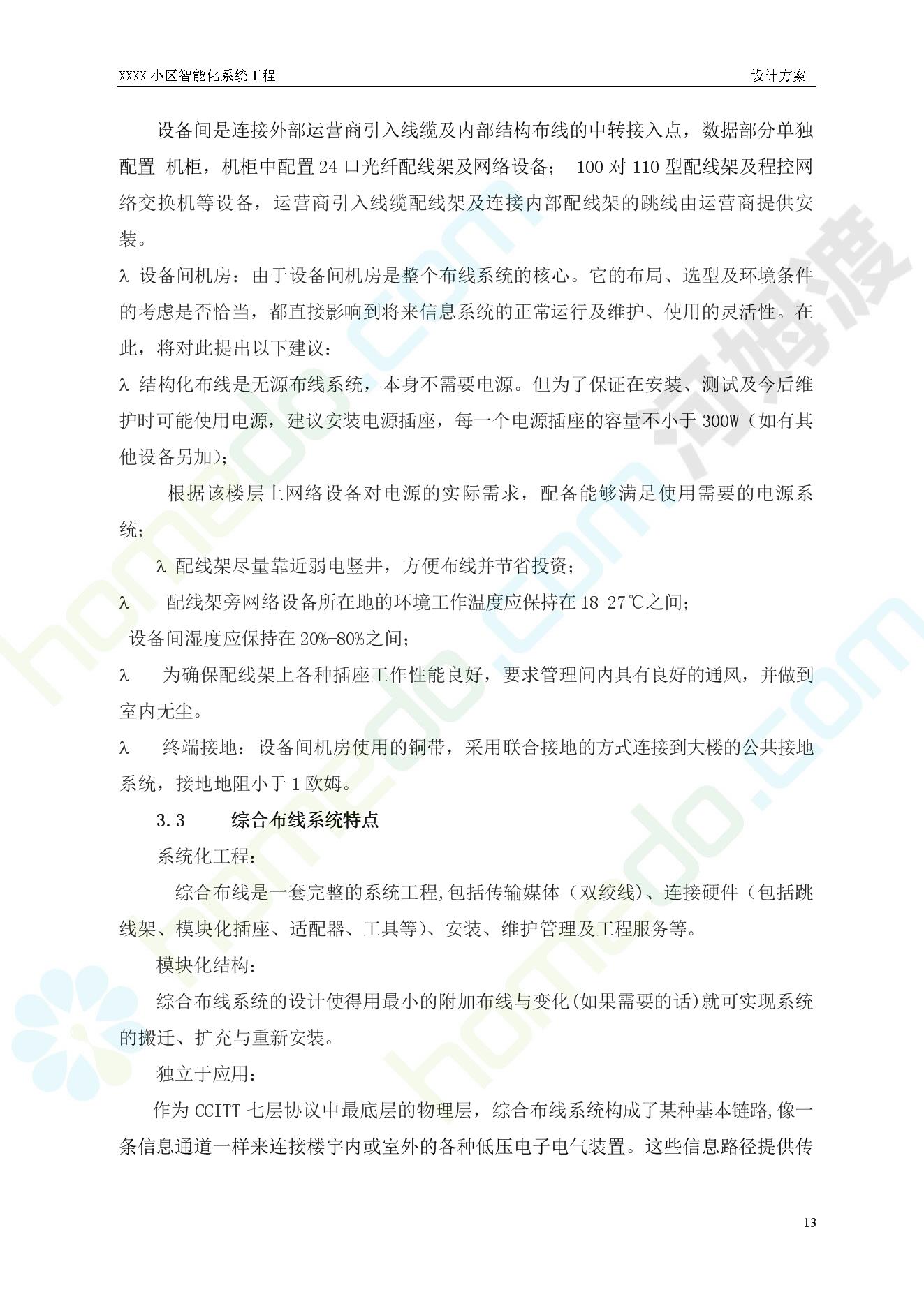 方案简介 XXXX小区,择址郑州XX区,尊踞XXXX路与XXXX交叉口向西XX米路南,XXXX置业有限公司开发建设的高端精品住宅,项目总占地面积XX亩,总建筑面积XX万平方米,由XX栋多层低密度住宅和XX栋XX高层建筑组成。 本项目按照全面规划、统一设计,局部实施,并能各自独立运行的原则考虑,最终小区全面竣工综合联网组成一个完整的智能化网络系统。
