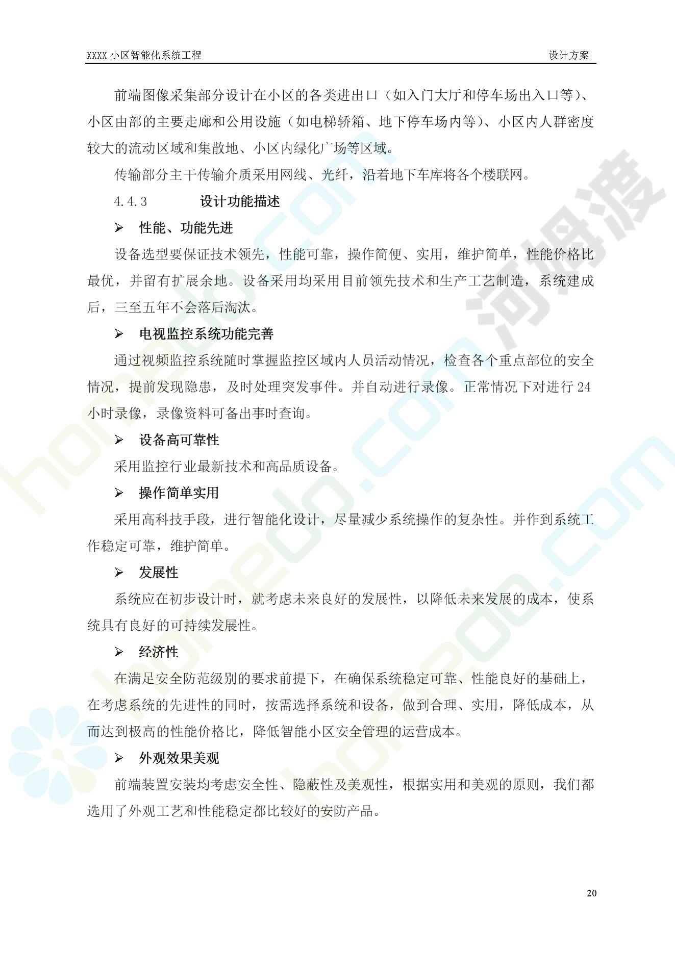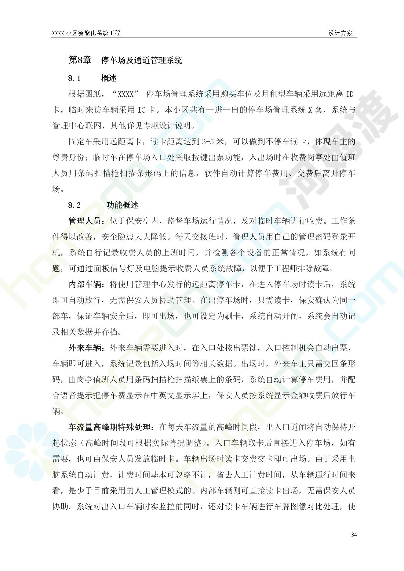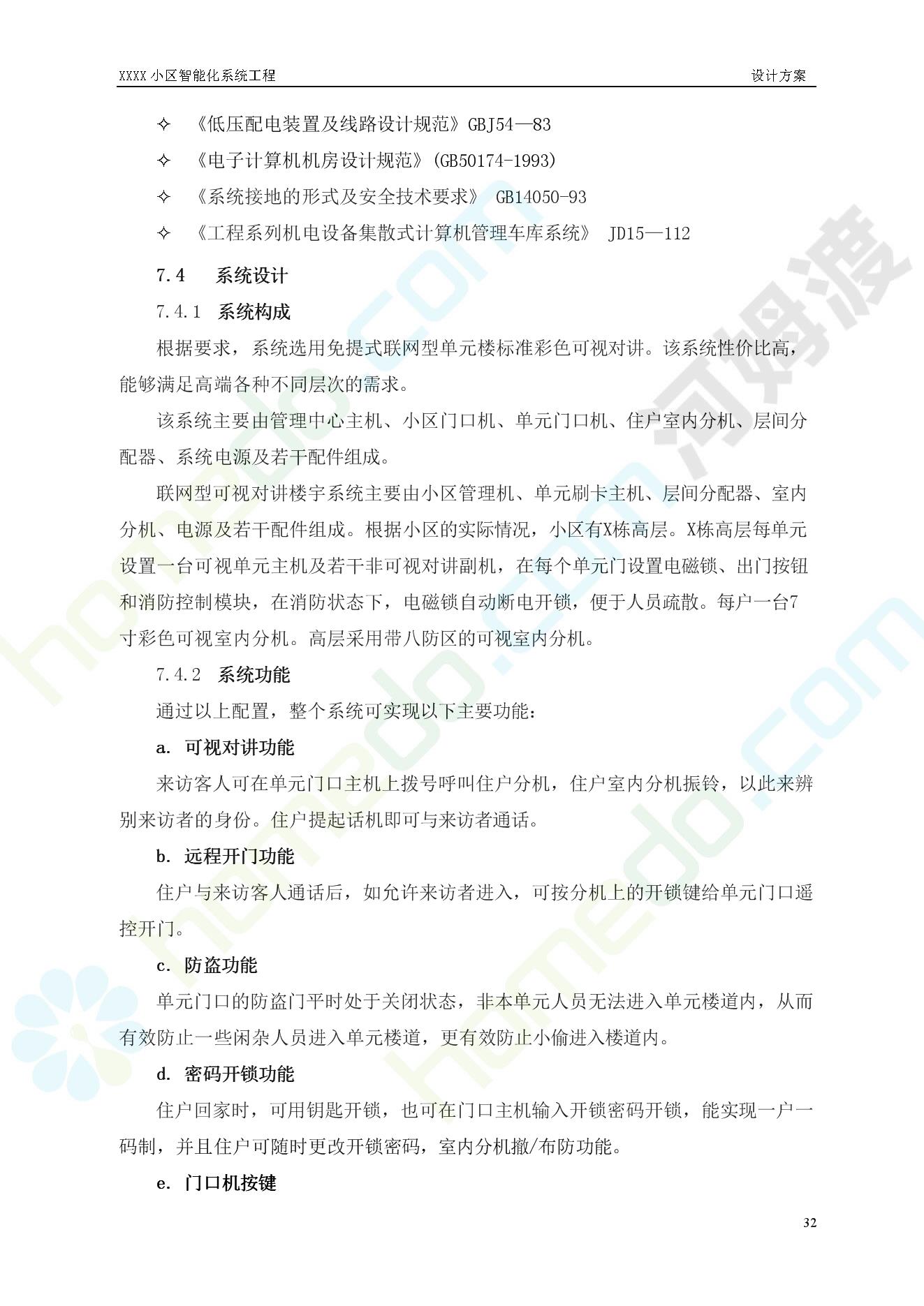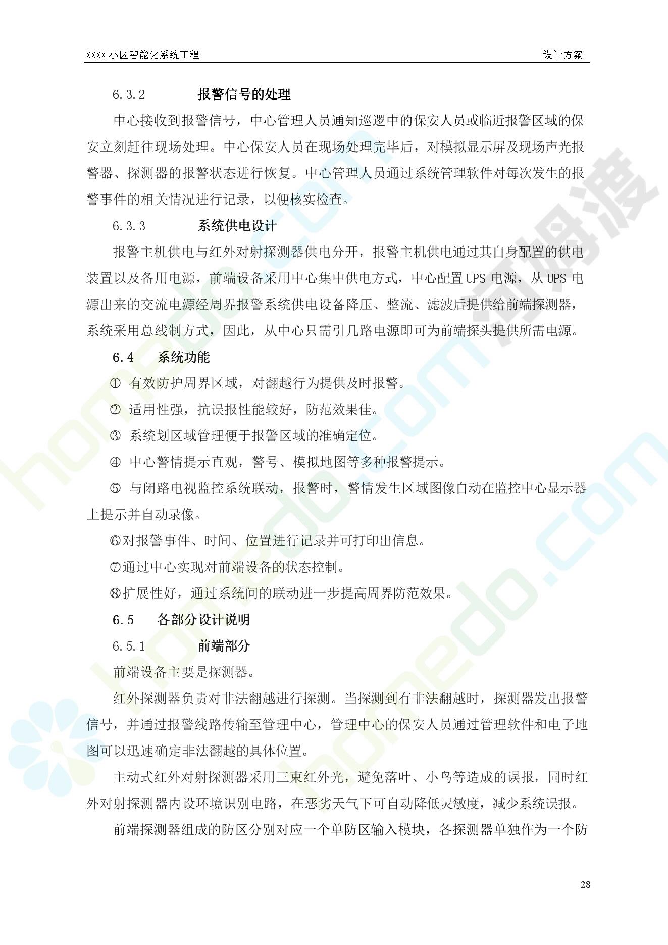 方案简介 XXXX小区,择址郑州XX区,尊踞XXXX路与XXXX交叉口向西XX米路南,XXXX置业有限公司开发建设的高端精品住宅,项目总占地面积XX亩,总建筑面积XX万平方米,由XX栋多层低密度住宅和XX栋XX高层建筑组成。 本项目按照全面规划、统一设计,局部实施,并能各自独立运行的原则考虑,最终小区全面竣工综合联网组成一个完整的智能化网络系统。