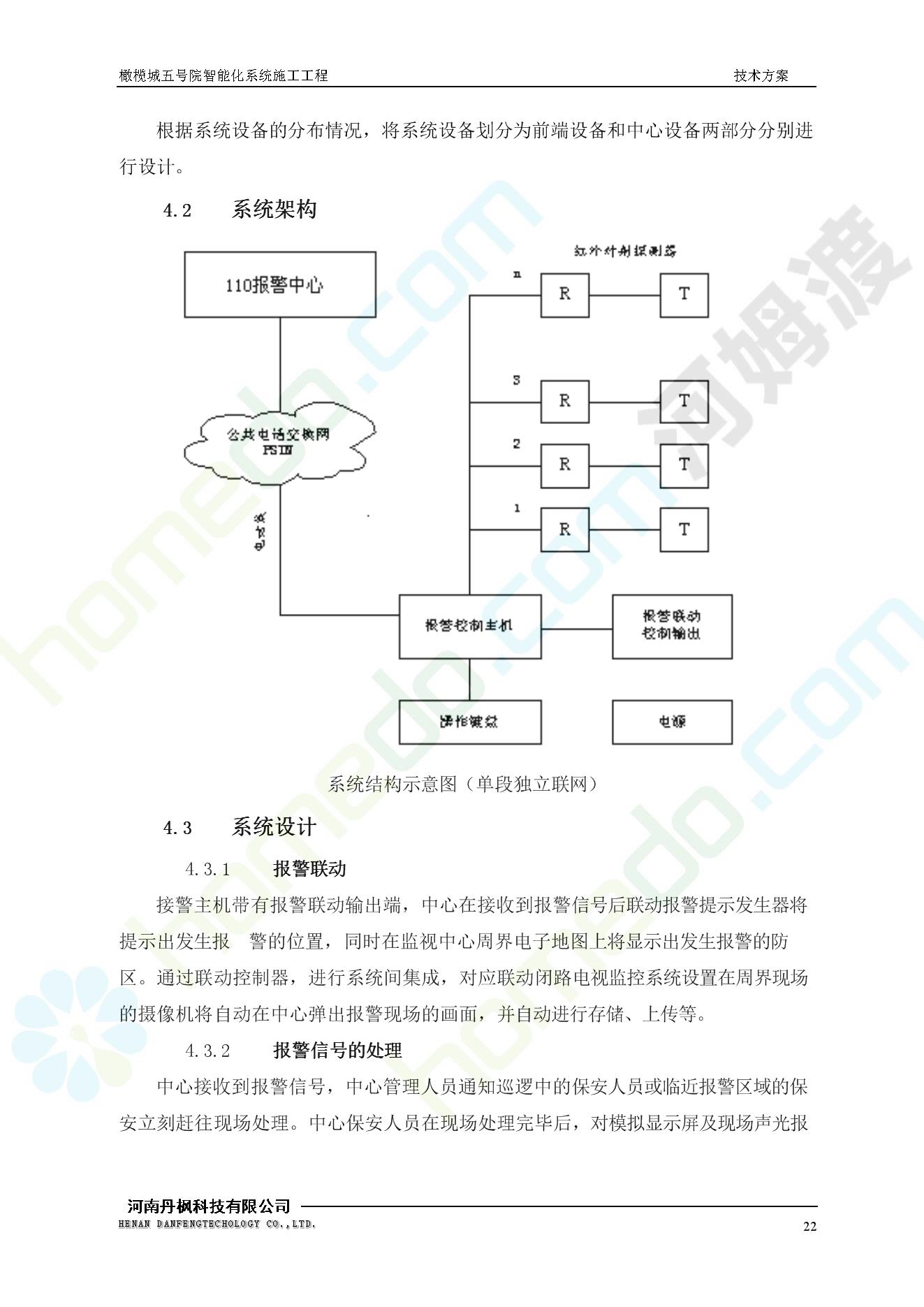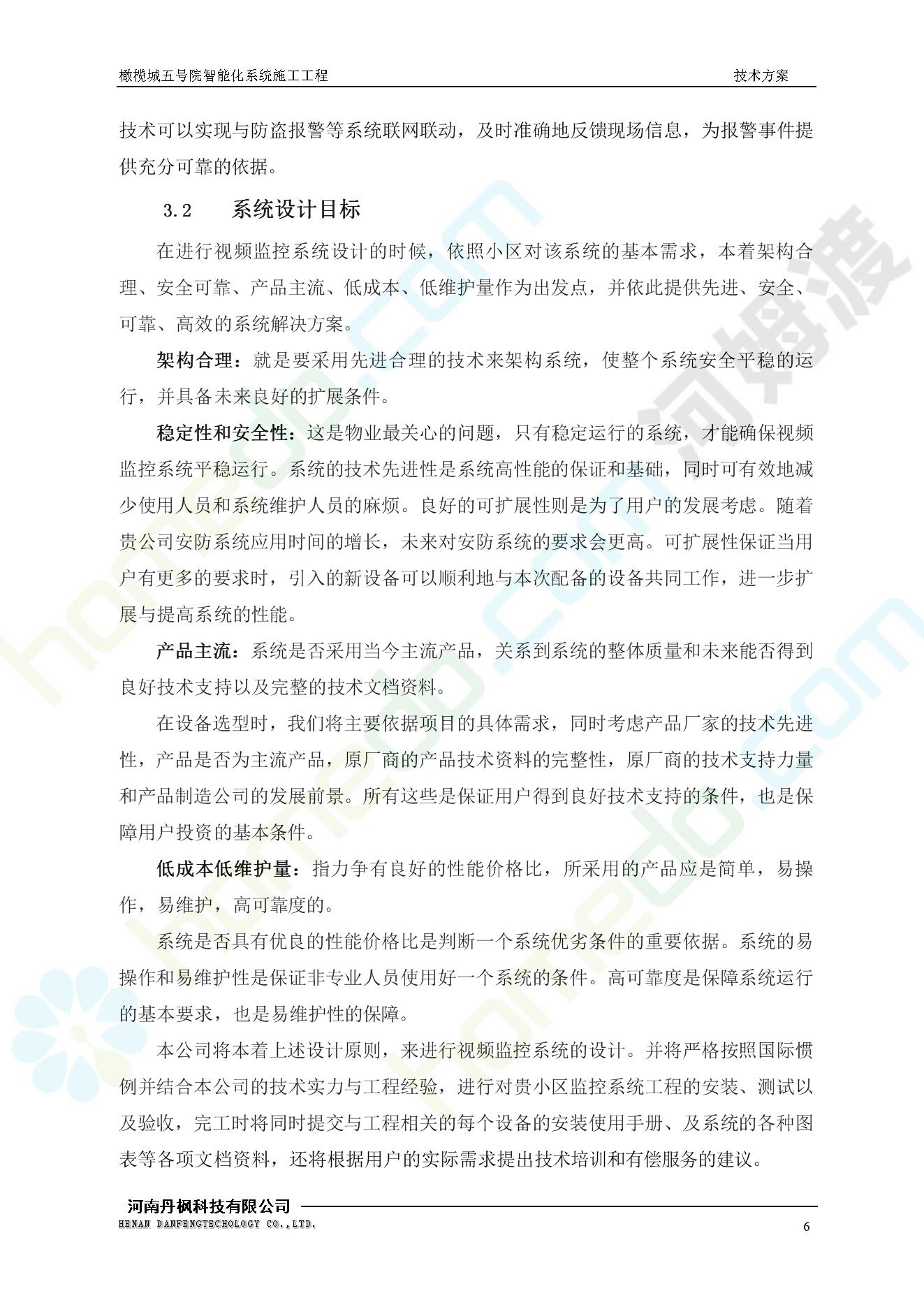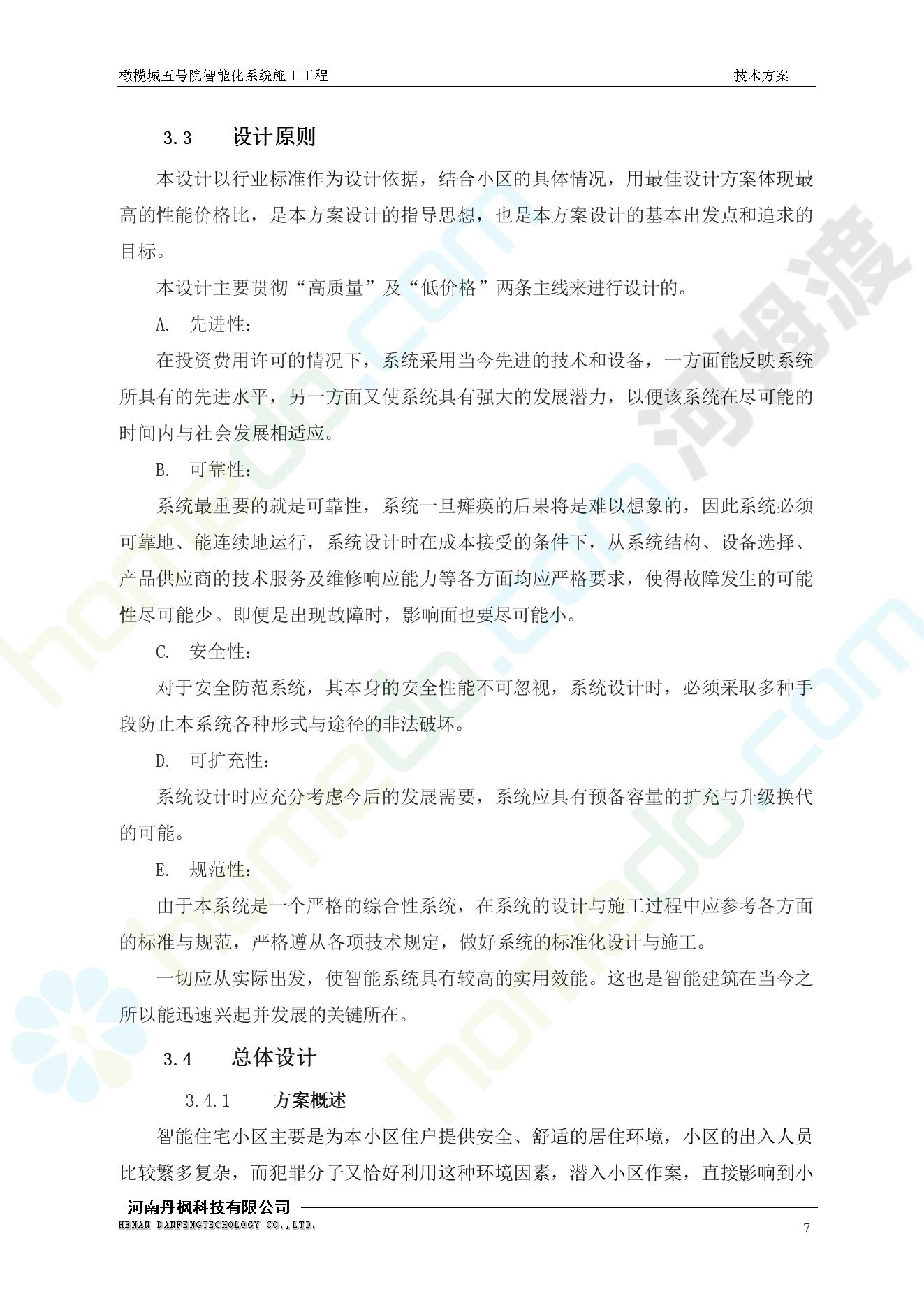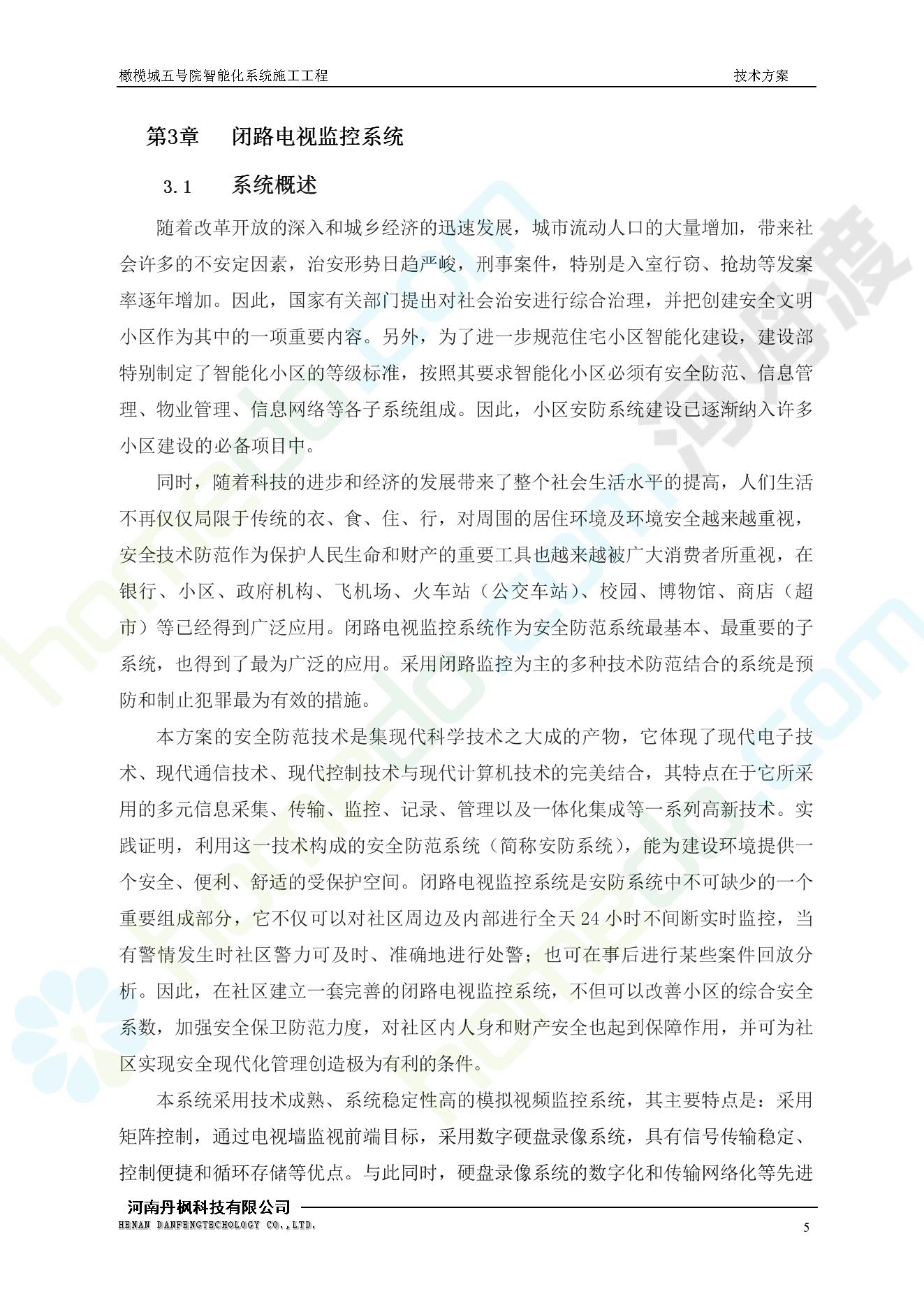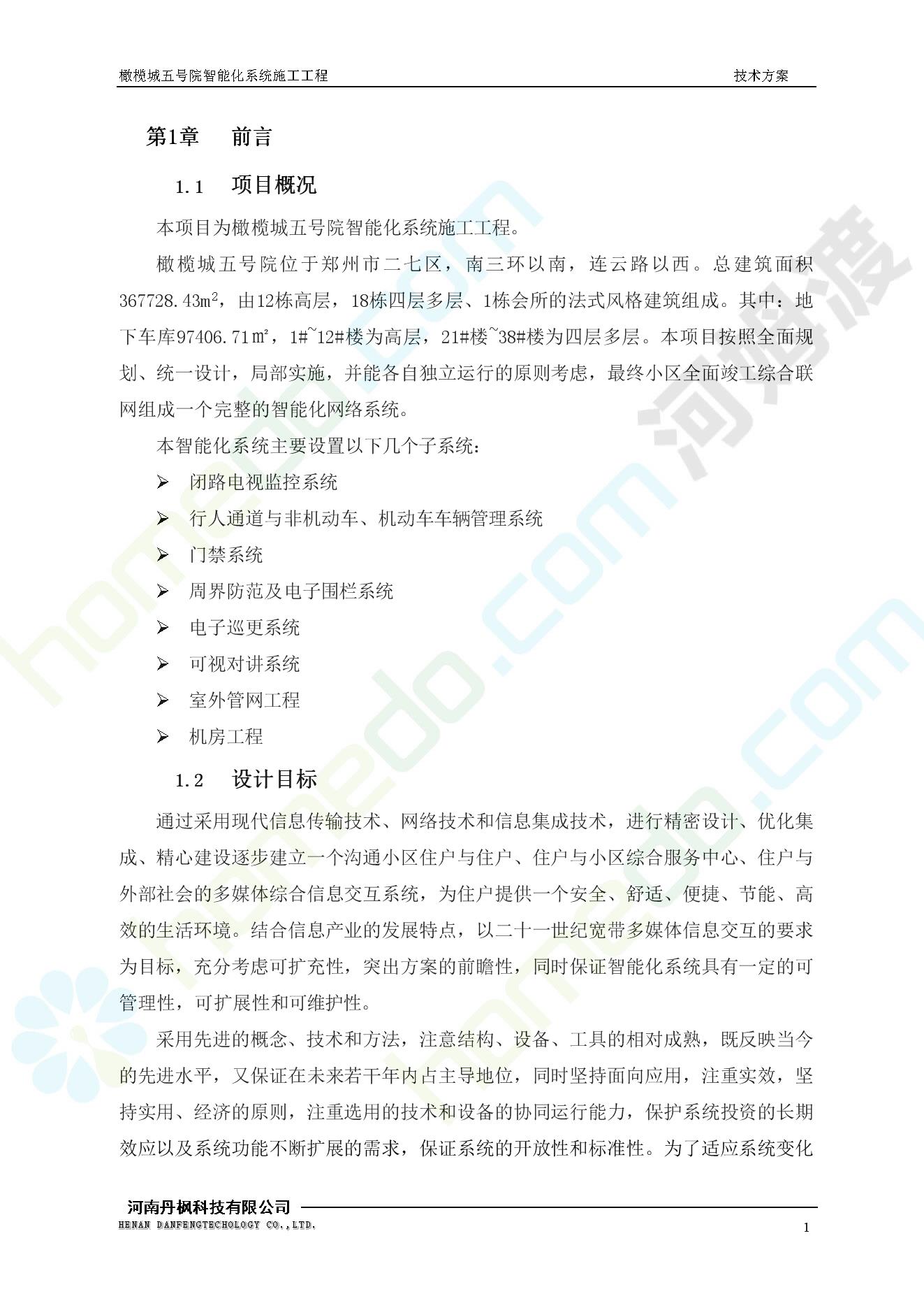 方案简介 本项目为橄榄城五号院智能化系统施工工程。 橄榄城五号院位于郑州市二七区,南三环以南,连云路以西。总建筑面积367728.43m2,由12栋高层,18栋四层多层、1栋会所的法式风格建筑组成。其中:地下车库97406.71㎡,1#~12#楼为高层,21#楼~38#楼为四层多层。本项目按照全面规划、统一设计,局部实施,并能各自独立运行的原则考虑,最终小区全面竣工综合联网组成一个完整的智能化网络系统。