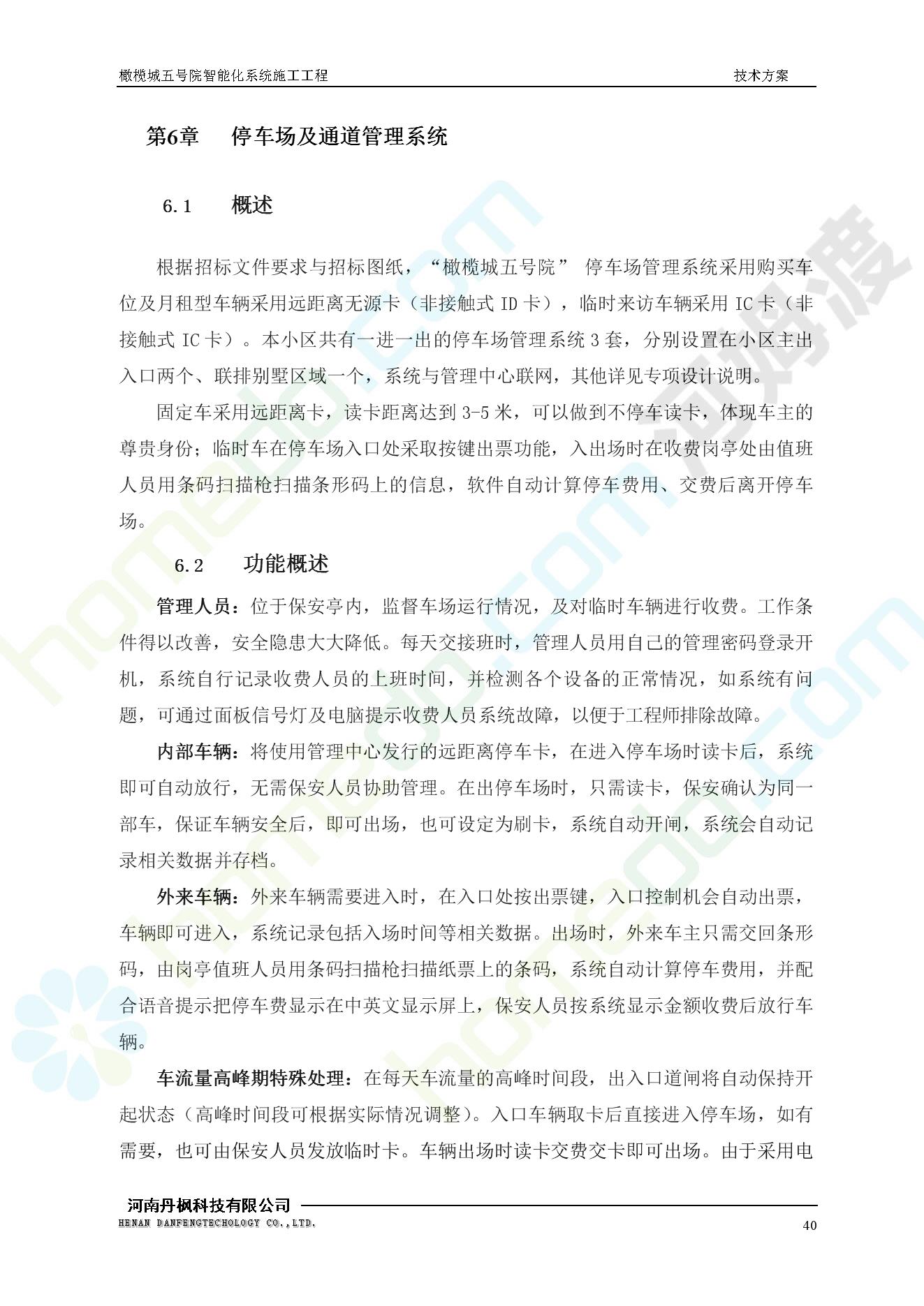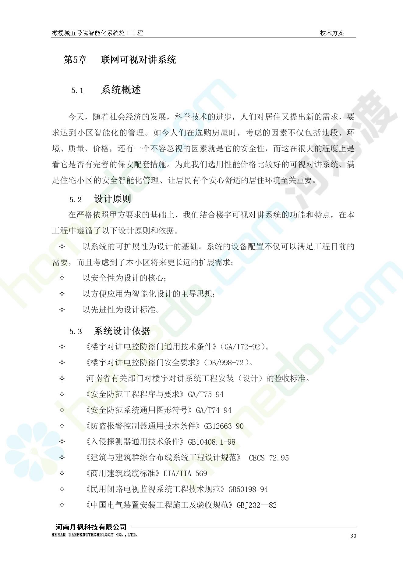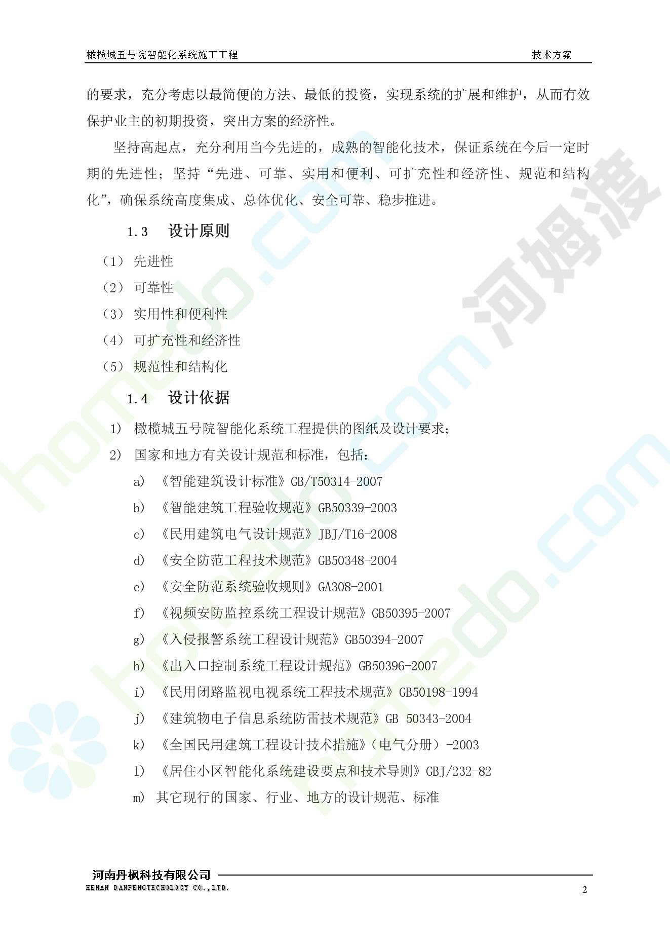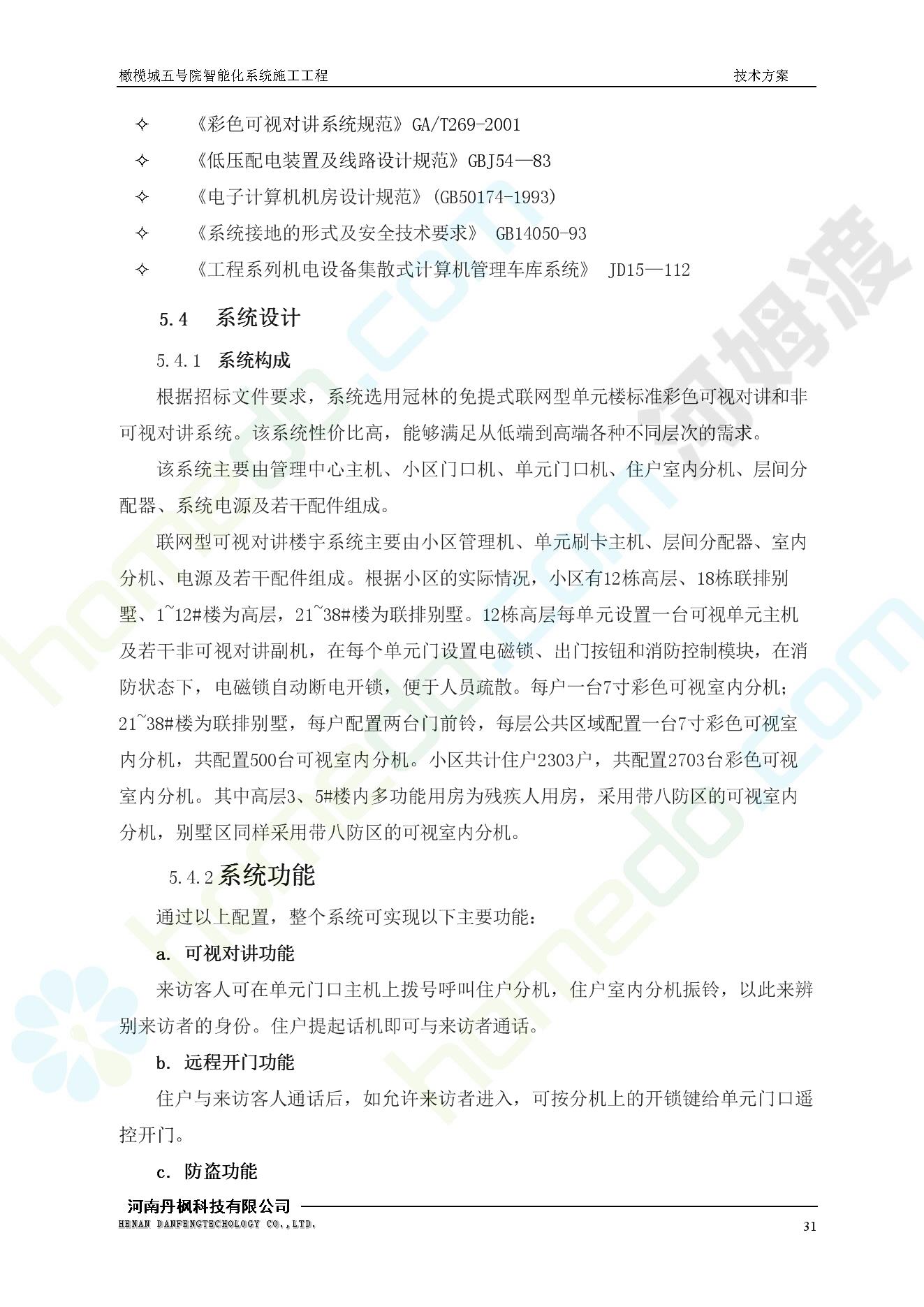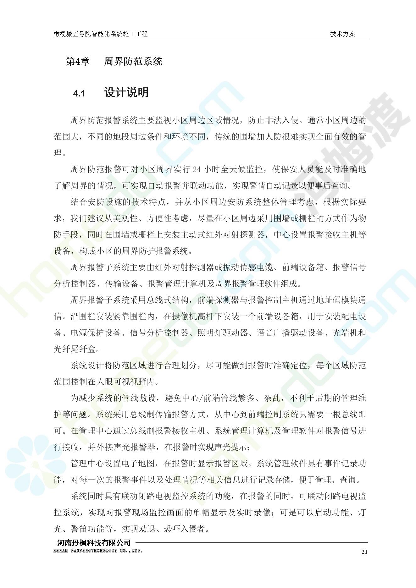 方案简介 本项目为橄榄城五号院智能化系统施工工程。 橄榄城五号院位于郑州市二七区,南三环以南,连云路以西。总建筑面积367728.43m2,由12栋高层,18栋四层多层、1栋会所的法式风格建筑组成。其中:地下车库97406.71㎡,1#~12#楼为高层,21#楼~38#楼为四层多层。本项目按照全面规划、统一设计,局部实施,并能各自独立运行的原则考虑,最终小区全面竣工综合联网组成一个完整的智能化网络系统。