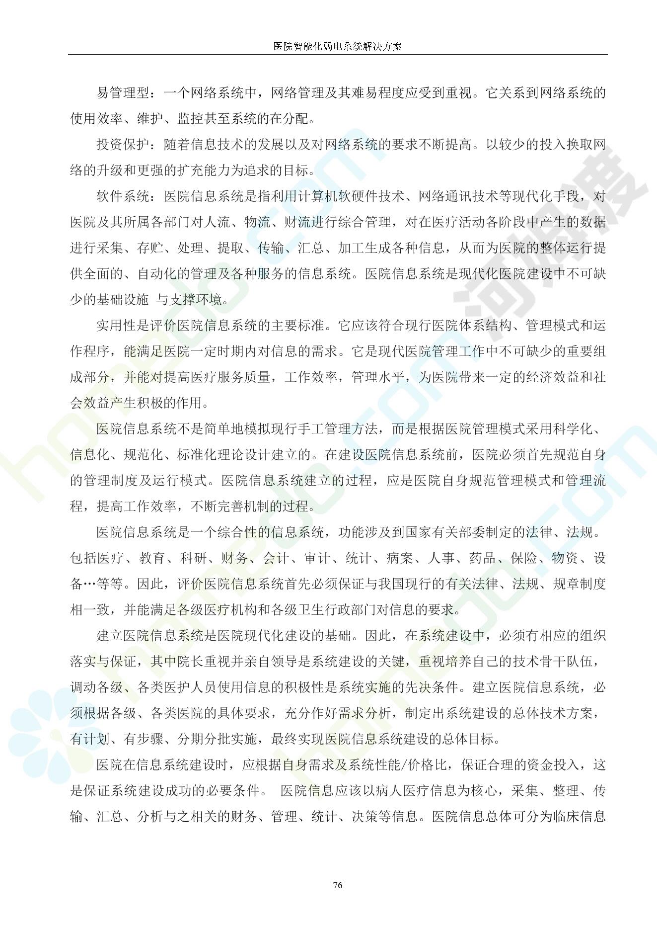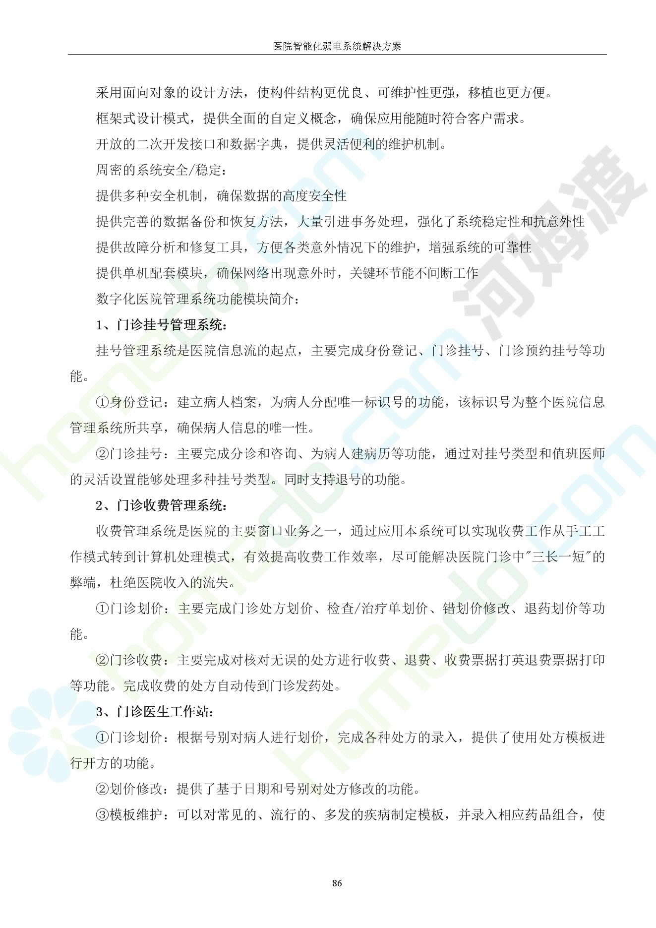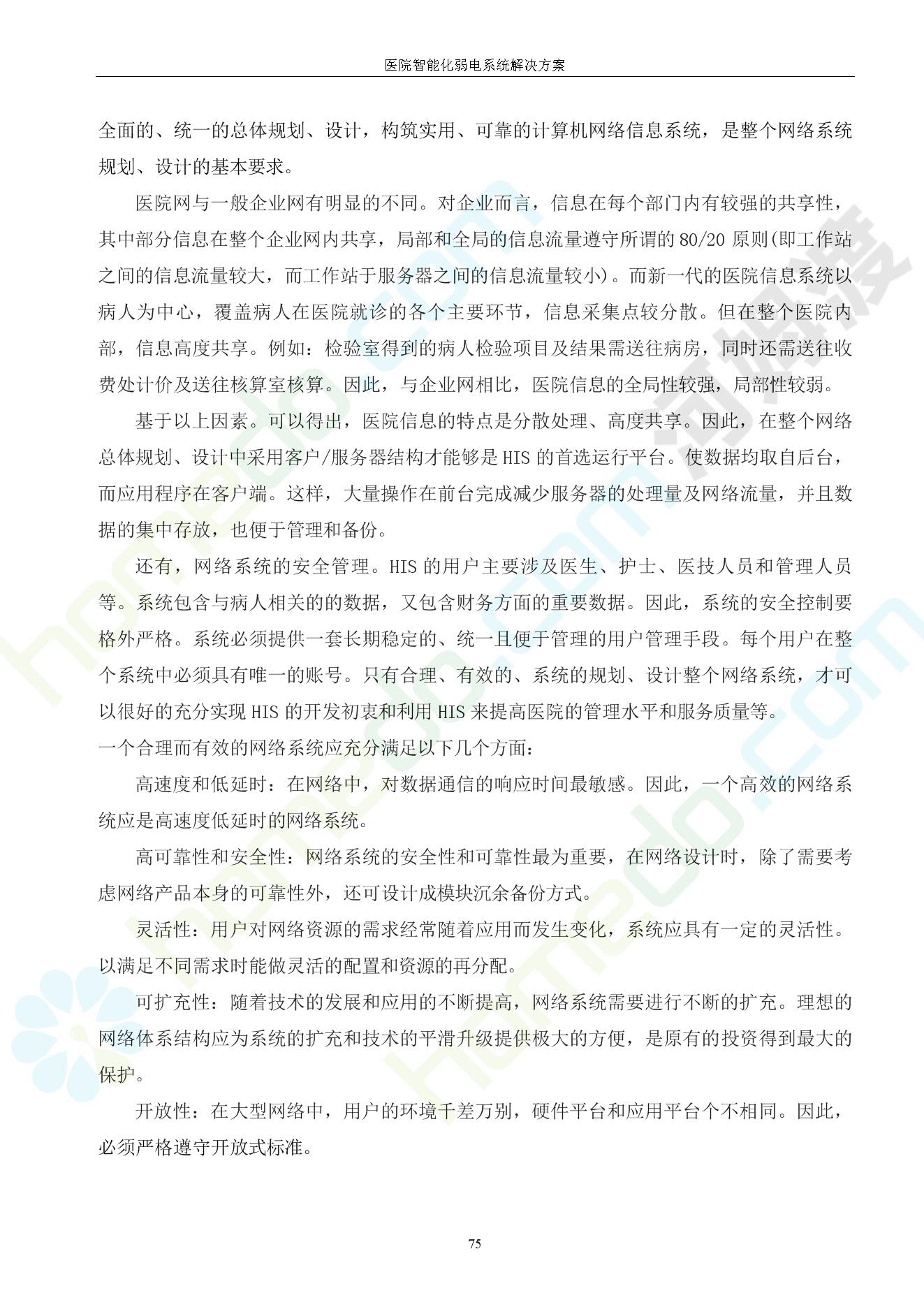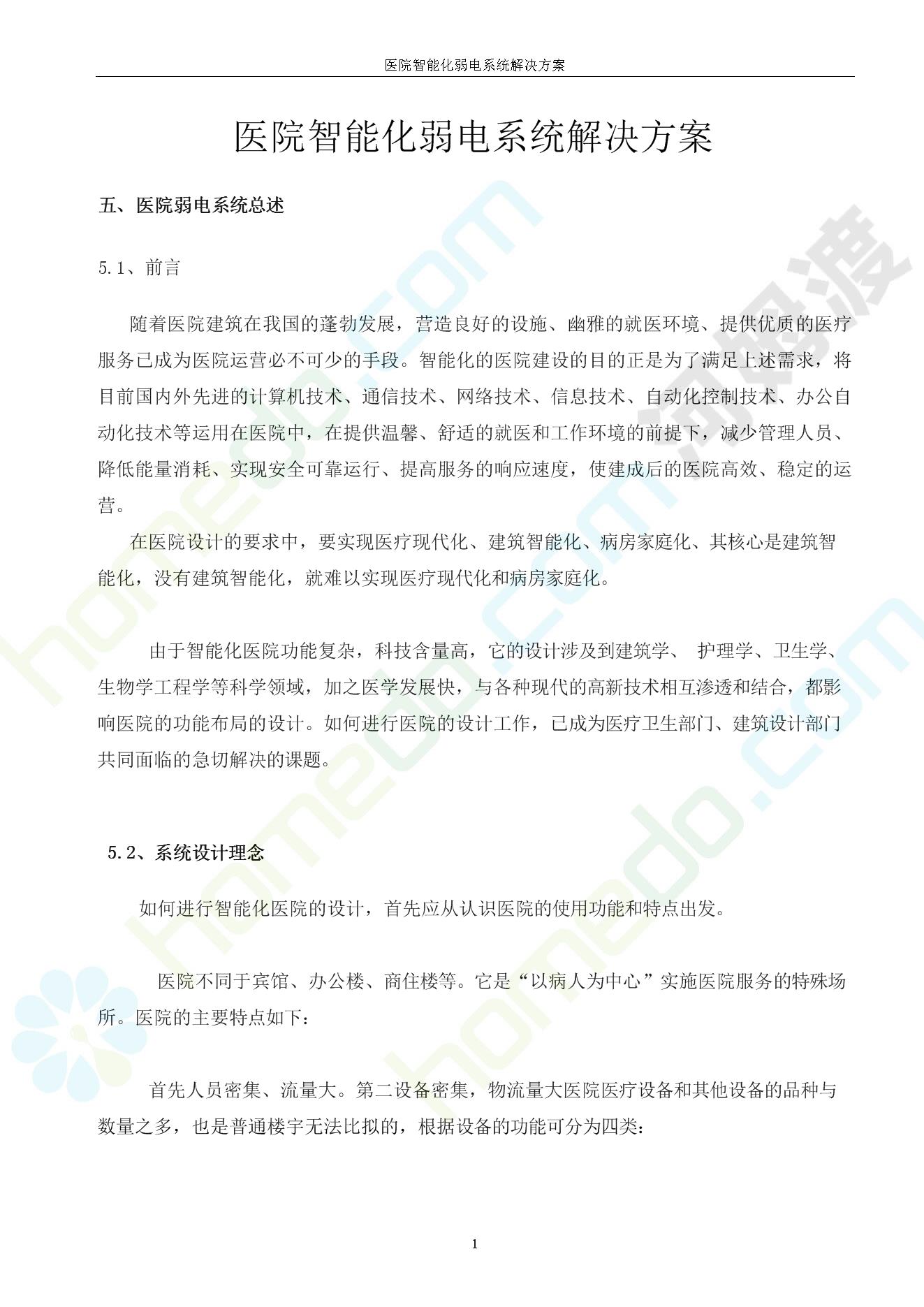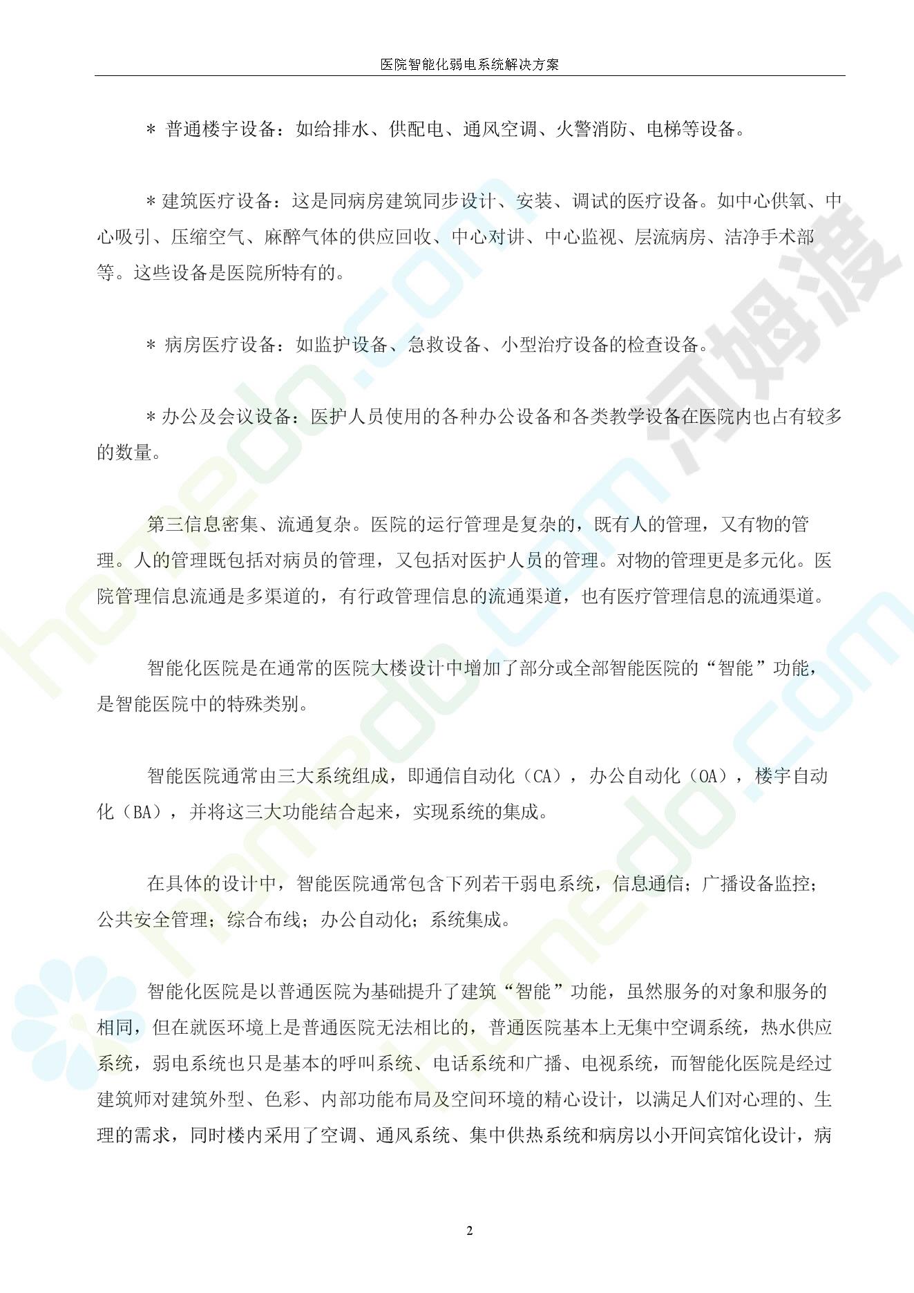 方案简介 由于智能化医院功能复杂,科技含量高,它的设计涉及到建筑学、 护理学、卫生学、生物学工程学等科学领域,加之医学发展快,与各种现代的高新技术相互渗透和结合,都影响医院的功能布局的设计
