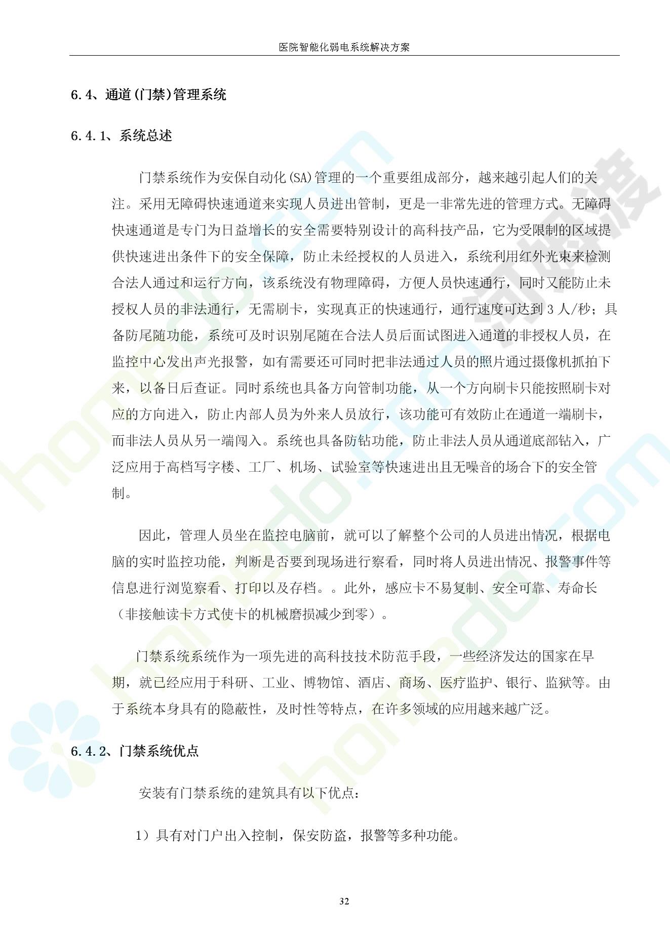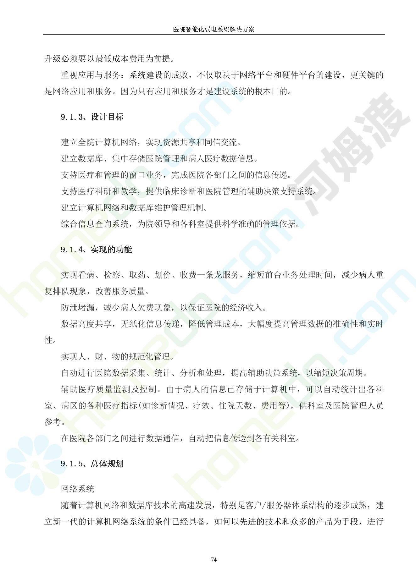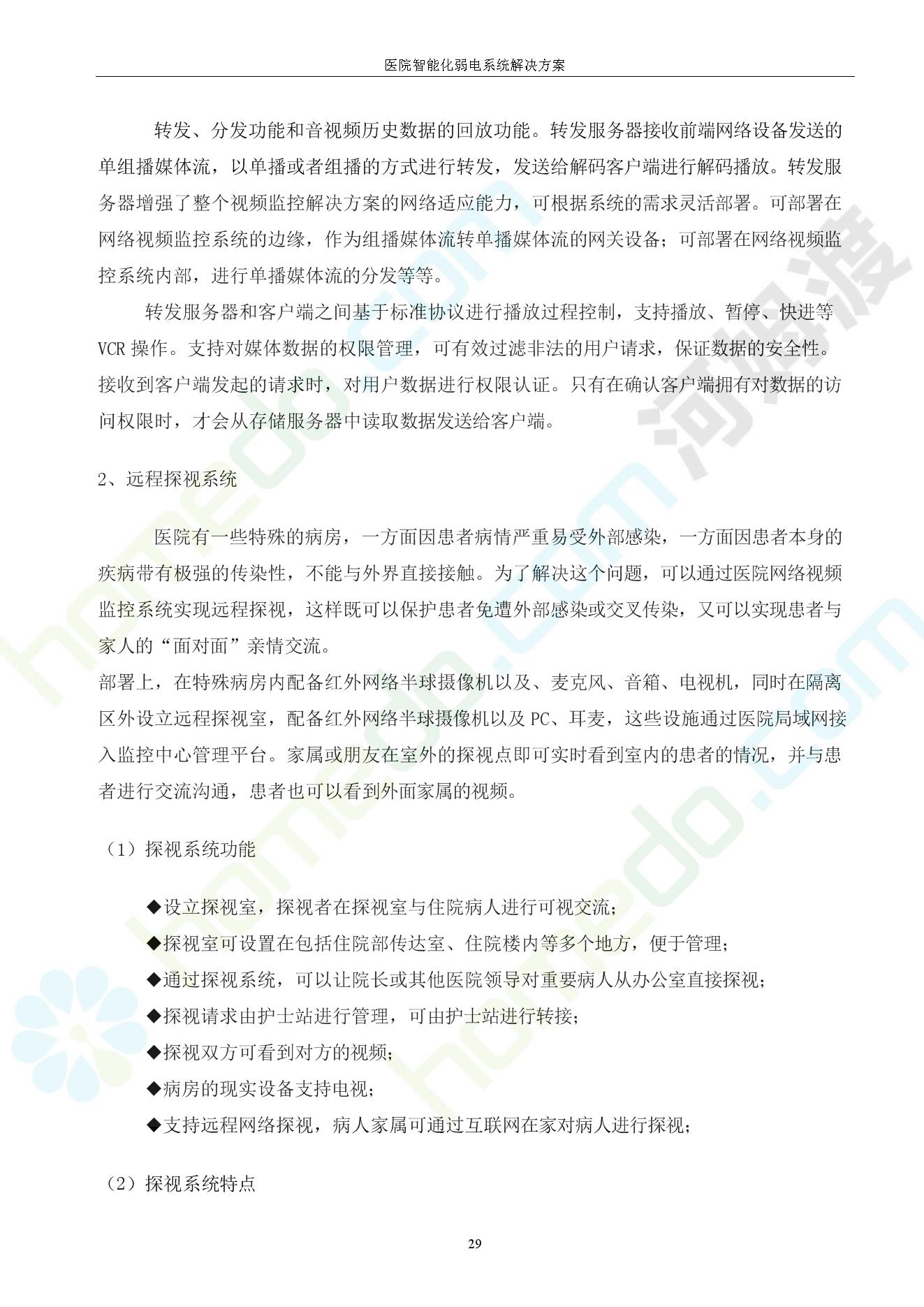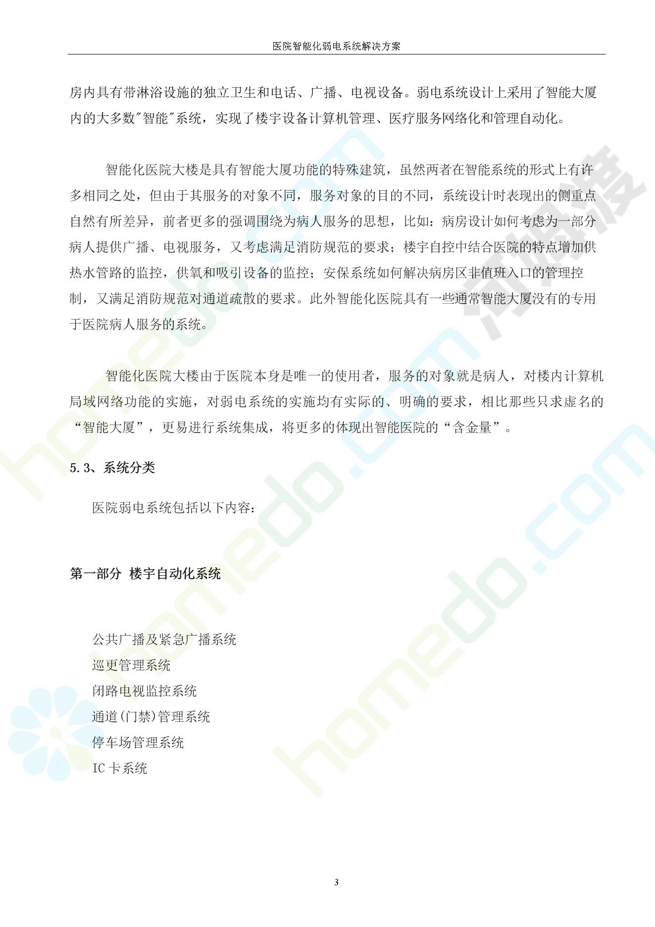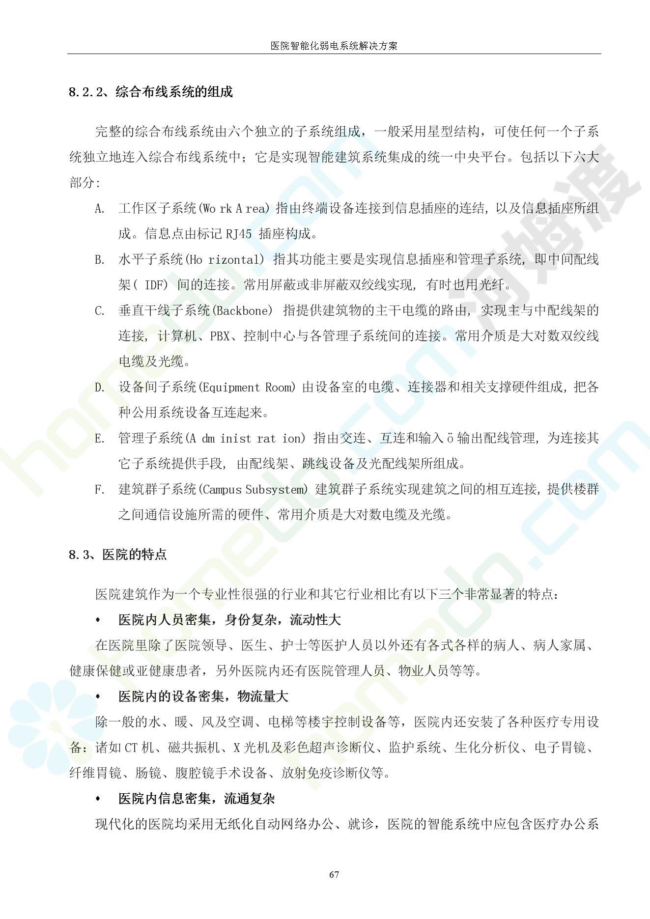 方案简介 由于智能化医院功能复杂,科技含量高,它的设计涉及到建筑学、 护理学、卫生学、生物学工程学等科学领域,加之医学发展快,与各种现代的高新技术相互渗透和结合,都影响医院的功能布局的设计