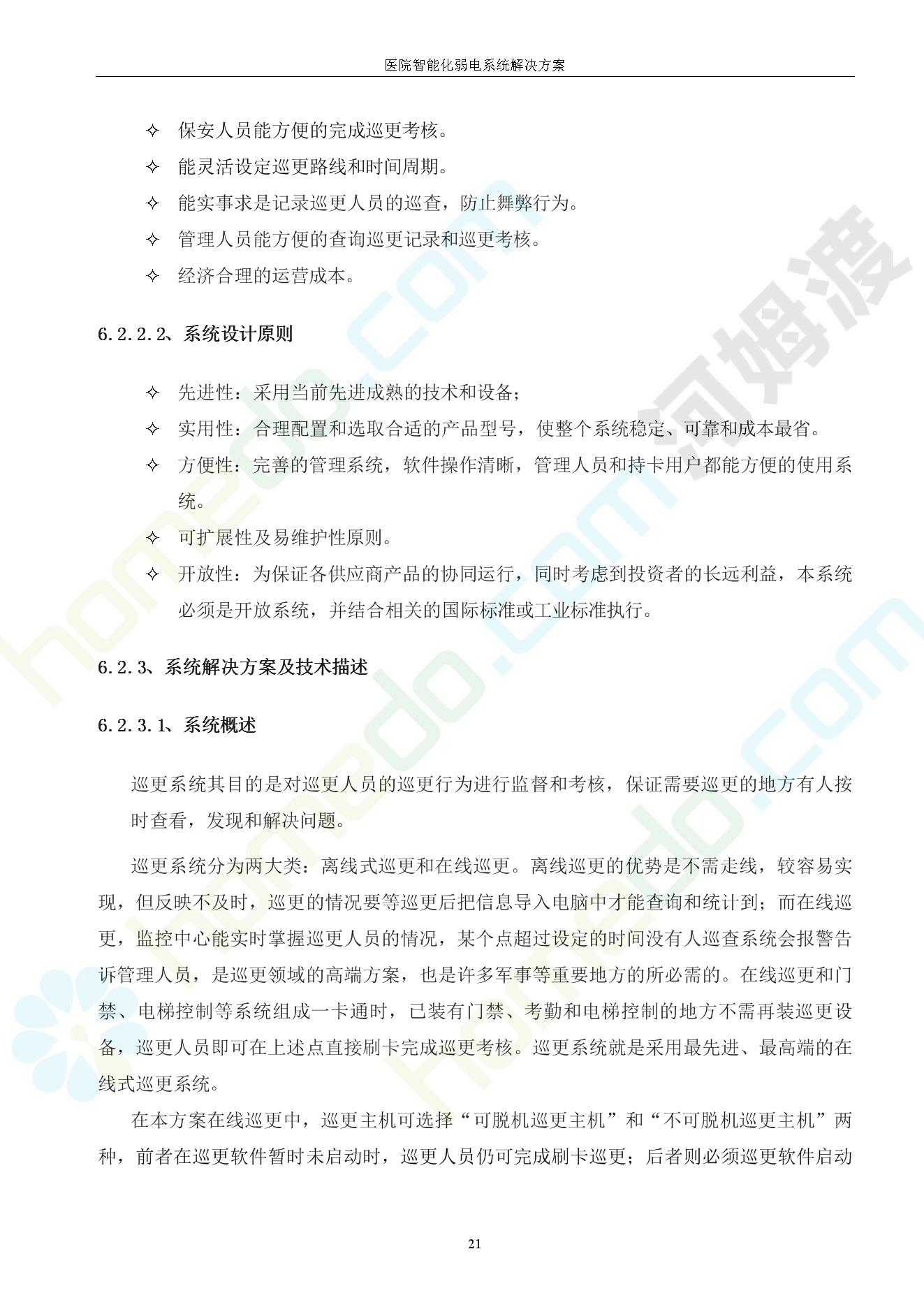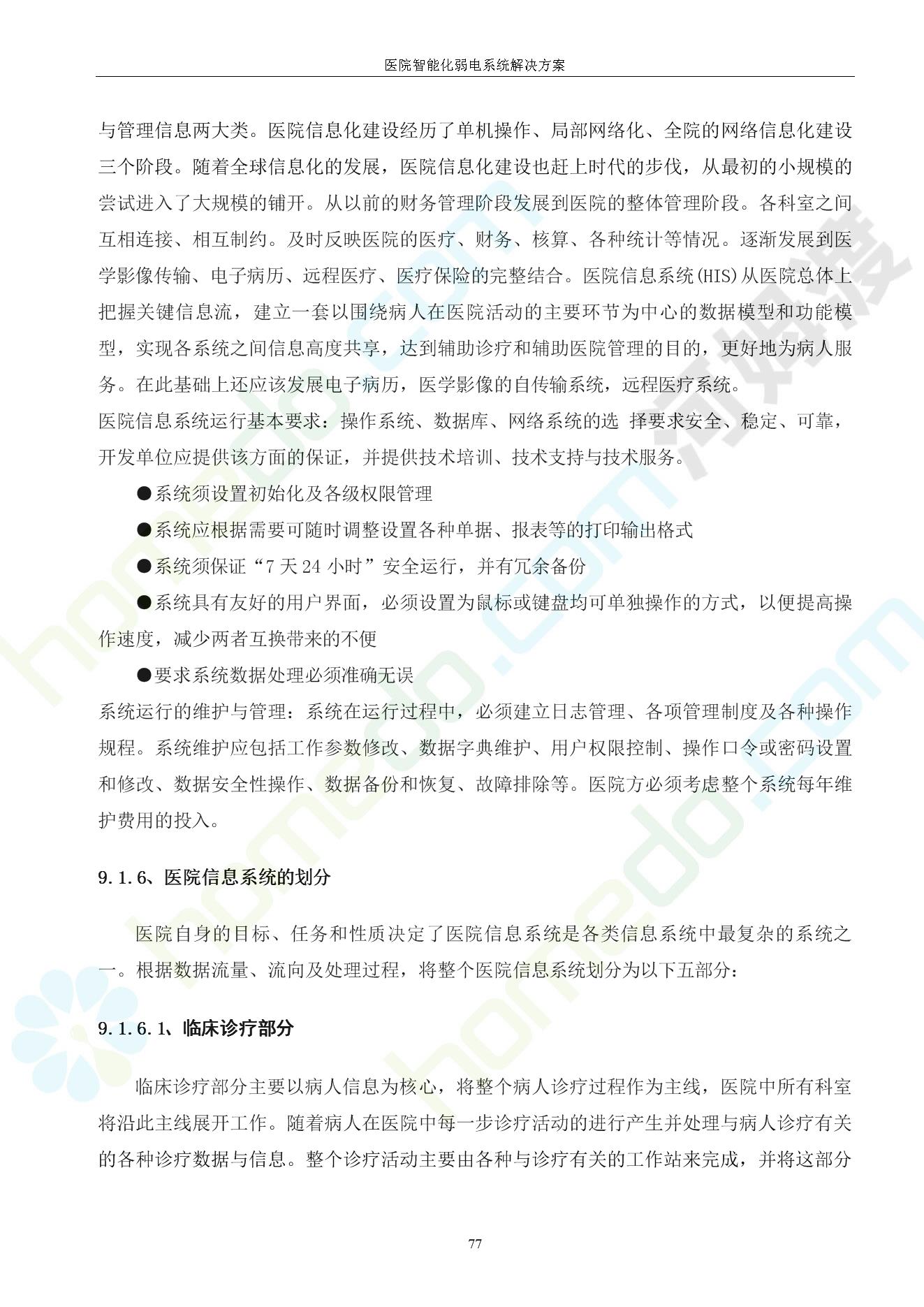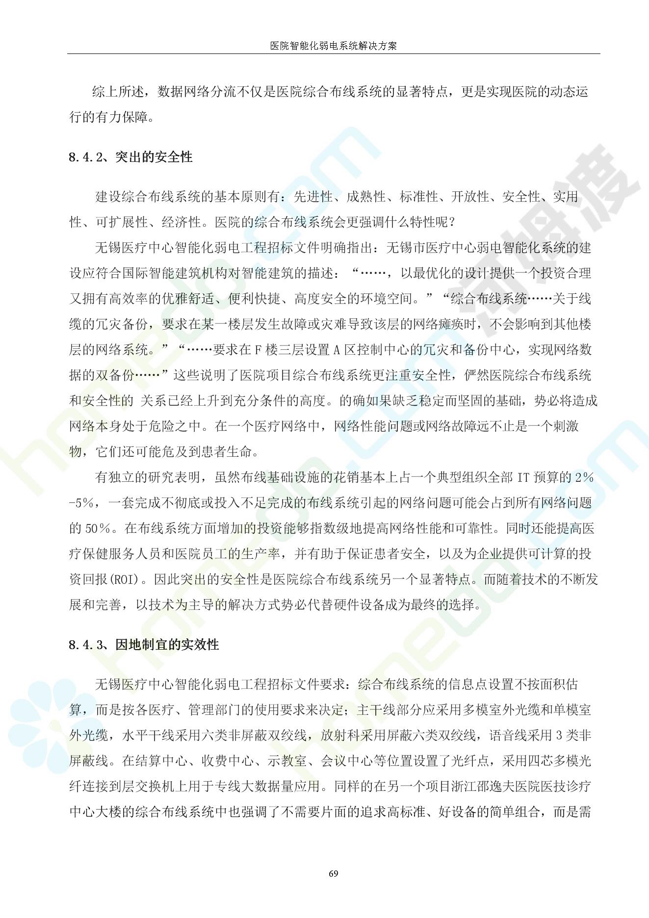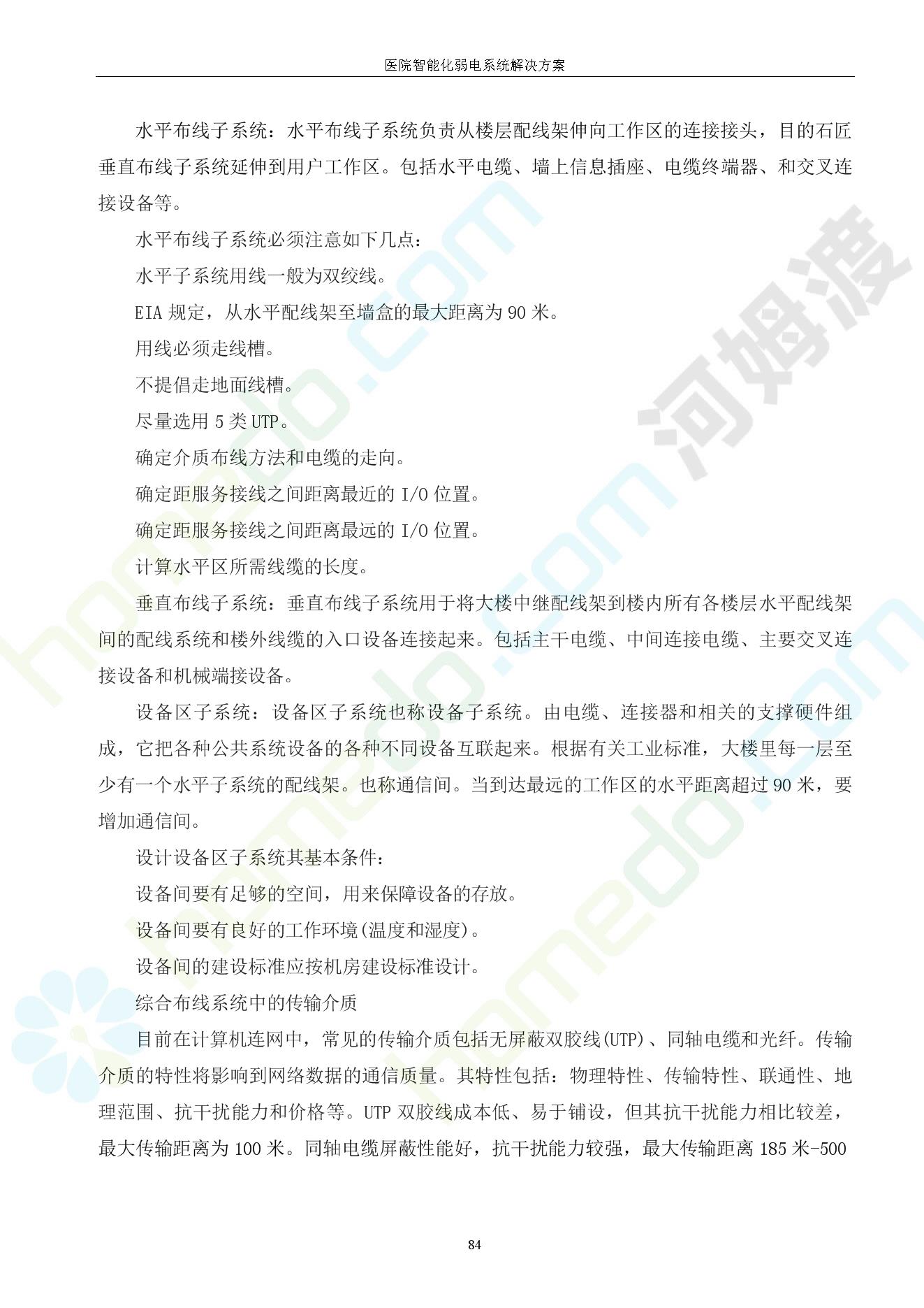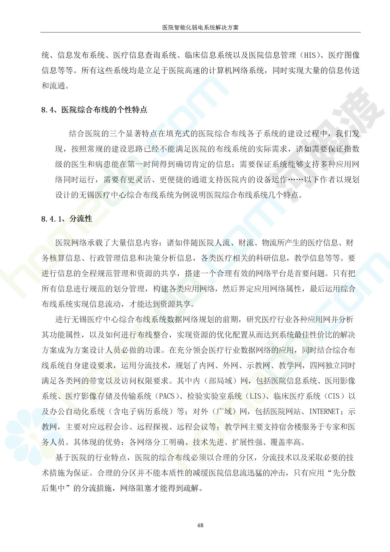 方案简介 由于智能化医院功能复杂,科技含量高,它的设计涉及到建筑学、 护理学、卫生学、生物学工程学等科学领域,加之医学发展快,与各种现代的高新技术相互渗透和结合,都影响医院的功能布局的设计