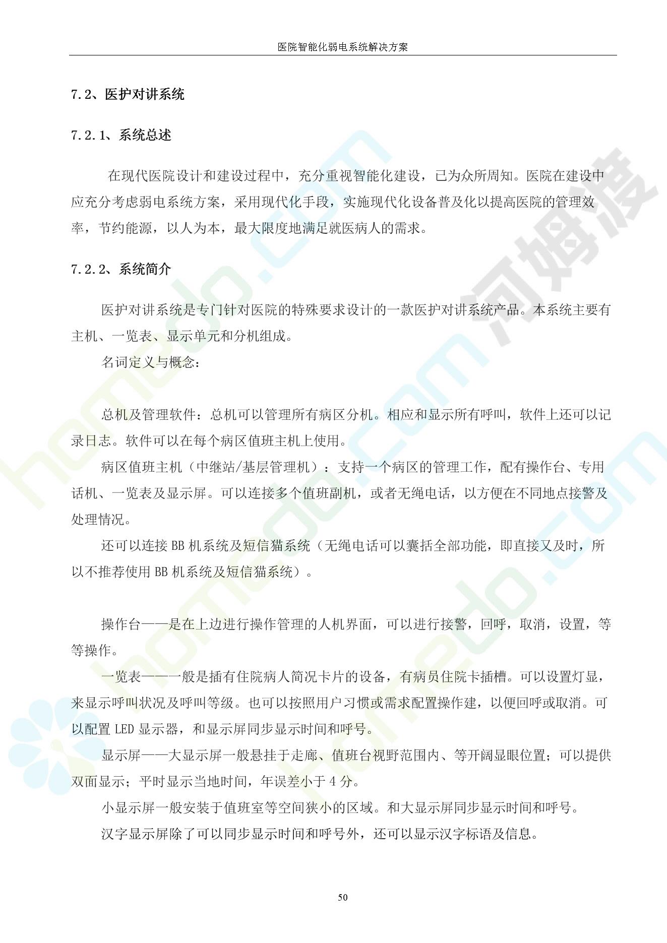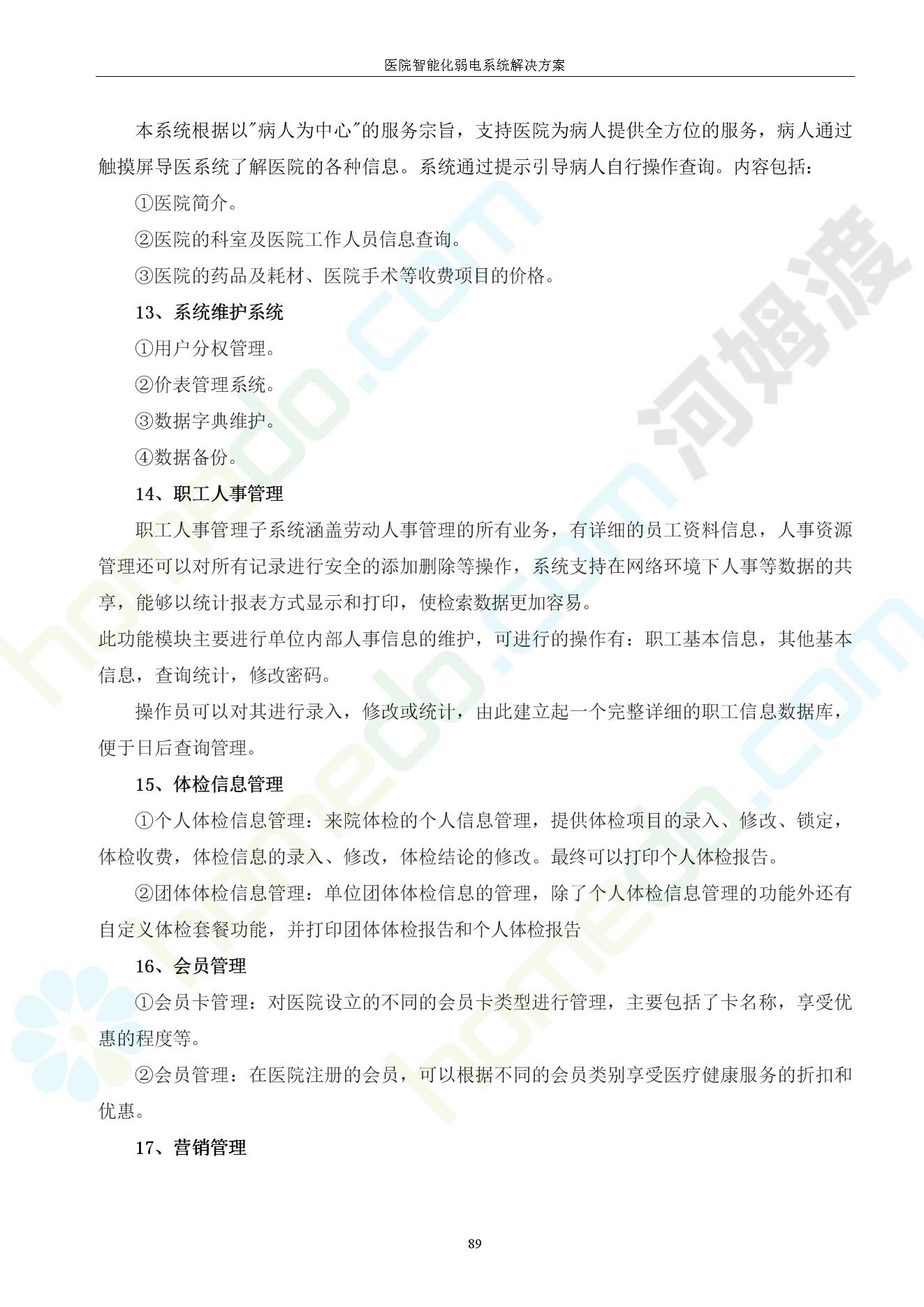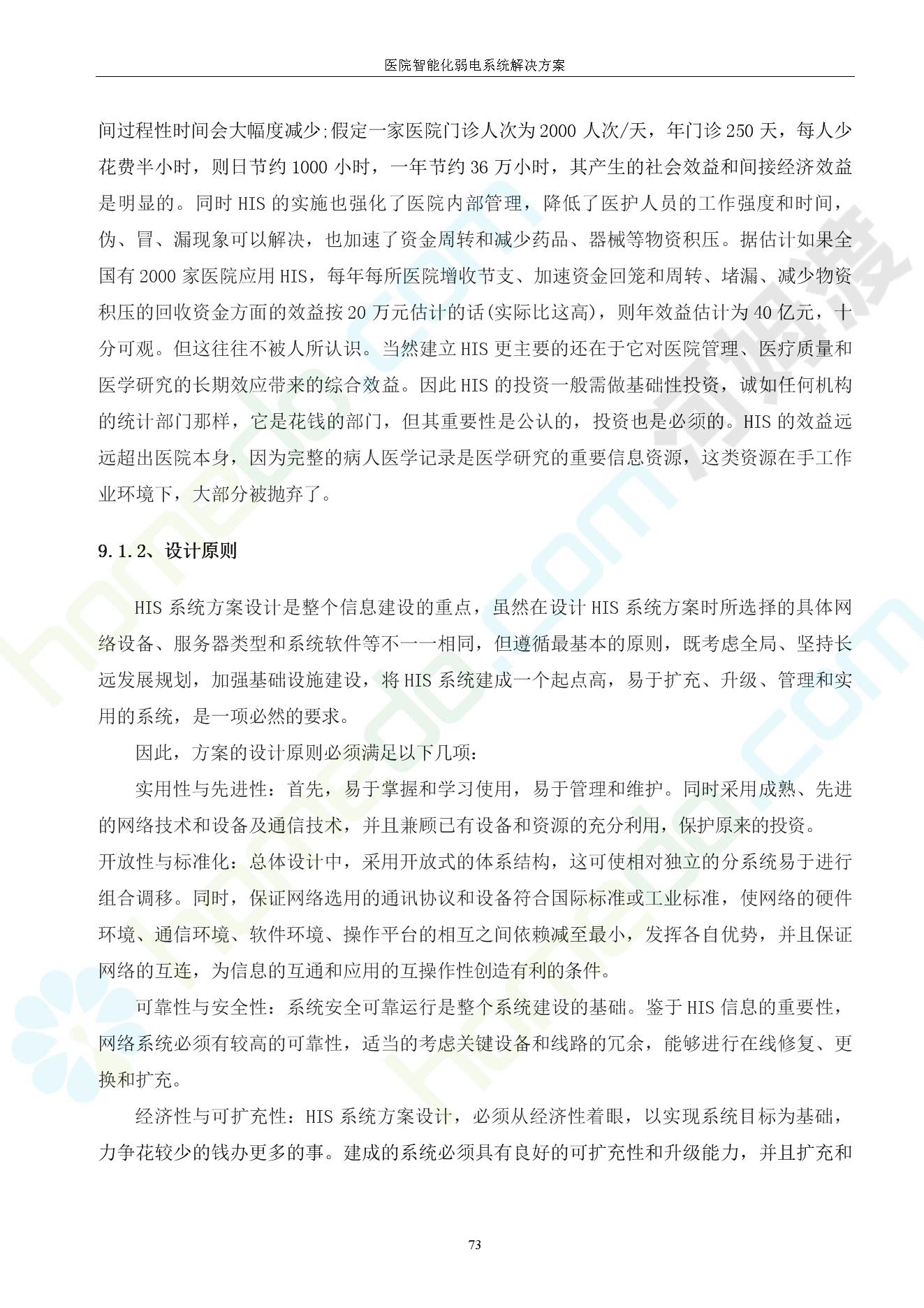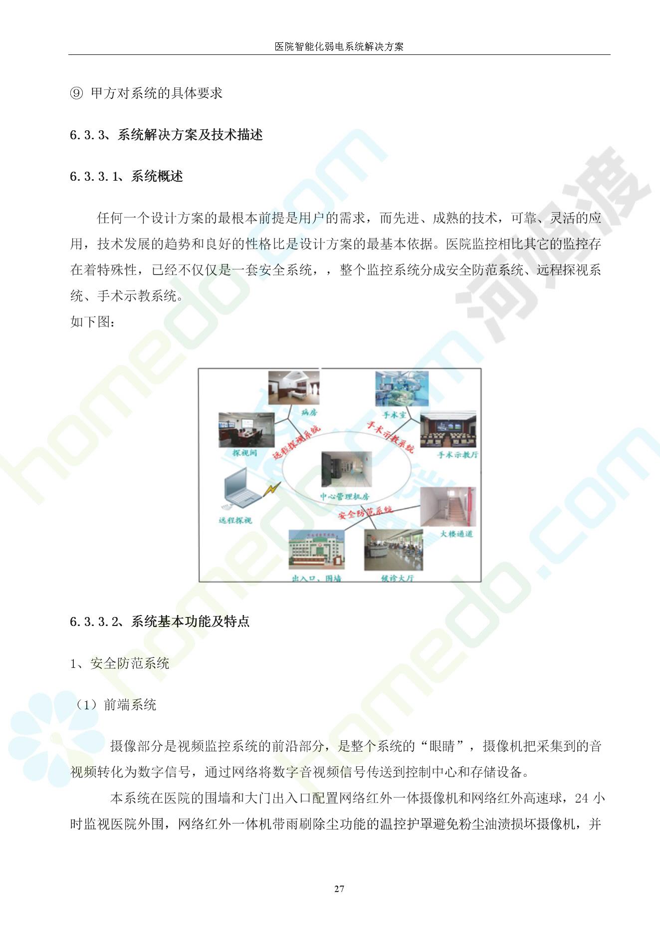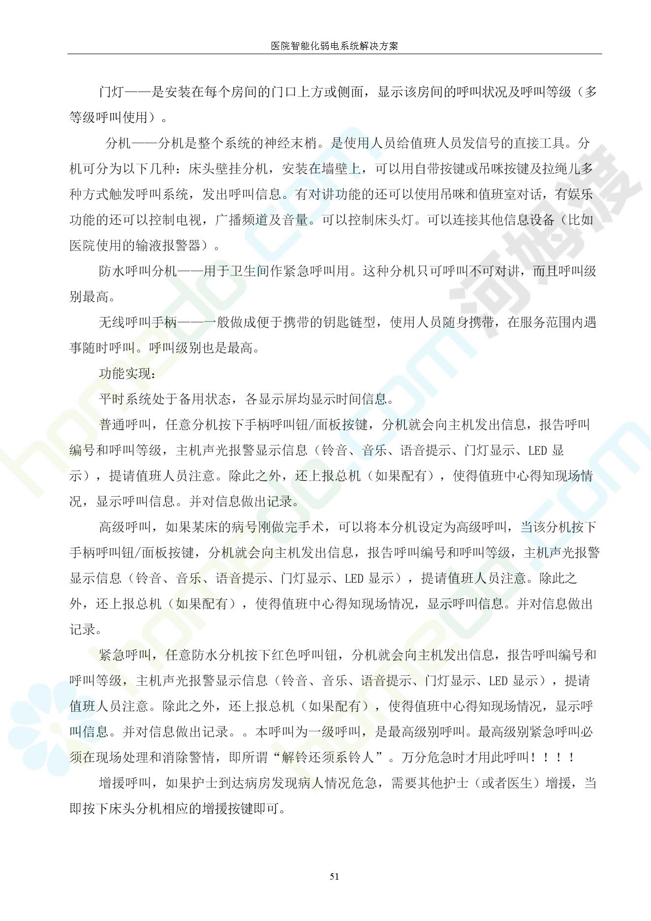 方案简介 由于智能化医院功能复杂,科技含量高,它的设计涉及到建筑学、 护理学、卫生学、生物学工程学等科学领域,加之医学发展快,与各种现代的高新技术相互渗透和结合,都影响医院的功能布局的设计