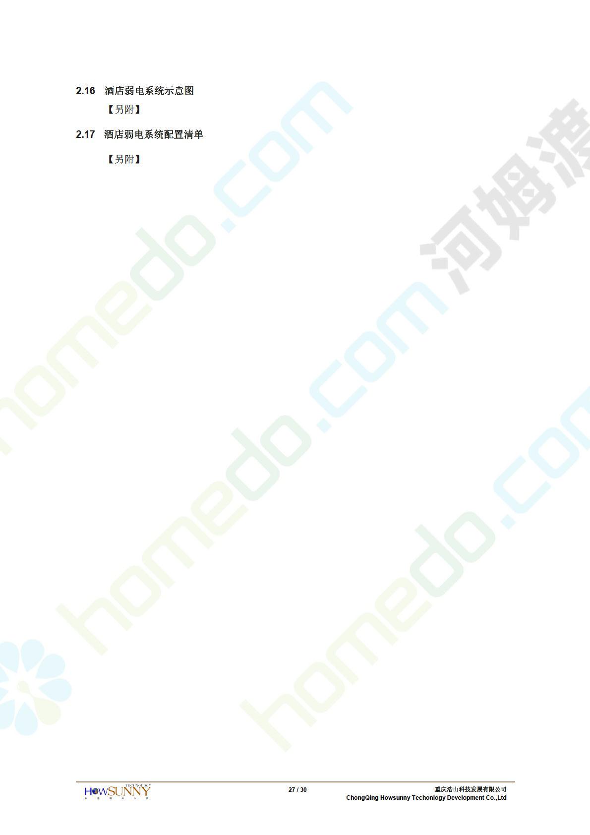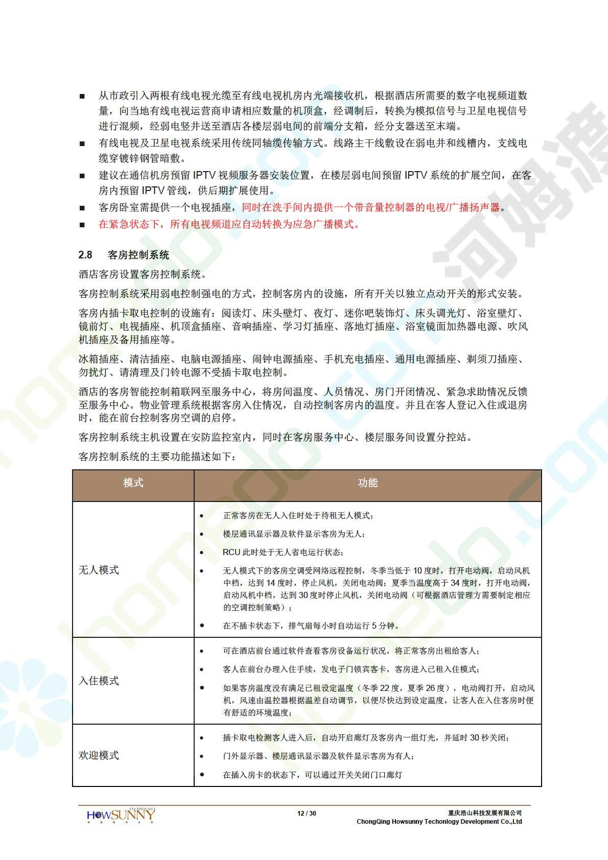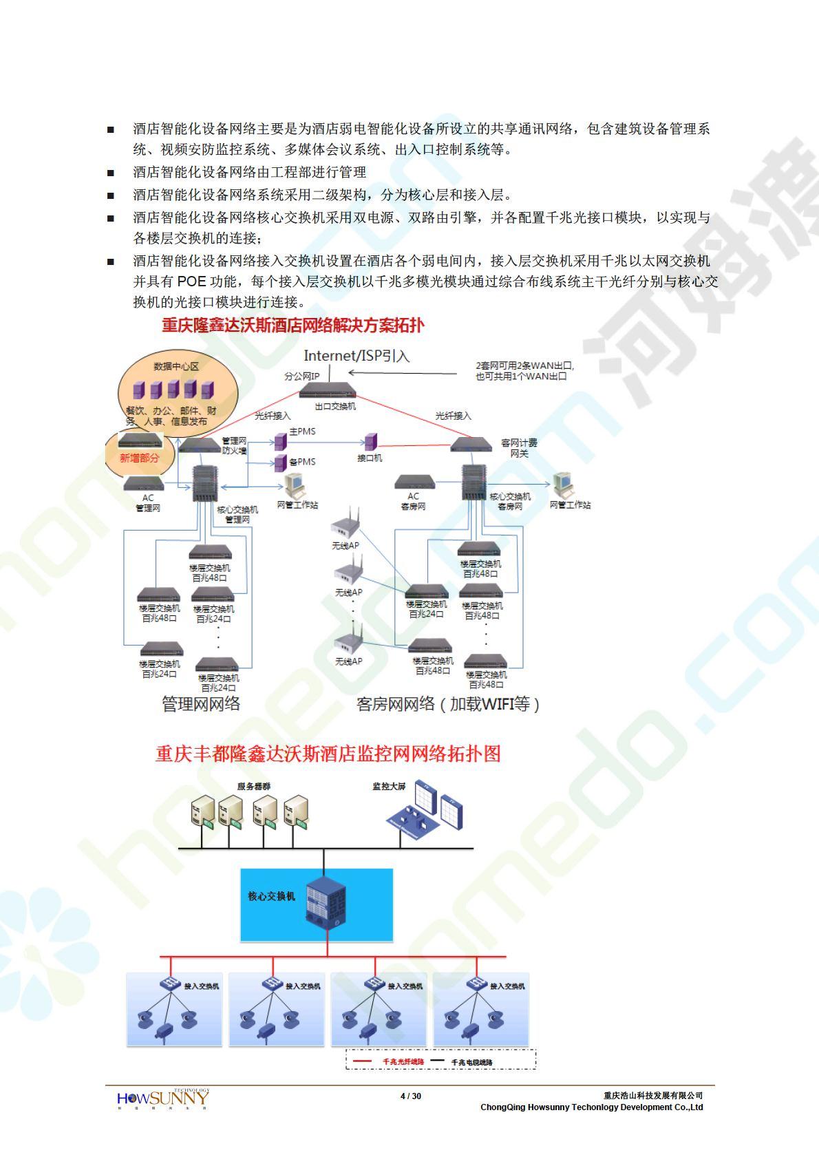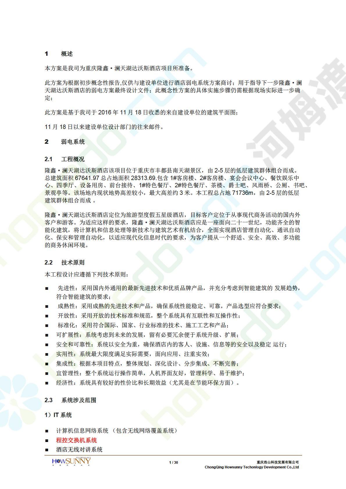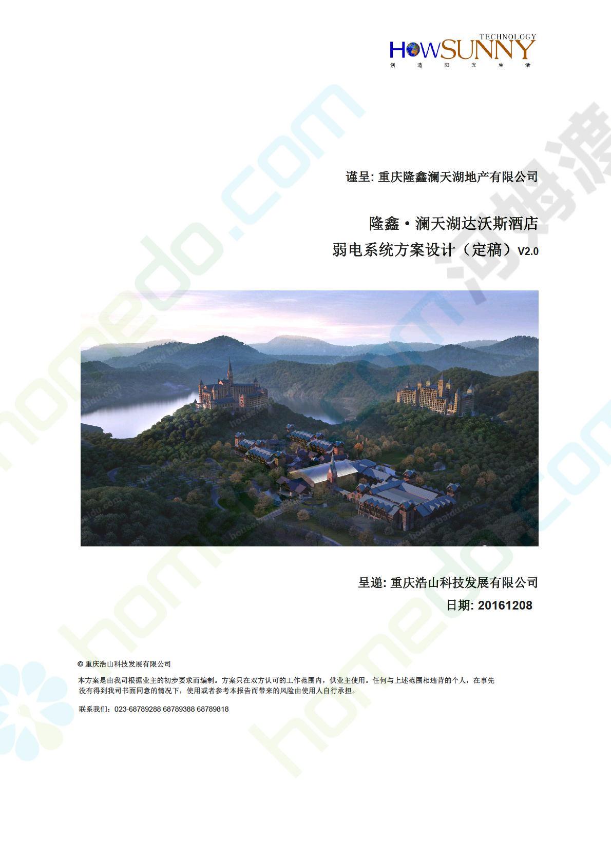 方案简介 隆鑫•澜天湖达沃斯酒店定位为旅游型度假五星级酒店,目标客户定位于从事现代商务活动的国内外客户和游客。为适应这样的要求,隆鑫•澜天湖达沃斯酒店应是一座面向二十一世纪,功能齐全的智能化建筑,将计算机和信息处理等新技术与建筑艺术有机结合,全面实现酒店管理自动化、通讯自动化、保安和管理自动化,以适应现代化信息时代的要求,为客户提从一个舒适、安全、高效、多功能的商务休闲环境。