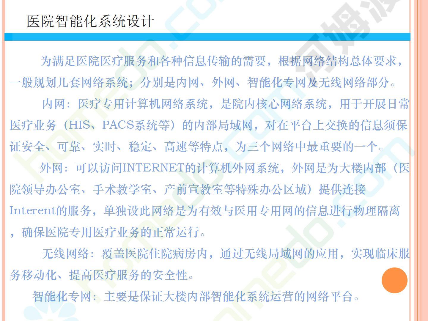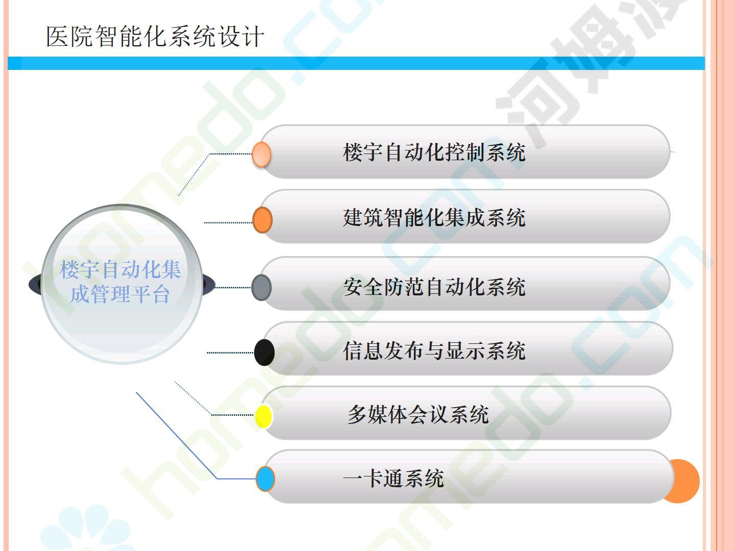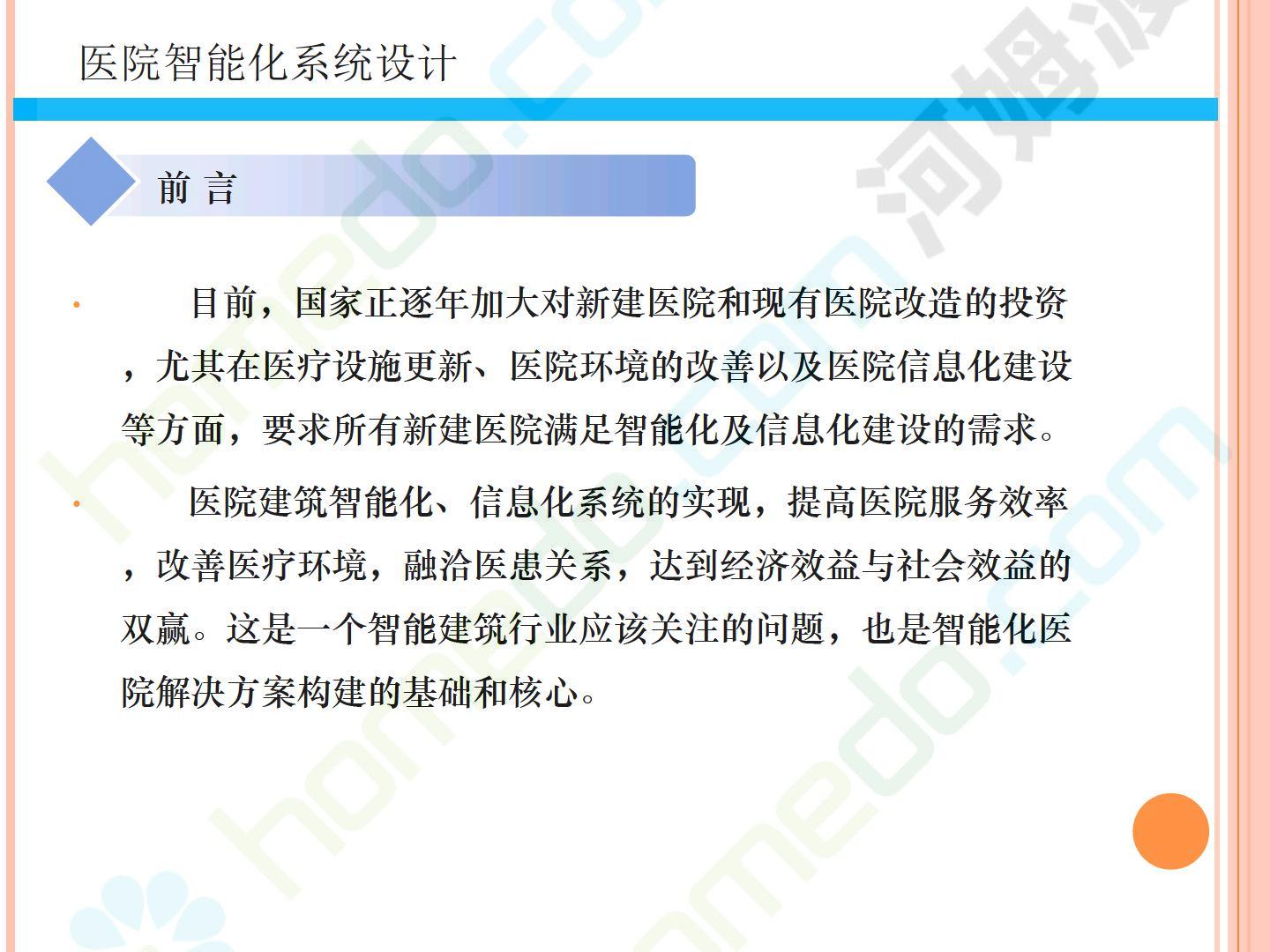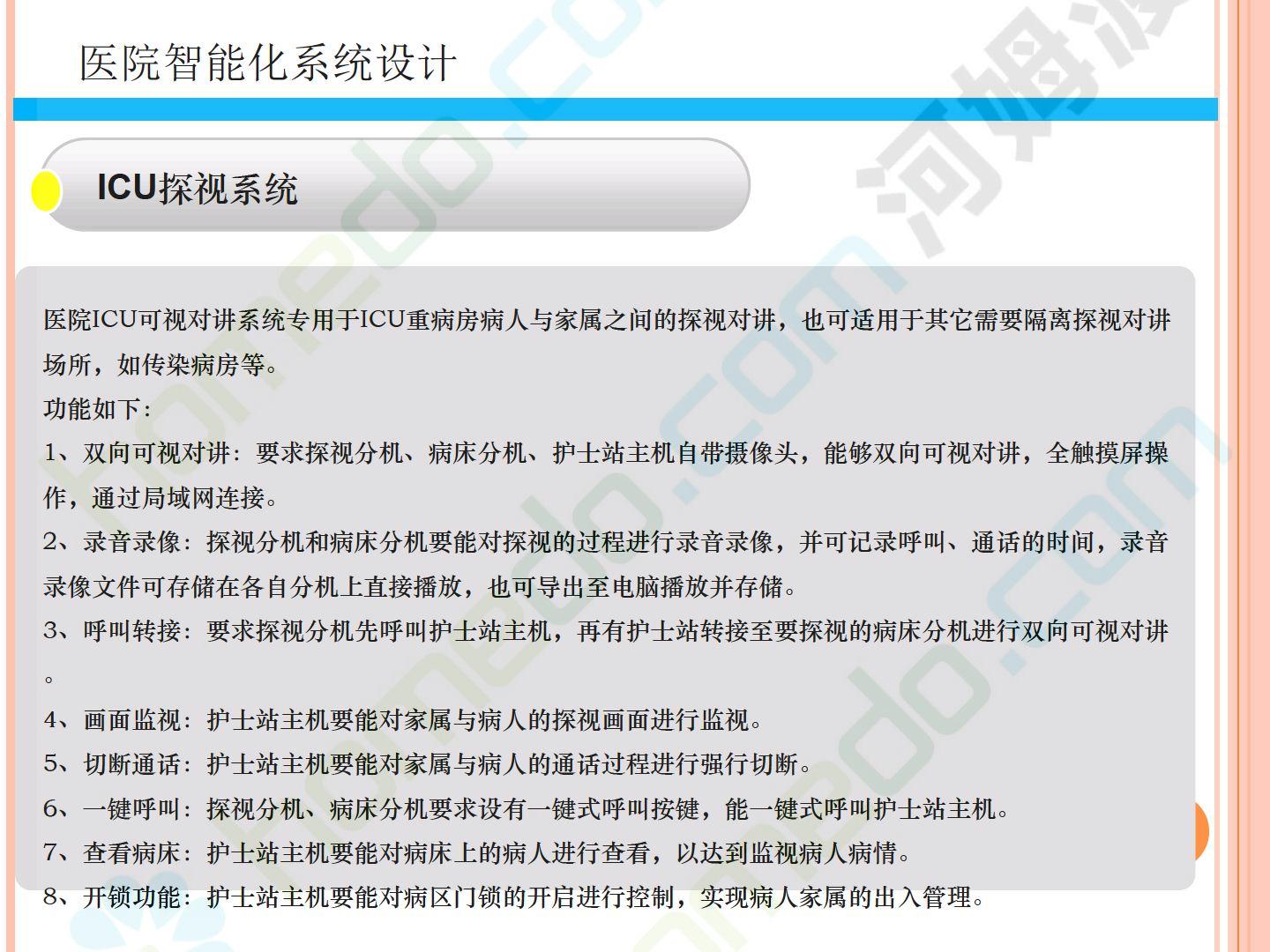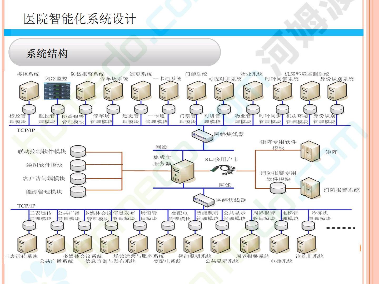 方案简介 医院建筑智能化、信息化系统的实现,提高医院服务效率,改善医疗环境,融洽医患关系,达到经济效益与社会效益的双赢。这是一个智能建筑行业应该关注的问题,也是智能化医院解决方案构建的基础和核心。