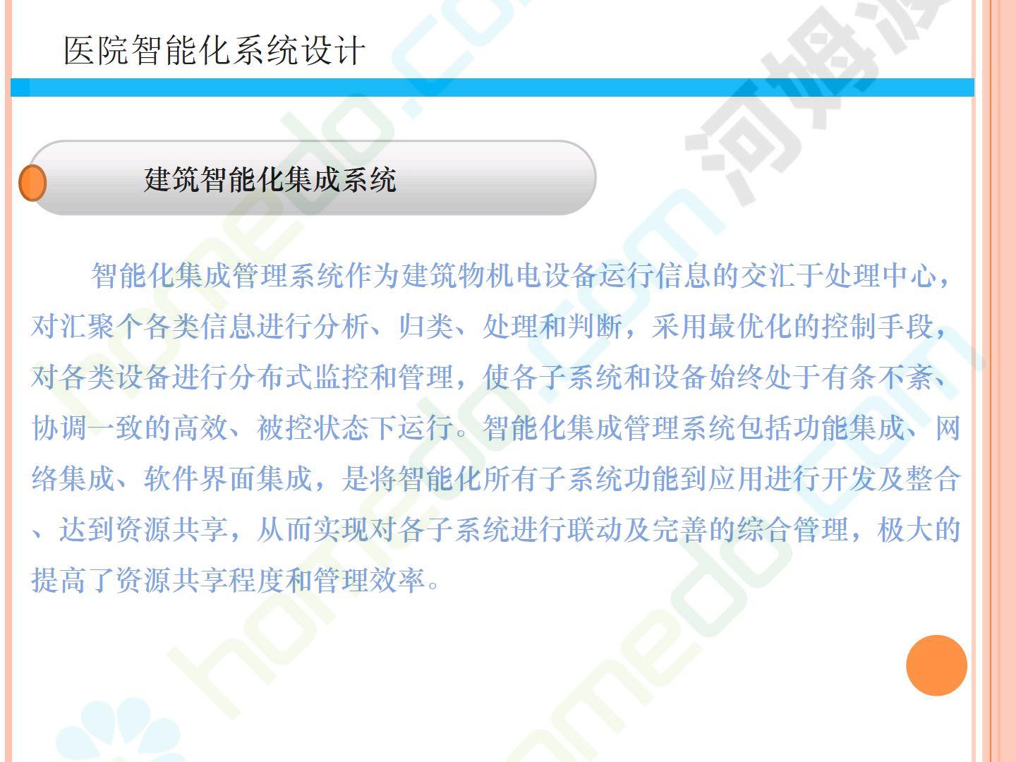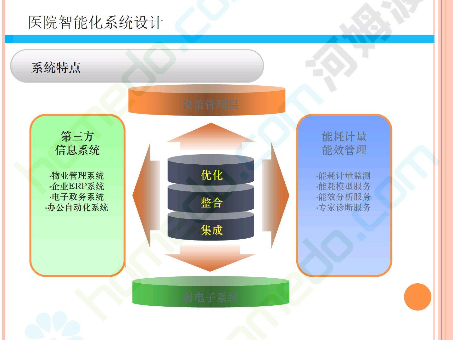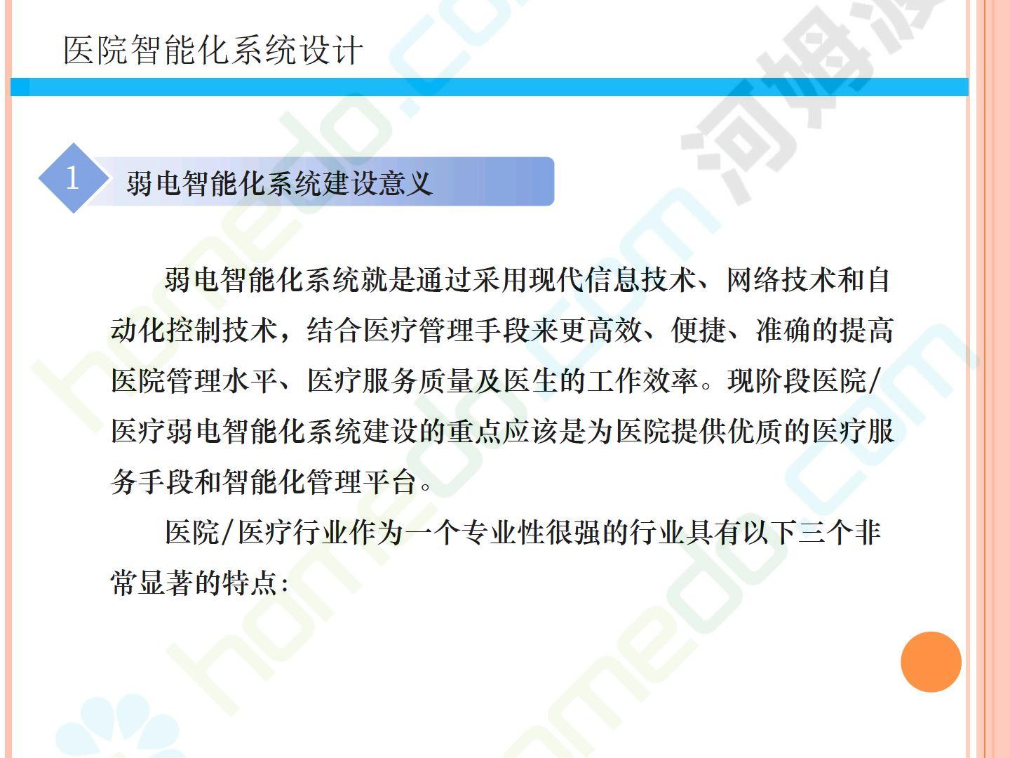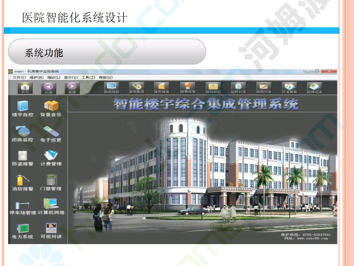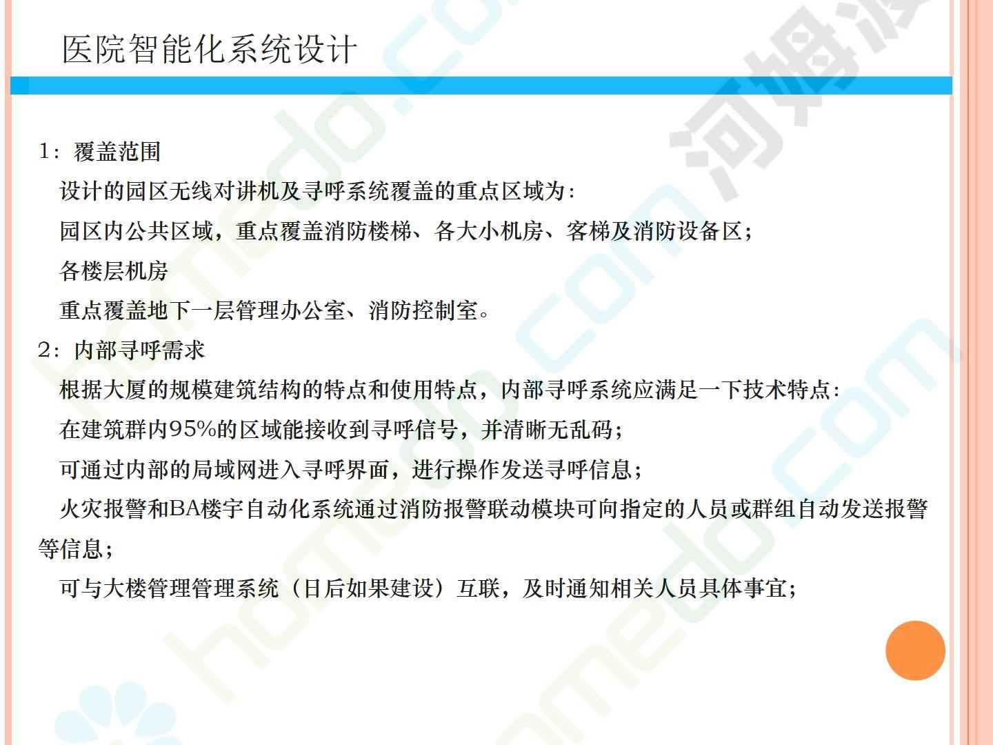 方案简介 医院建筑智能化、信息化系统的实现,提高医院服务效率,改善医疗环境,融洽医患关系,达到经济效益与社会效益的双赢。这是一个智能建筑行业应该关注的问题,也是智能化医院解决方案构建的基础和核心。