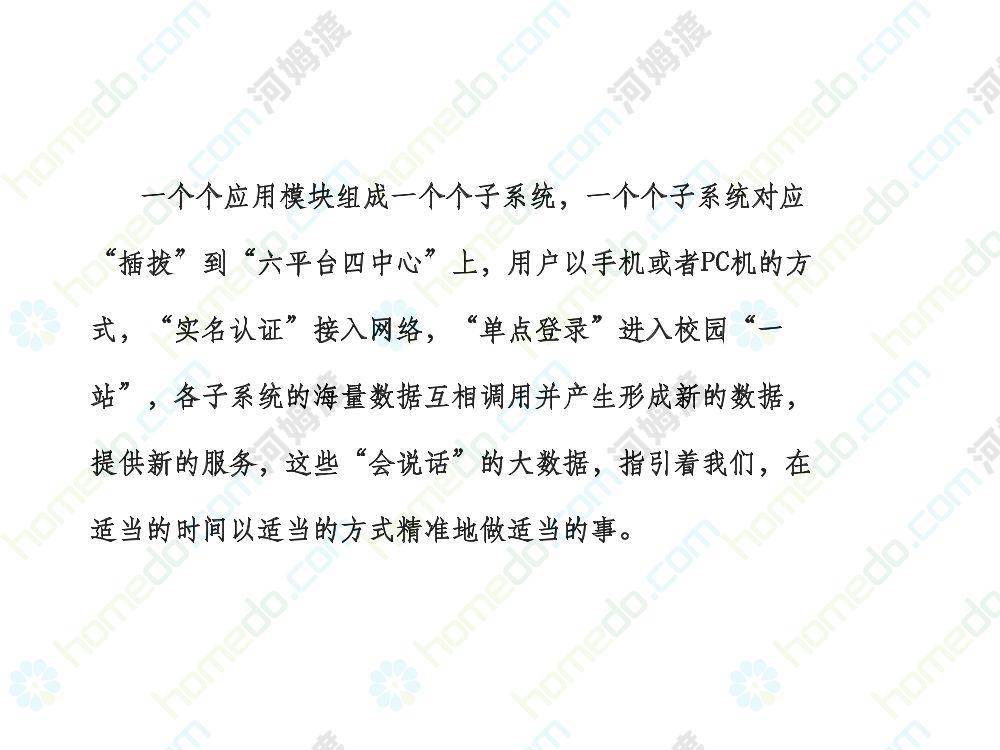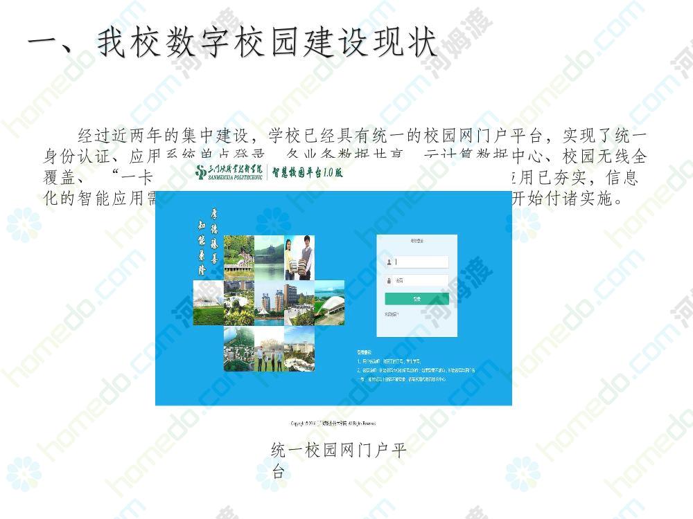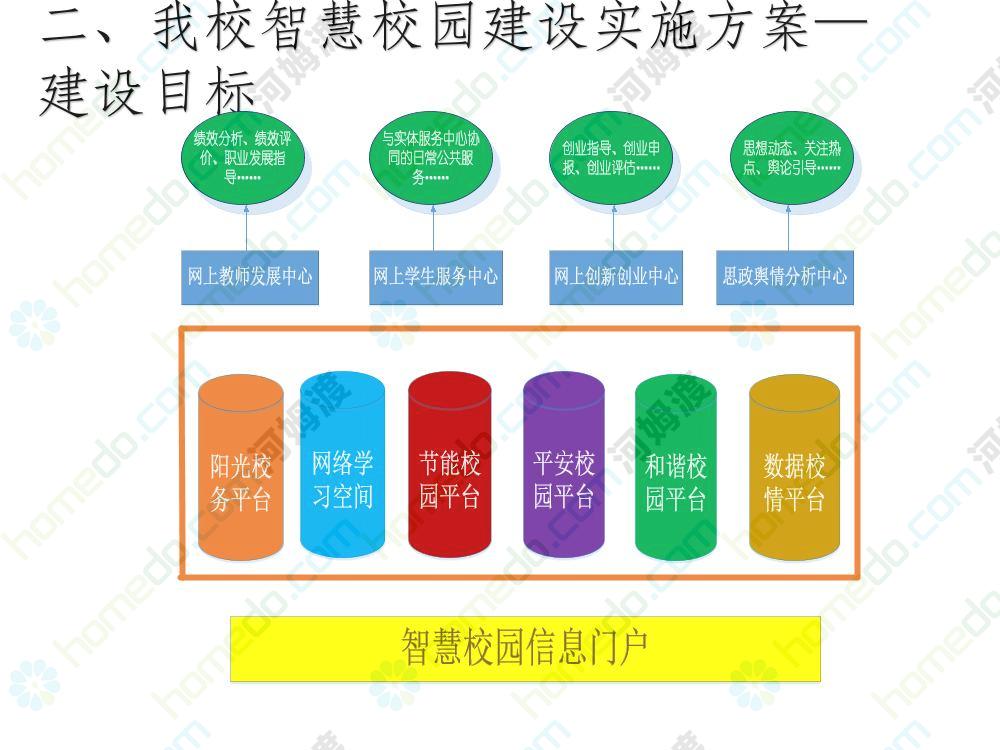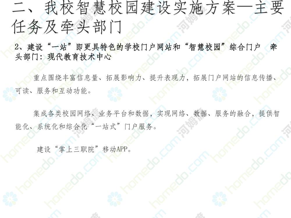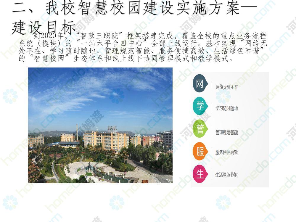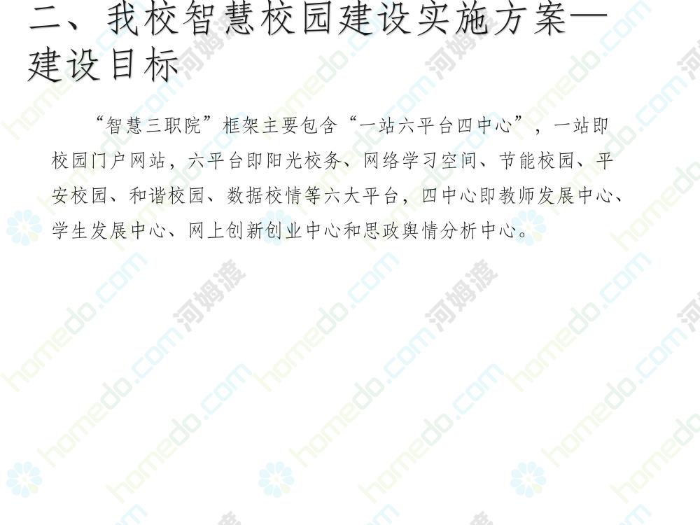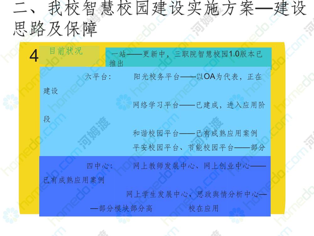 方案简介 本方案为智慧校园建设方案简介PPT,主要内容为“智慧三职院”“一站六平台四中心”介绍,一站即校园门户网站,六平台即阳光校务、网络学习空间、节能校园、平安校园、和谐校园、数据校情等六大平台,四中心即教师发展中心、学生发展中心、网上创新创业中心和思政舆情分析中心。