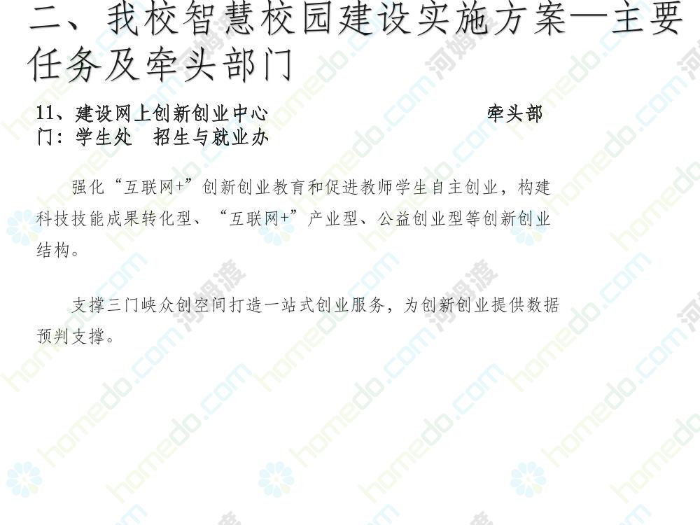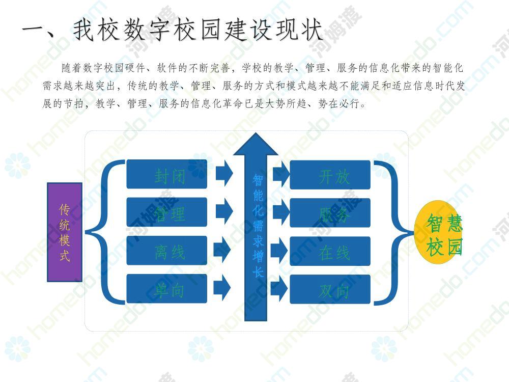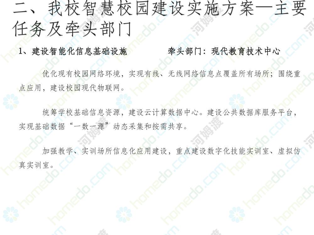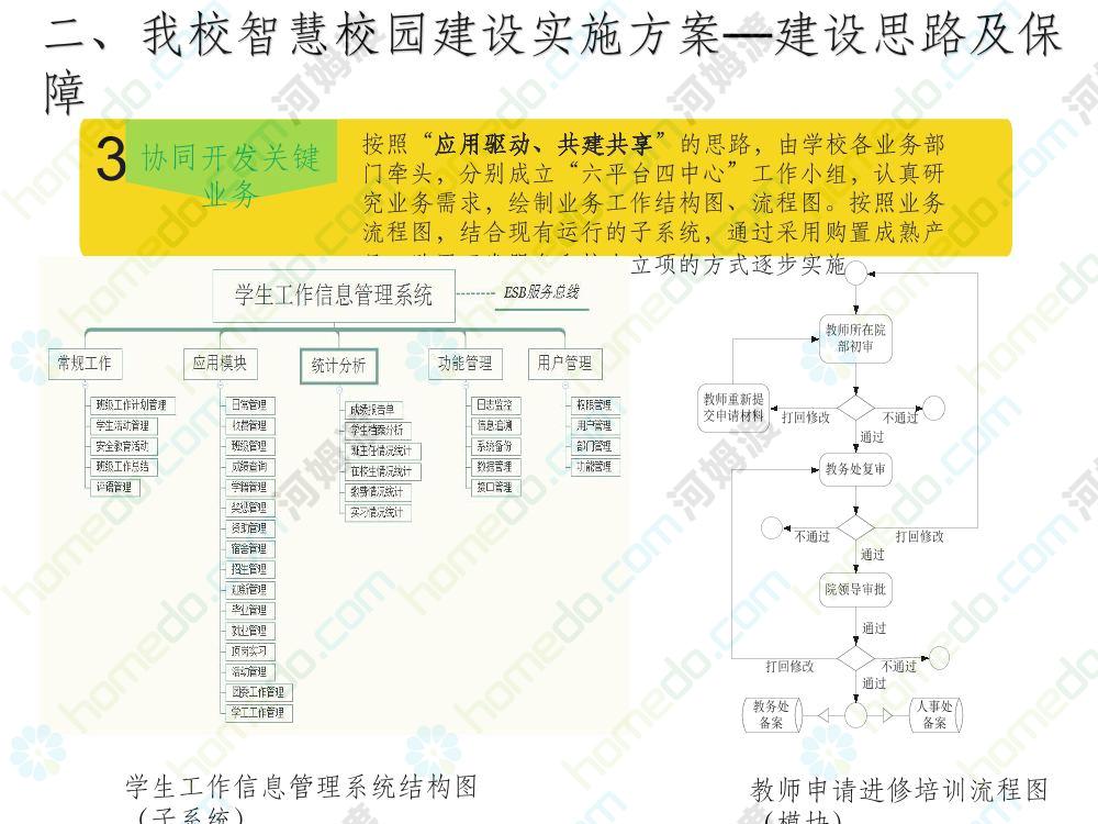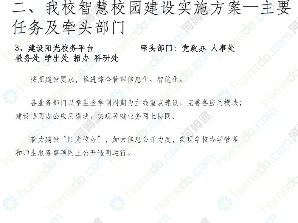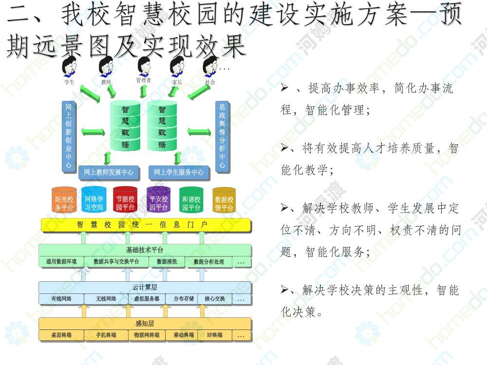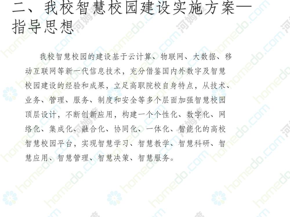 方案简介 本方案为智慧校园建设方案简介PPT,主要内容为“智慧三职院”“一站六平台四中心”介绍,一站即校园门户网站,六平台即阳光校务、网络学习空间、节能校园、平安校园、和谐校园、数据校情等六大平台,四中心即教师发展中心、学生发展中心、网上创新创业中心和思政舆情分析中心。