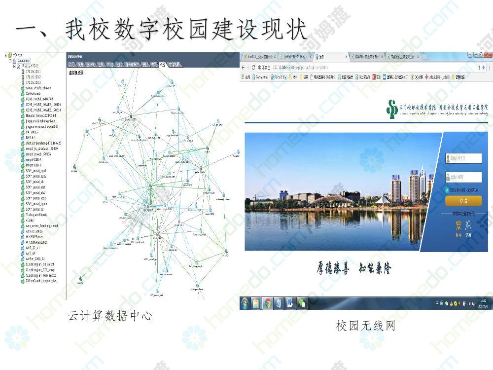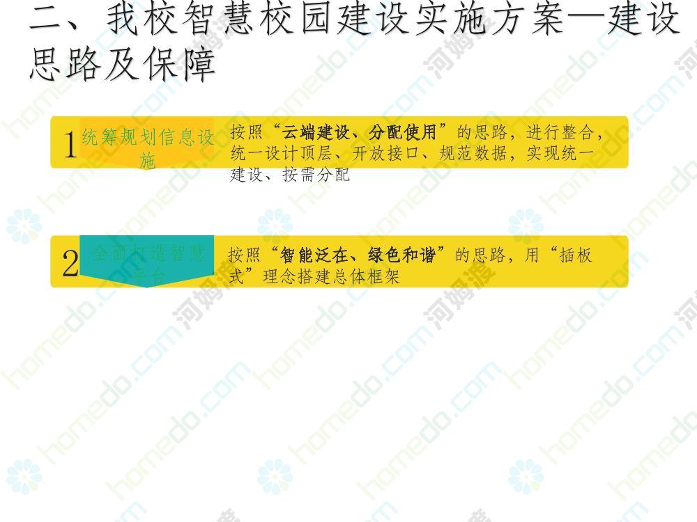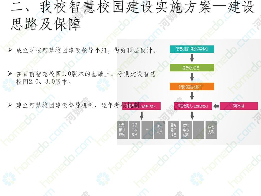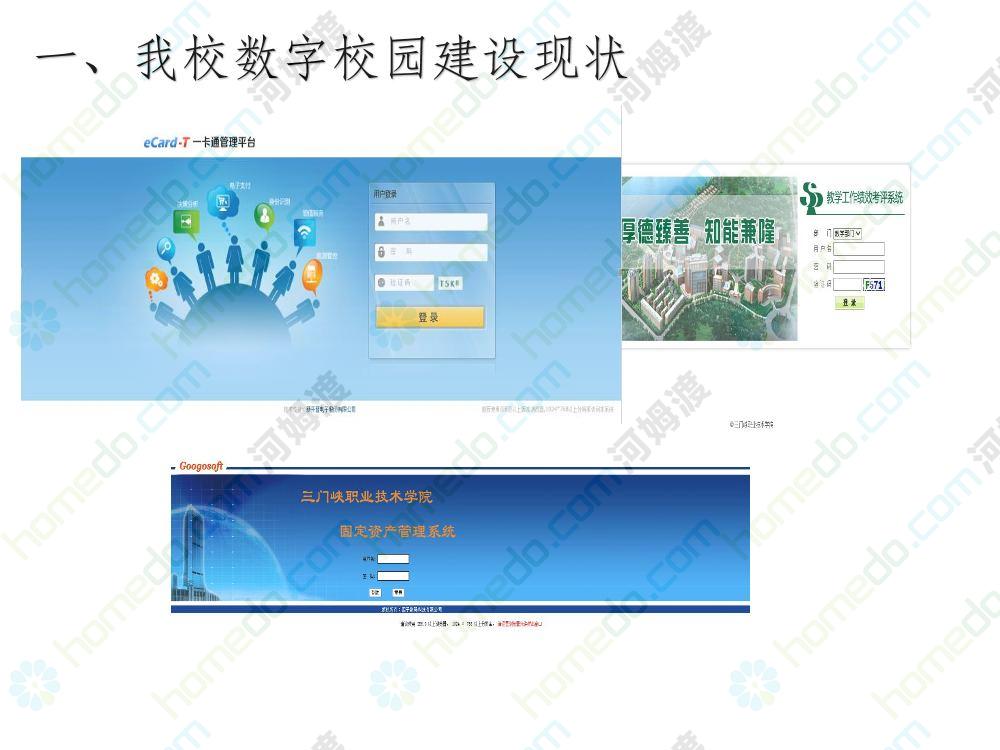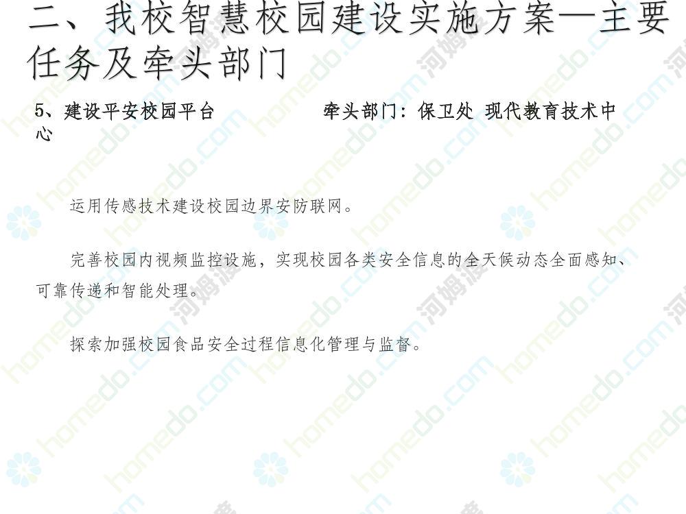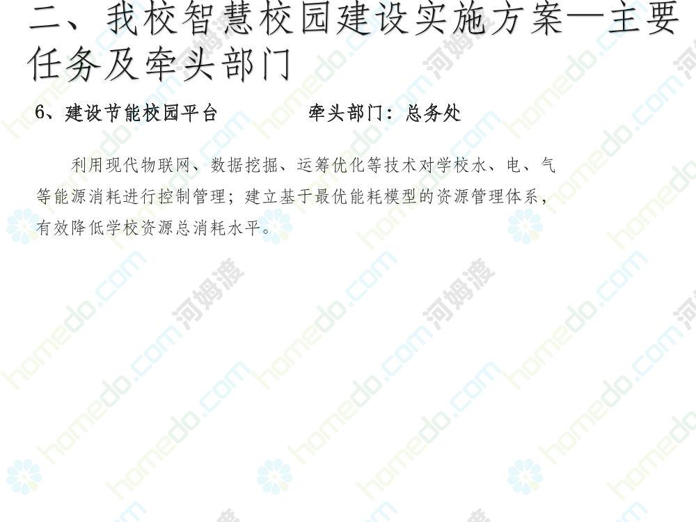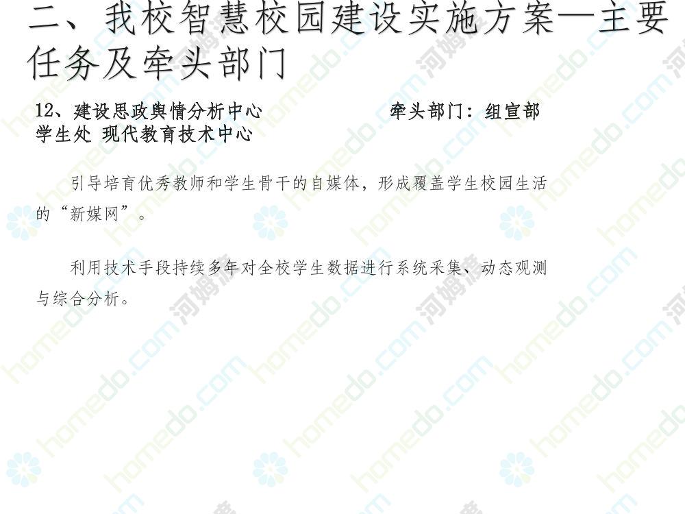 方案简介 本方案为智慧校园建设方案简介PPT,主要内容为“智慧三职院”“一站六平台四中心”介绍,一站即校园门户网站,六平台即阳光校务、网络学习空间、节能校园、平安校园、和谐校园、数据校情等六大平台,四中心即教师发展中心、学生发展中心、网上创新创业中心和思政舆情分析中心。