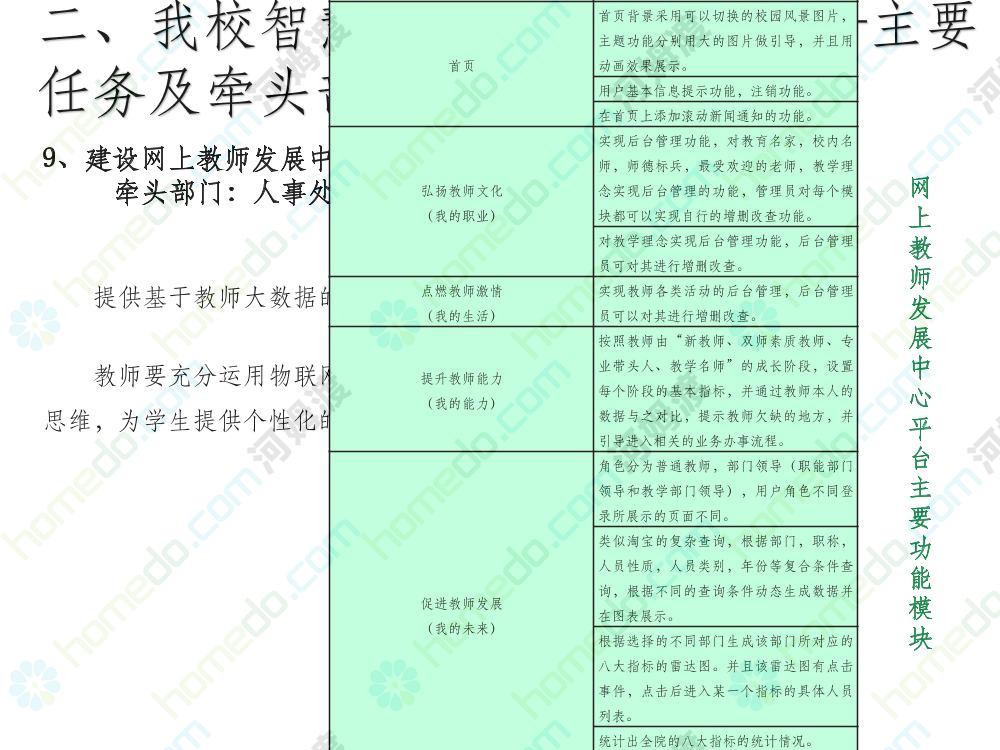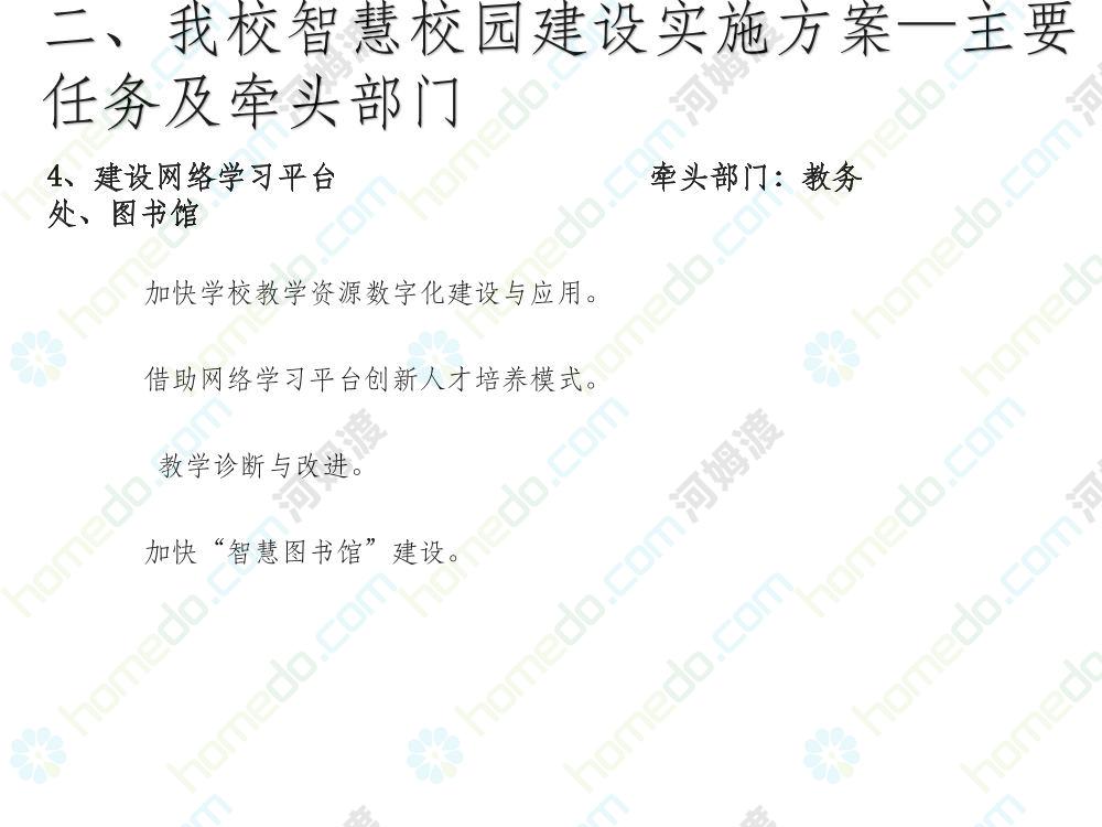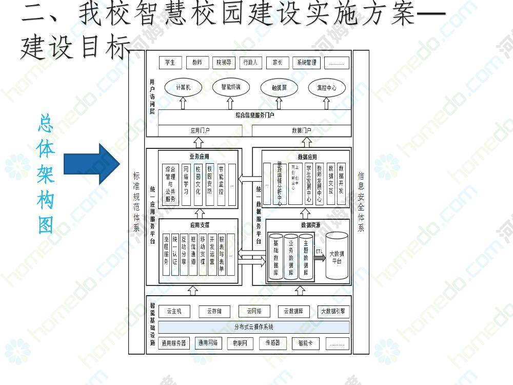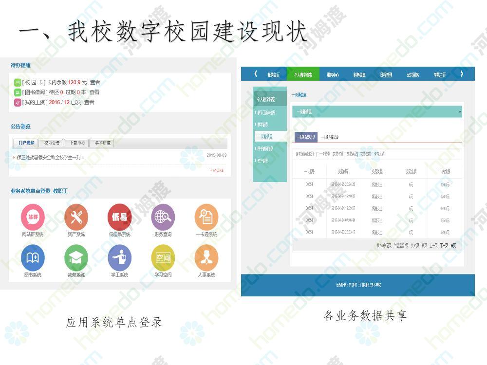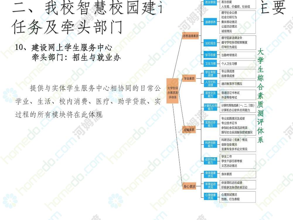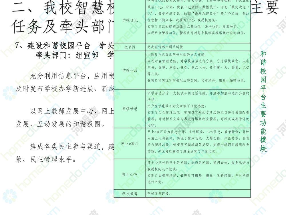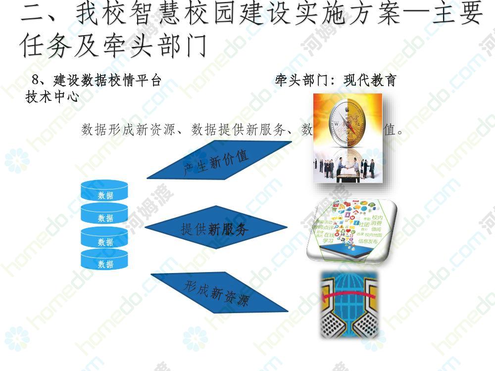方案简介 本方案为智慧校园建设方案简介PPT,主要内容为“智慧三职院”“一站六平台四中心”介绍,一站即校园门户网站,六平台即阳光校务、网络学习空间、节能校园、平安校园、和谐校园、数据校情等六大平台,四中心即教师发展中心、学生发展中心、网上创新创业中心和思政舆情分析中心。