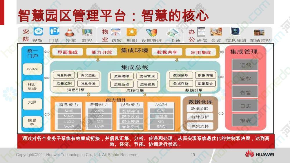 方案简介 传统园区建设者对于园区建设只做到九通一平,即基本的水电气、交通、建筑等基础设施建设,信息化、智能化都由入驻企业自行完成,企业自身投入和维护成本高。 各信息系统相互独立,形成“信息孤岛”,缺乏相应的集成与互联机制,无法支持园区管委会和企业之间的业务流程。缺少支持园区管理的基础性信息化应用,更缺乏个性化的企业信息化应用。本方案包括园区的现状及发展及华为团队对园区信息化建设的理解,包含多个经典案例分析和系统拓扑图,是学习园区建设的重要参考资料