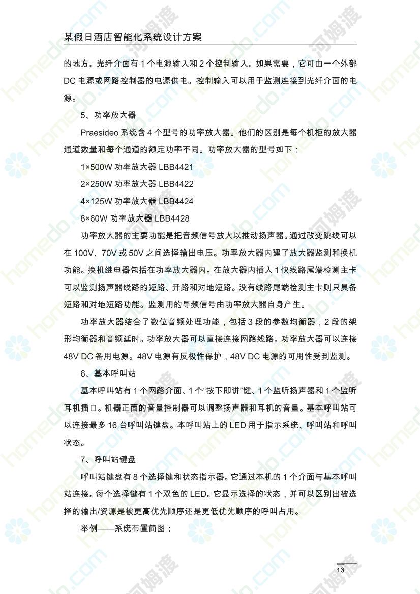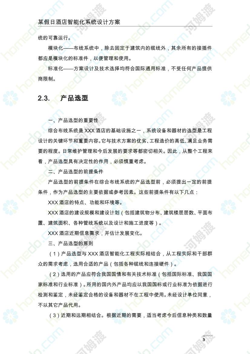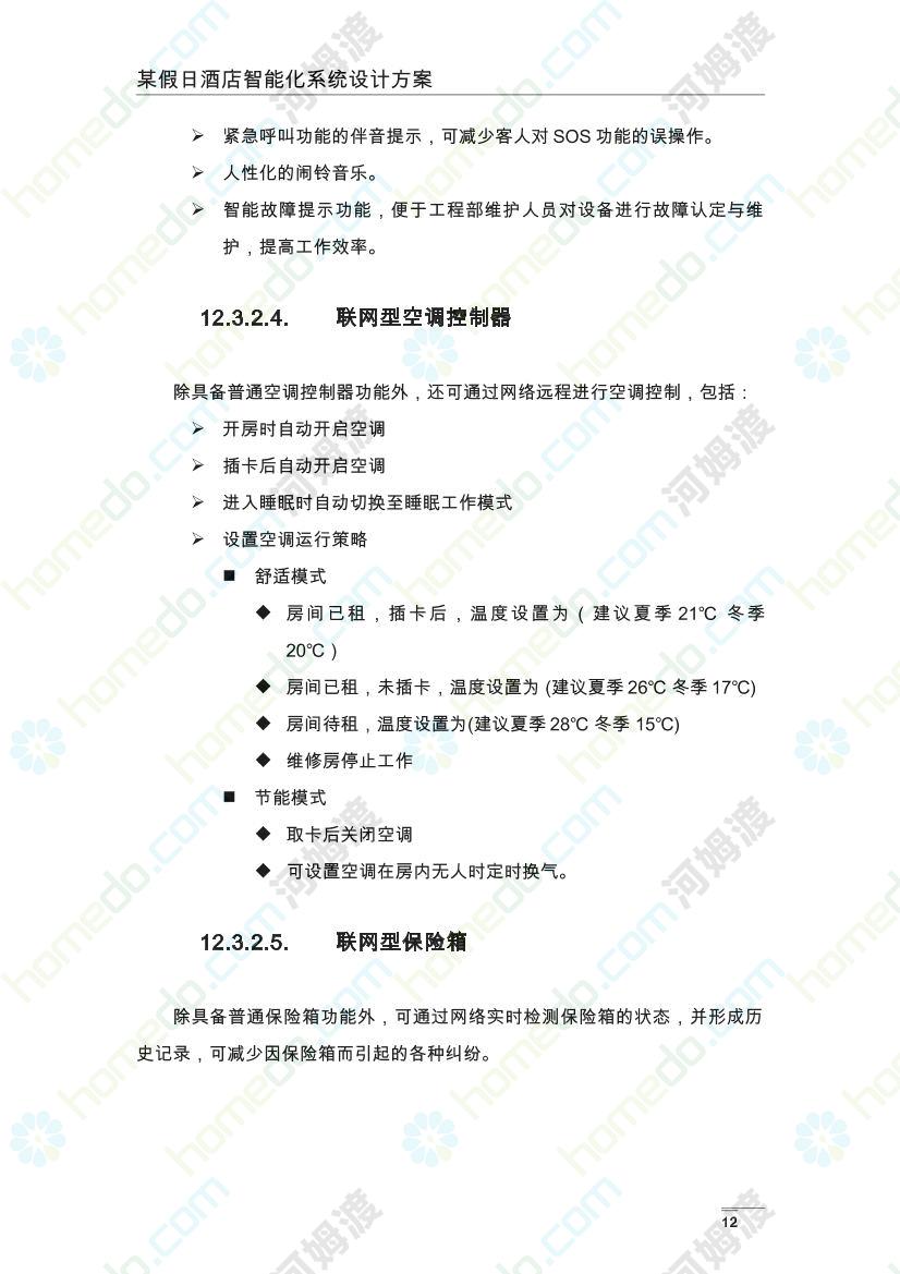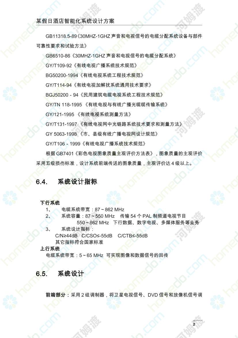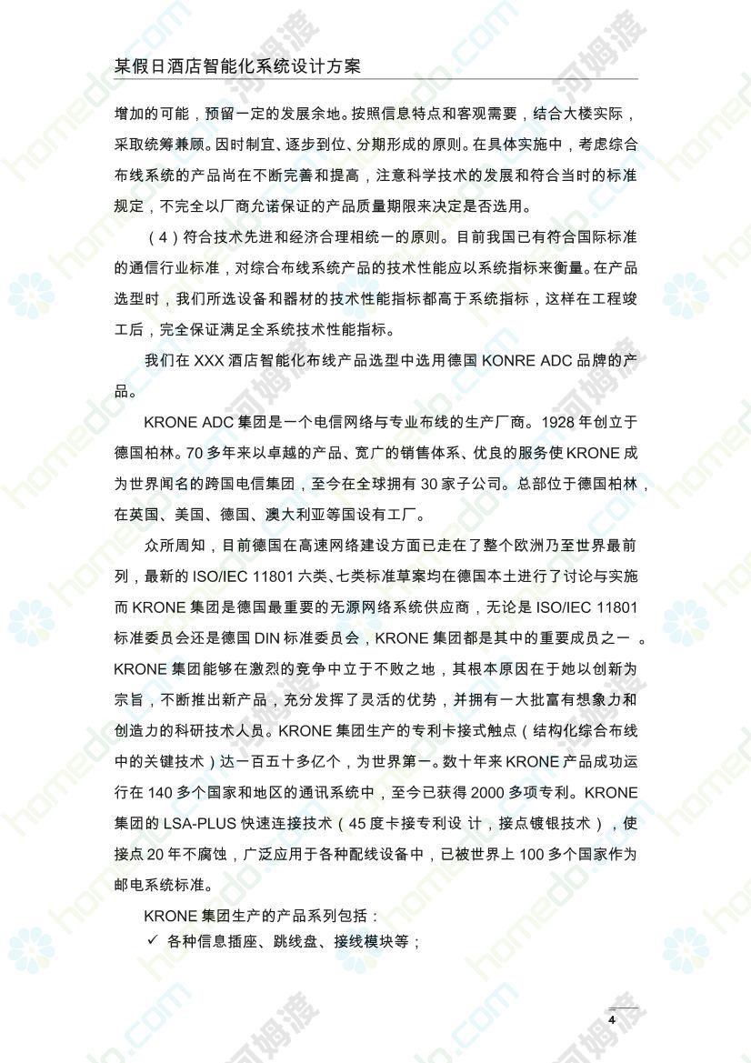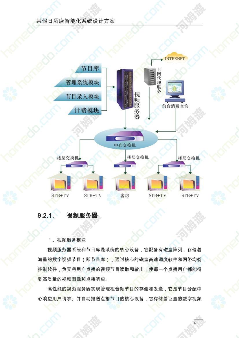 方案简介 酒店是一座集会议、娱乐、餐饮、休闲度假及商业服务的五星级专业酒店。针对酒店智能化系统工程的要求,为了适应娱乐业、餐饮业、休闲旅游业及商业服务业的发展,为客人提供更优质、更舒适、更快捷的服务;为提高酒店内部的管理效率和提升酒店的形象,结合我公司在酒店行业多年的设计及施工经验,就酒店智能系统工程建设我公司提供以下设计内容。 1)综合布线系统; 2)计算机网络系统; 3)楼宇自控系统 4)数字程控交换机系统 5)保安闭路监控系统; 6)背景音乐及公共广播系统; 7)VOD视频点播系统; 8)酒店信息管理系统; 9)信息公告系; 10)一卡通管理系统; 11) 机房工程