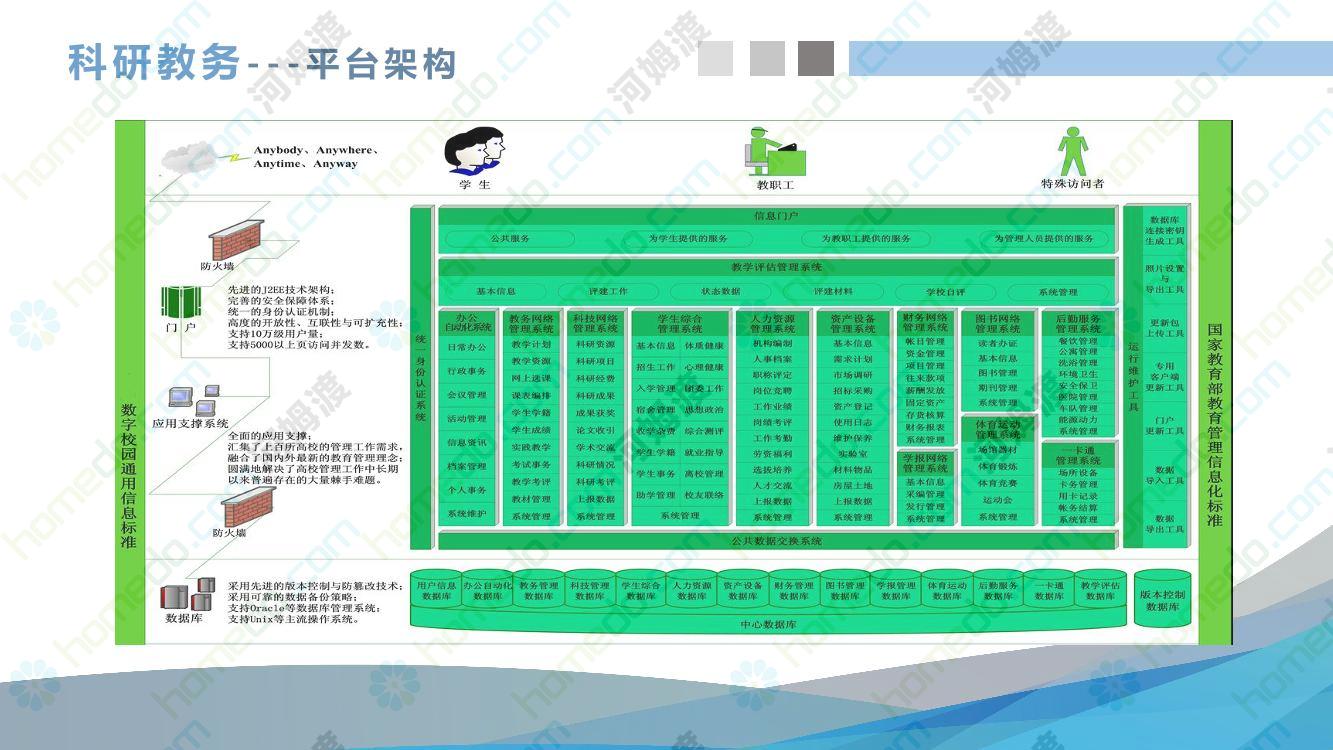 方案简介 工程概况:项目计划总投资约 21.6 亿元,占地约 1000 亩, 总建筑面积 约 40.8 万平方米。 方案介绍:以建筑为平台,将通信自动化(CA),办公自动化(OA),楼宇自动化(BA)、安防自动化(SA)四大功能结合起来。 设计亮点:经济性(与金融机构对接)、先进性(5G+全息投影技术)、便捷性(无人值守运维)。 设计难点:校园信息化(基础管理平台)与校园智能化结合,突出学校特色,提高教学质量。 解决的实际问题:无人值守运维管理、新能源汽车充电管理、无线网络计费认证。 采用的新技术:5G+全息投影技术、人工智能(机器人接待及运维值守)。