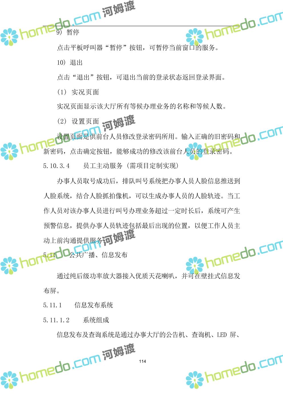 方案简介 第五章 政务服务中心信息化建设方案:计算机网络系统、网络安全系统、综合布线系统 音视频监控系统 、排队叫号评价系统、公共广播、信息发布、 LED 宣传屏、会议室显示、音响系统、中心机房系统 (含等保测评)、 WiFi 覆盖、 智慧政务大厅综合管理平台、感知融合赋能平台、数字政府监管平台建设 第六章 工程方案:建筑方案、结构、给排水、供电、 通风及空调、弱电、燃气等工程 第七章 节水节能措施 第八章 环境影响评价